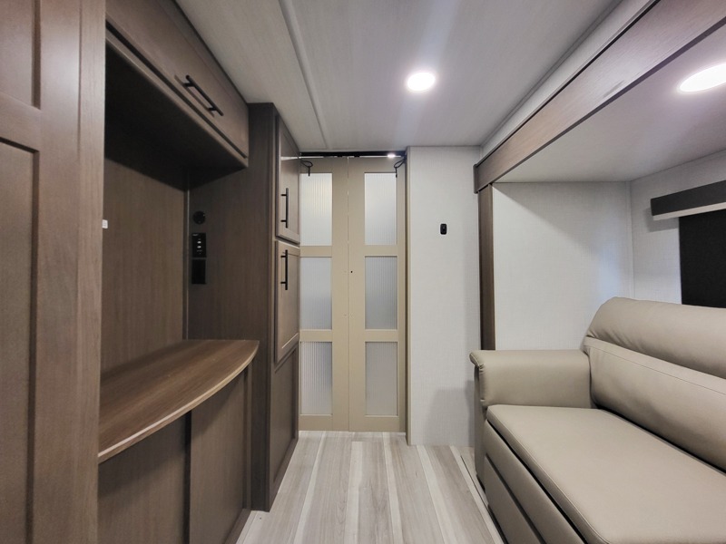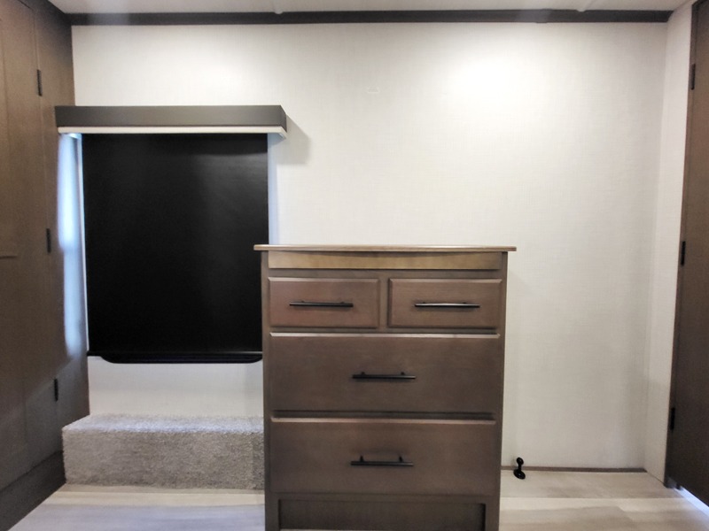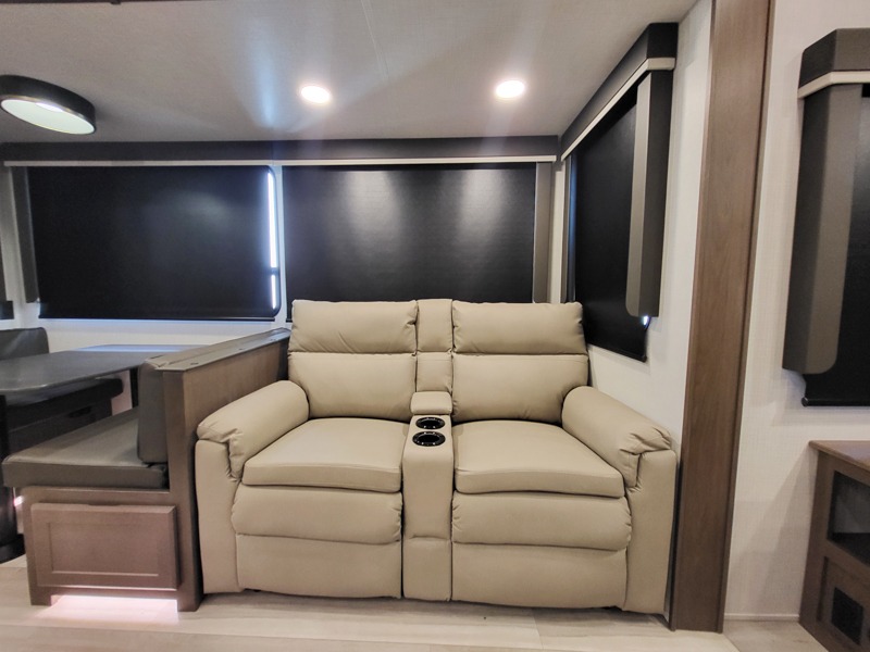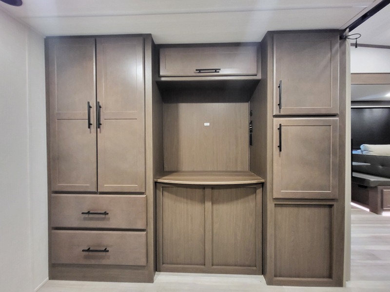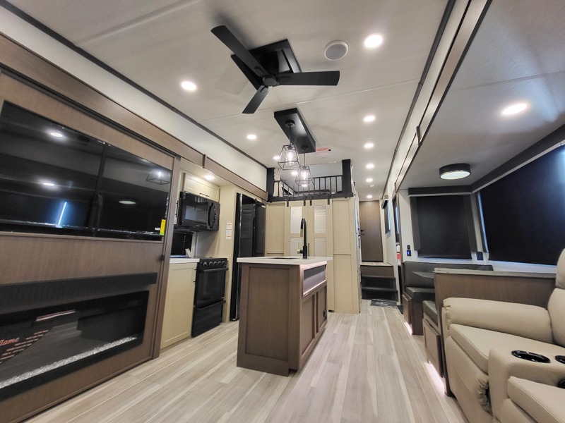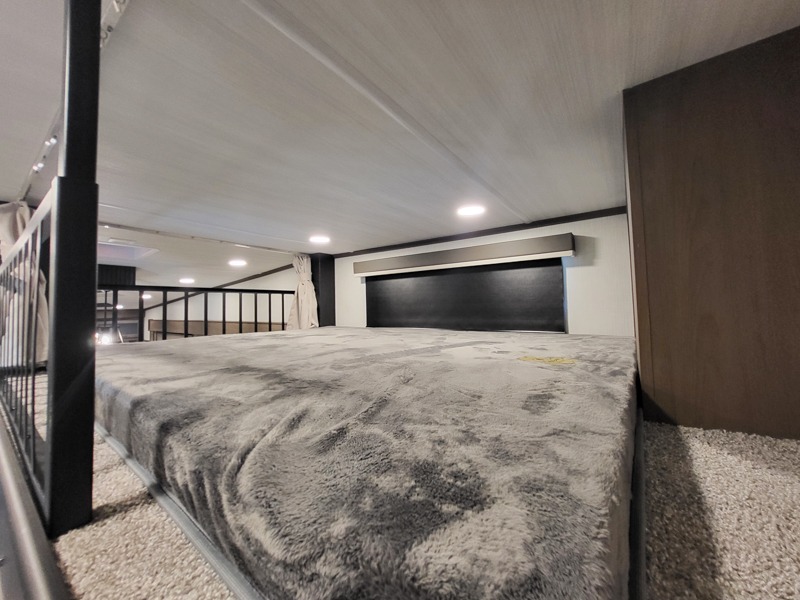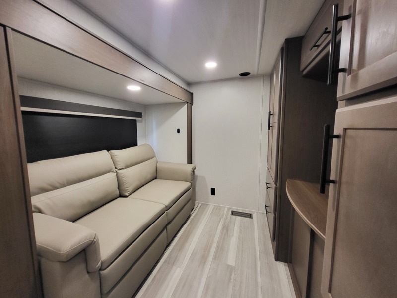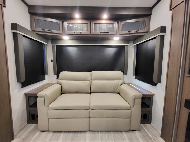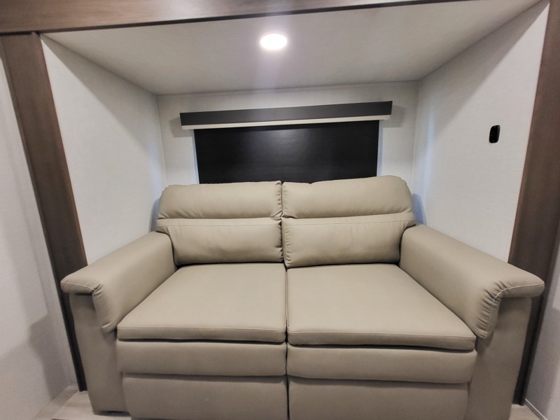 You'll love having an extra room that you can decide what to do with on this Cougar fifth wheel! There is a tri-fold sleeper sofa here, a desk plus two wardrobes for storage. Above this room is a loft which adds more sleeping space without taking up precious interior living space. And speaking of space, you'll find more of it in the main living area when you push out the opposing slides. A second tri-fold sleeper sofa sits in the living area, and there is also theater seating that you can rest on in front of the entertainment center with a hidden pantry and cordless vacuum prep behind. The full bathroom has a linen closet for your towels and washcloths, and there is also great storage in the front private bedroom with the under-bed storage, dresser with a sliding top, and a full-height wardrobe. Outside, you'll find two power awnings, an unobstructed pass-thru storage, and an outdoor kitchen prep area!