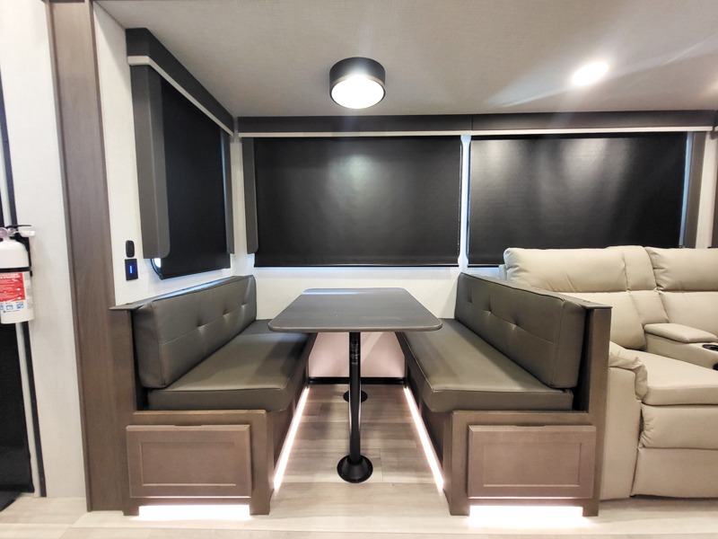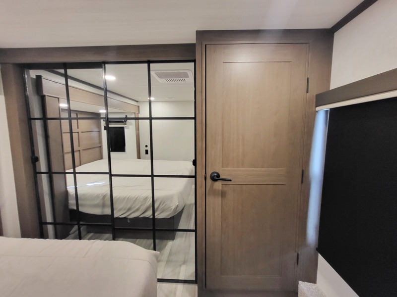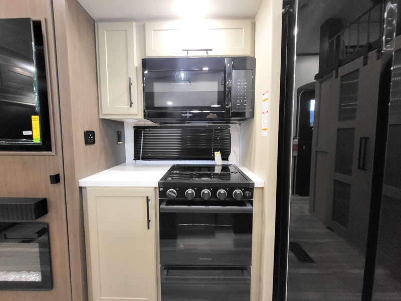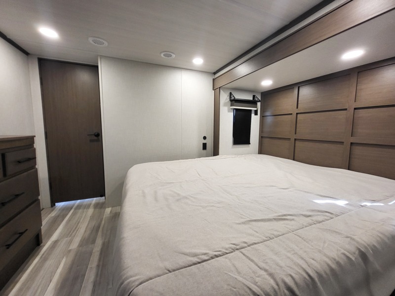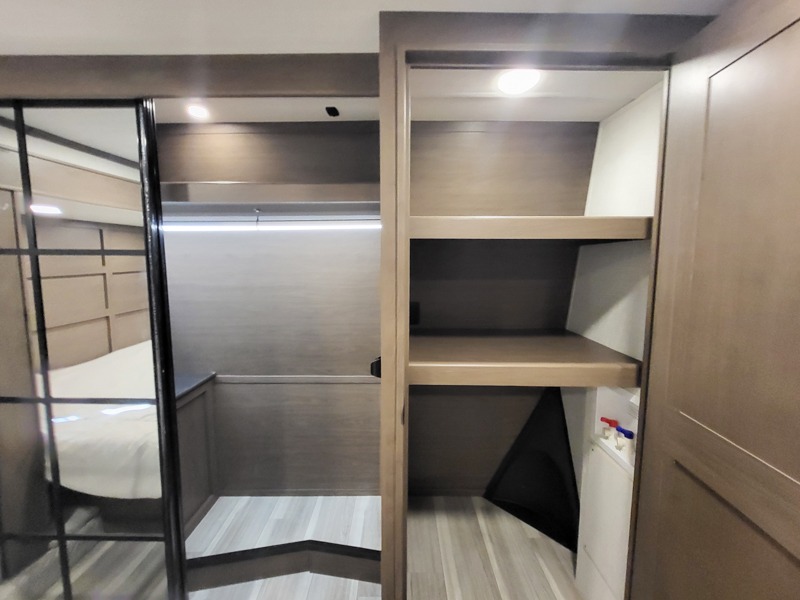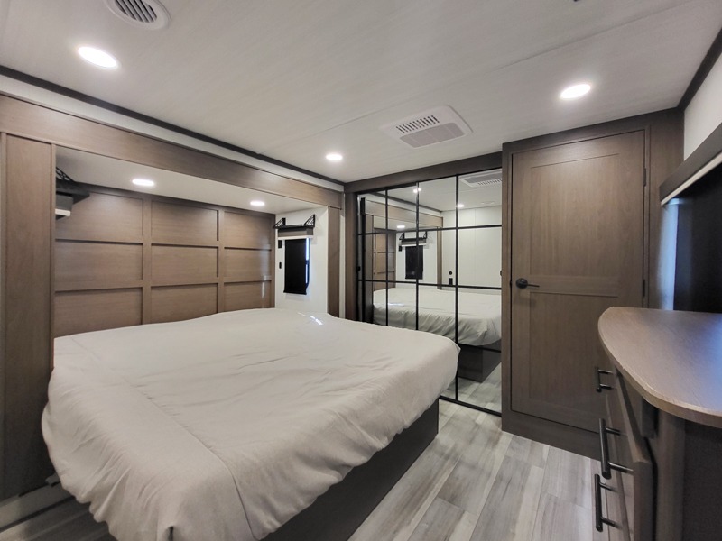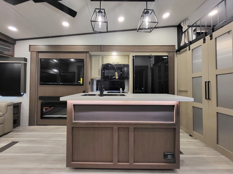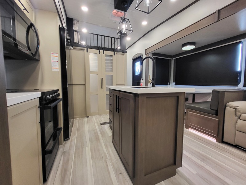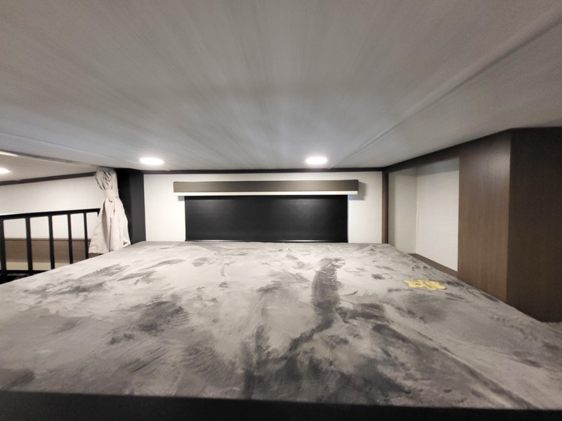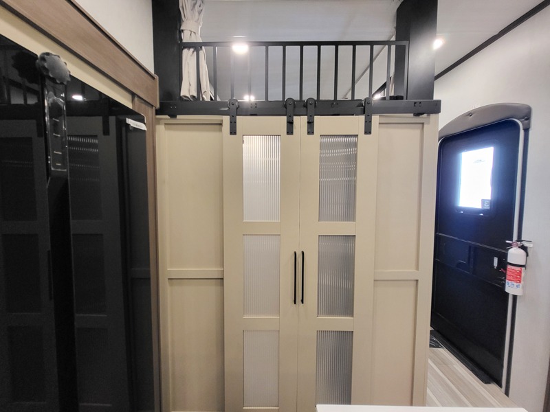 You'll love having an extra room that you can decide what to do with on this Cougar fifth wheel! There is a tri-fold sleeper sofa here, a desk plus two wardrobes for storage. Above this room is a loft which adds more sleeping space without taking up precious interior living space. And speaking of space, you'll find more of it in the main living area when you push out the opposing slides. A second tri-fold sleeper sofa sits in the living area, and there is also theater seating that you can rest on in front of the entertainment center with a hidden pantry and cordless vacuum prep behind. The full bathroom has a linen closet for your towels and washcloths, and there is also great storage in the front private bedroom with the under-bed storage, dresser with a sliding top, and a full-height wardrobe. Outside, you'll find two power awnings, an unobstructed pass-thru storage, and an outdoor kitchen prep area!