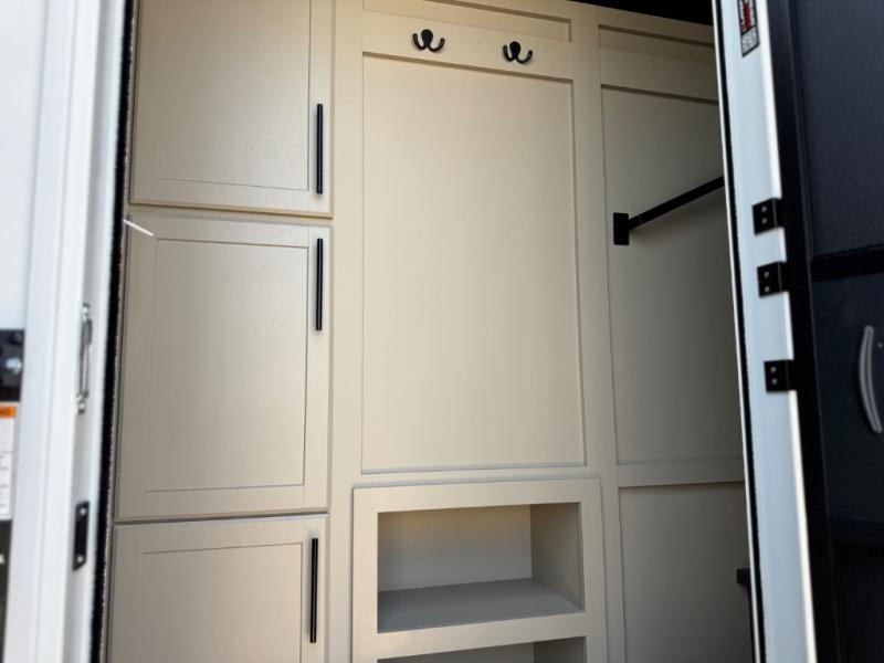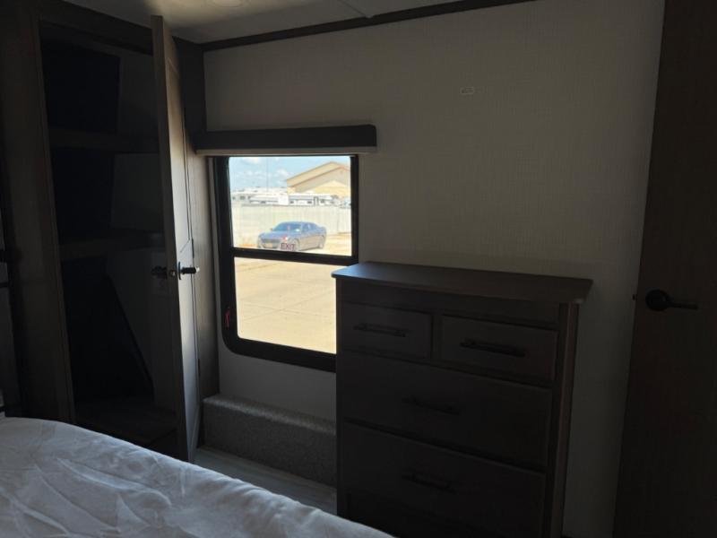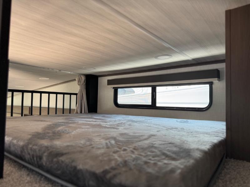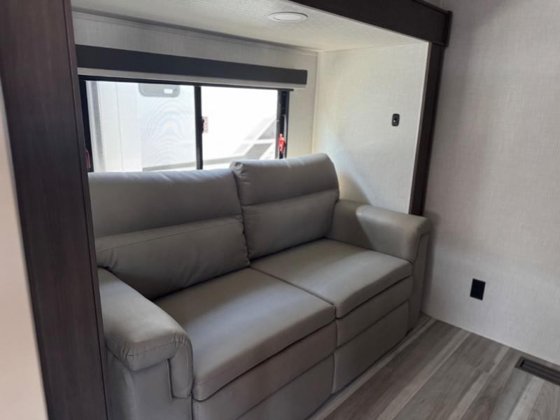 You'll love having an extra room that you can decide what to do with on this Cougar fifth wheel! There is a tri-fold sleeper sofa here, a desk plus two wardrobes for storage. Above this room is a loft which adds more sleeping space without taking up precious interior living space. And speaking of space, you'll find more of it in the main living area when you push out the opposing slides. A second tri-fold sleeper sofa sits in the living area, and there is also theater seating that you can rest on in front of the entertainment center with a hidden pantry. The full bathroom has a linen closet for your towels and washcloths, and there is also great storage in the front private bedroom with the under-bed storage, dresser with a sliding top, and a full-height wardrobe. Outside, you'll find two power awnings, an unobstructed pass-thru storage, and an outdoor kitchen prep area!