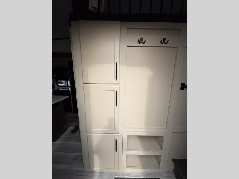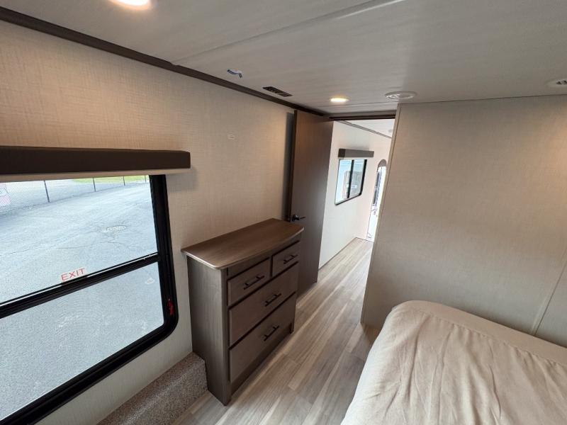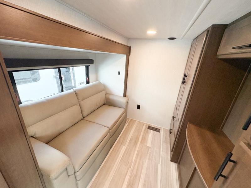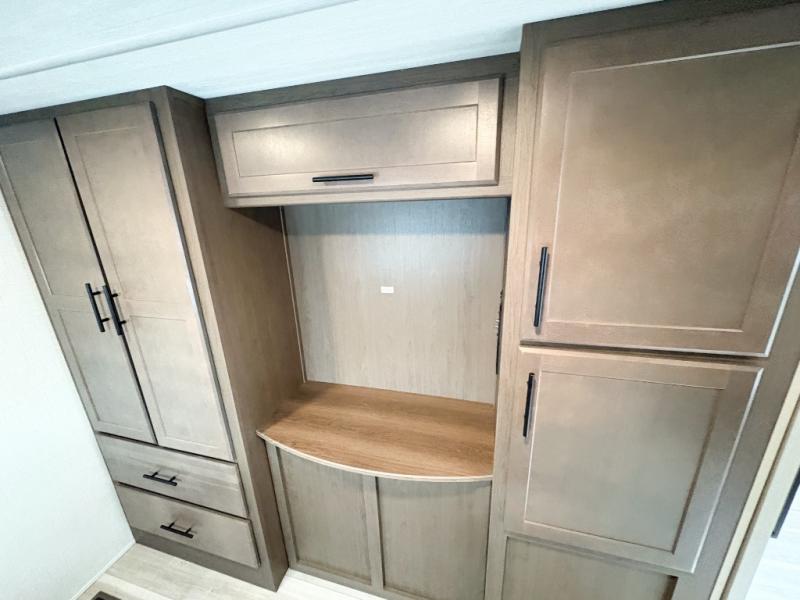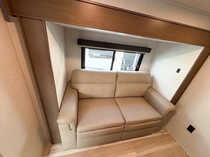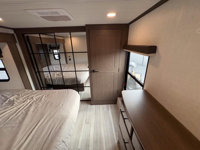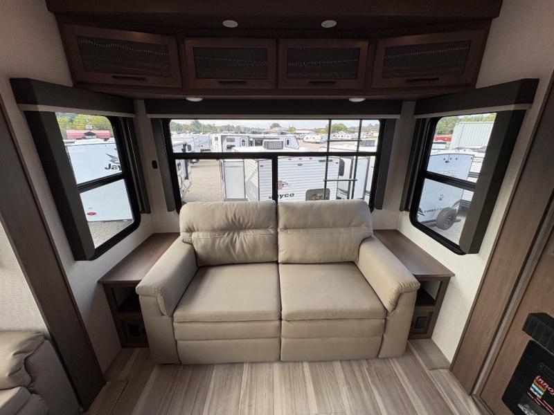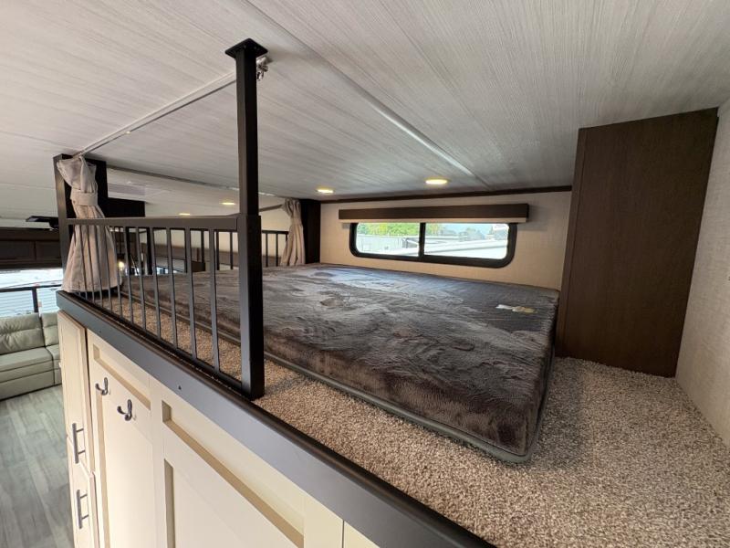 You'll love having an extra room that you can decide what to do with on this Cougar fifth wheel! There is a tri-fold sleeper sofa here, a desk plus two wardrobes for storage. Above this room is a loft which adds more sleeping space without taking up precious interior living space. And speaking of space, you'll find more of it in the main living area when you push out the opposing slides. A second tri-fold sleeper sofa sits in the living area, and there is also theater seating that you can rest on in front of the entertainment center with a hidden pantry. The full bathroom has a linen closet for your towels and washcloths, and there is also great storage in the front private bedroom with the under-bed storage, dresser with a sliding top, and a full-height wardrobe. Outside, you'll find two power awnings, an unobstructed pass-thru storage, and an outdoor kitchen prep area!