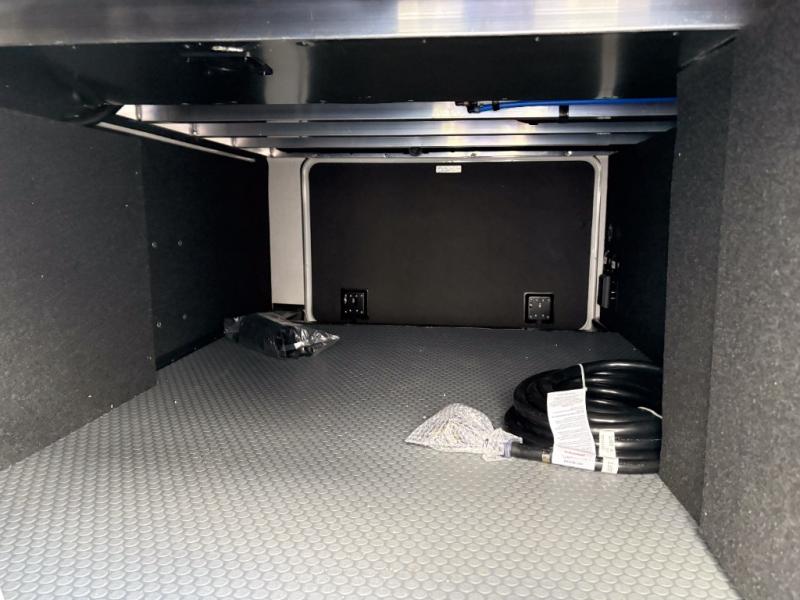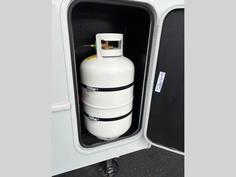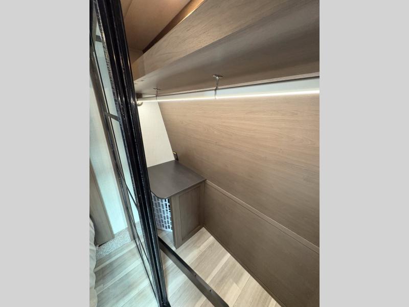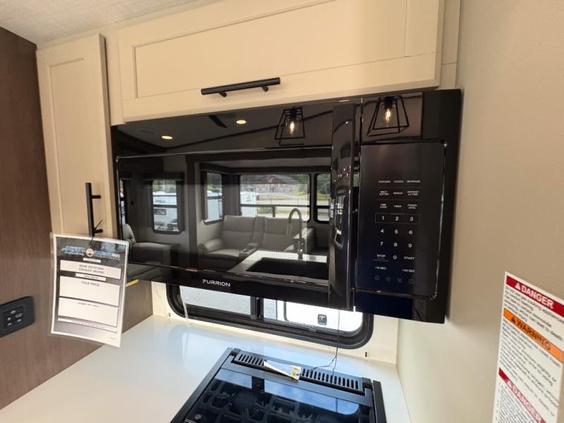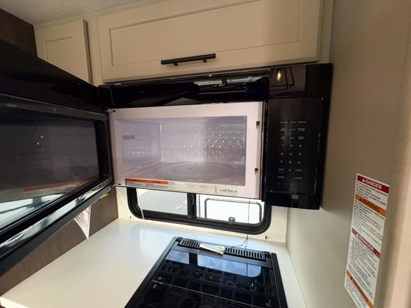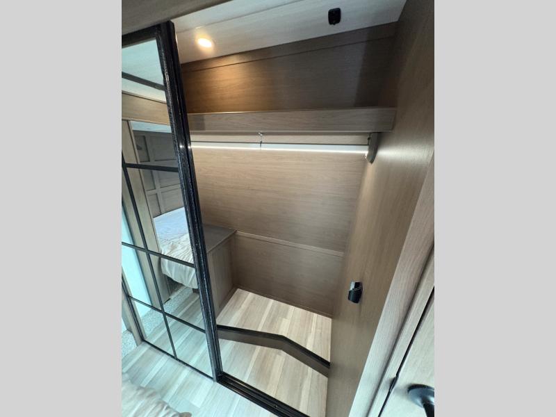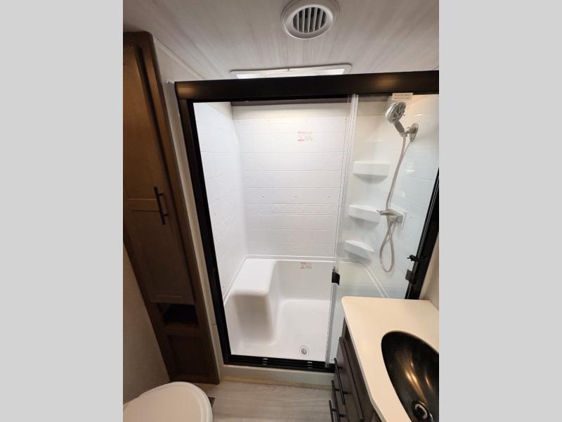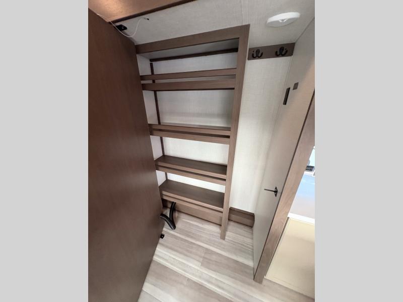 You'll love having an extra room that you can decide what to do with on this Cougar fifth wheel! There is a tri-fold sleeper sofa here, a desk plus two wardrobes for storage. Above this room is a loft which adds more sleeping space without taking up precious interior living space. And speaking of space, you'll find more of it in the main living area when you push out the opposing slides. A second tri-fold sleeper sofa sits in the living area, and there is also theater seating that you can rest on in front of the entertainment center with a hidden pantry. The full bathroom has a linen closet for your towels and washcloths, and there is also great storage in the front private bedroom with the under-bed storage, dresser with a sliding top, and a full-height wardrobe. Outside, you'll find two power awnings, an unobstructed pass-thru storage, and an outdoor kitchen prep area!