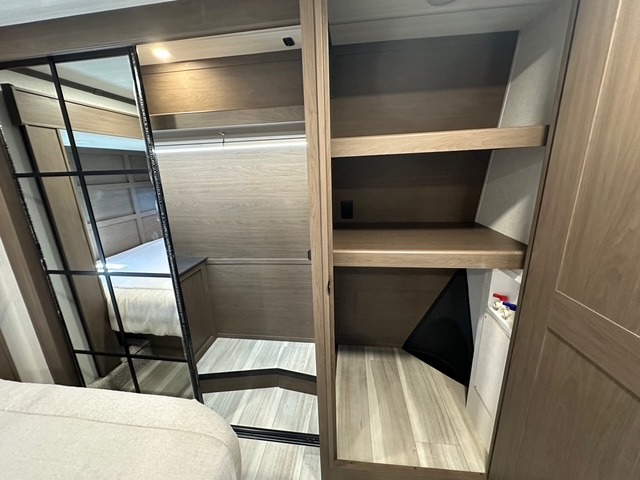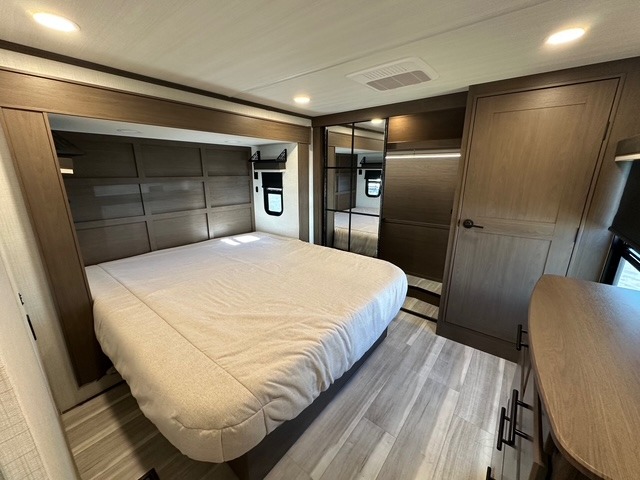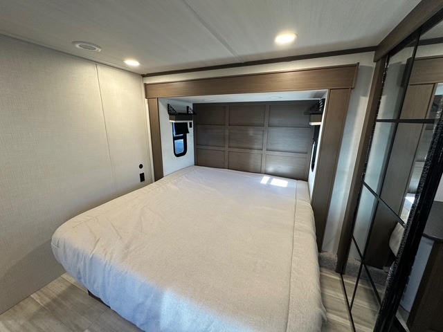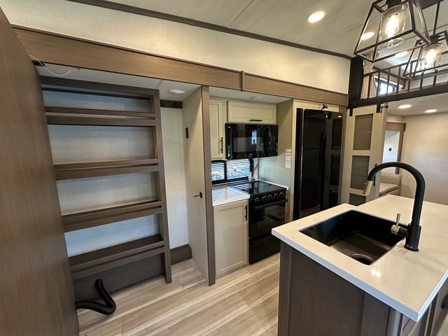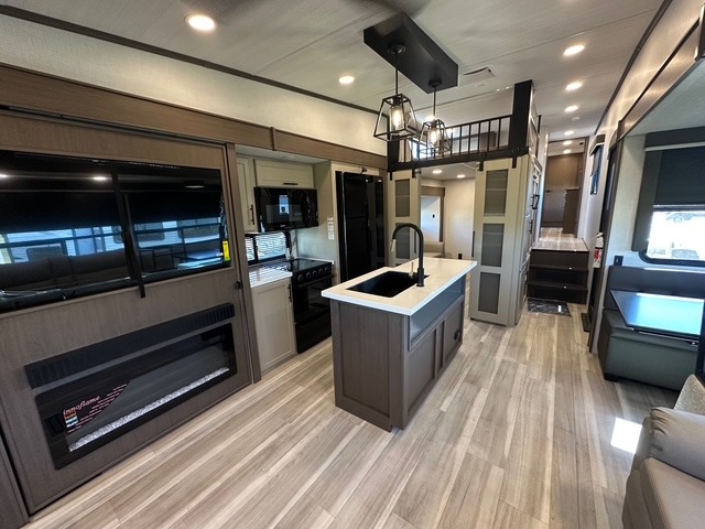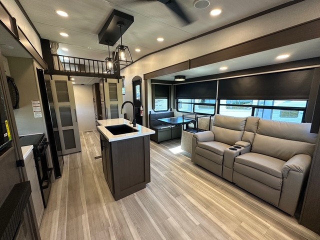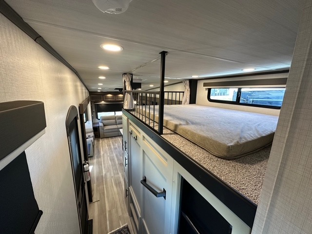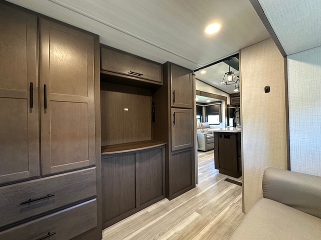 You'll love having an extra room that you can decide what to do with on this Cougar fifth wheel! There is a tri-fold sleeper sofa here, a desk plus two wardrobes for storage. Above this room is a loft which adds more sleeping space without taking up precious interior living space. And speaking of space, you'll find more of it in the main living area when you push out the opposing slides. A second tri-fold sleeper sofa sits in the living area, and there is also theater seating that you can rest on in front of the entertainment center with a hidden pantry. The full bathroom has a linen closet for your towels and washcloths, and there is also great storage in the front private bedroom with the under-bed storage, dresser with a sliding top, and a full-height wardrobe. Outside, you'll find two power awnings, an unobstructed pass-thru storage, and an outdoor kitchen prep area!