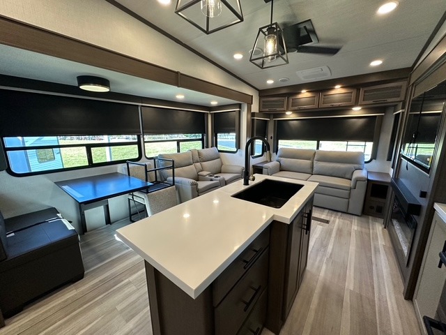 Spend more time having fun and less time worrying about your RV with the Keystone Cougar fifth wheel! These units have all that you will need for excellent vacations. The interior comes with 5/8" one-piece DynaSpan® flooring, tall slide outs for added comfort and head room, night roller shades throughout, and residential, shaker style hardwood cabinet doors and drawers. You will also enjoy decorative crown molding, a 5,500 BTU electric fireplace with thermostat control and remote, and a Max Air exhaust fan with rain sensor. The exterior is also fully outfitted with a convenience center, friction-hinge entry door, electric four-point auto leveling system, and slam-latch baggage doors. Each model is available with the optional Hero Edition. By choosing this edition, you can help support our nation's heros and their families by contributing to the Wounded Warrior Project. This optional package features an industry exclusive full-body paint matte finish, frameless windows, a glass entry door, blackout rims, and green LED exterior accent lighting; see dealer for more details!