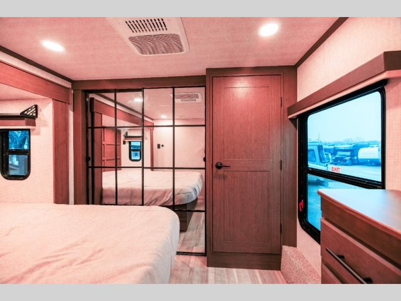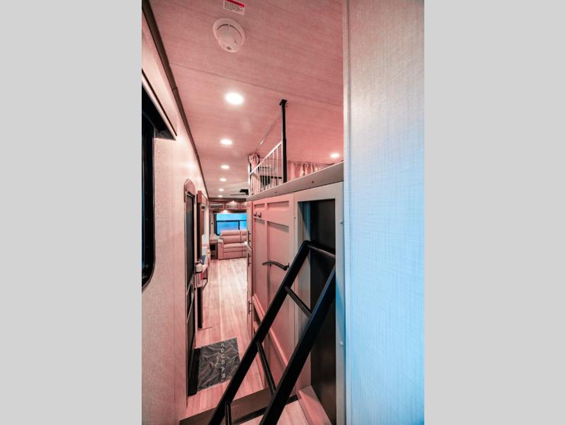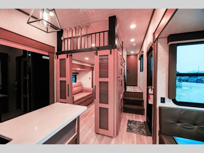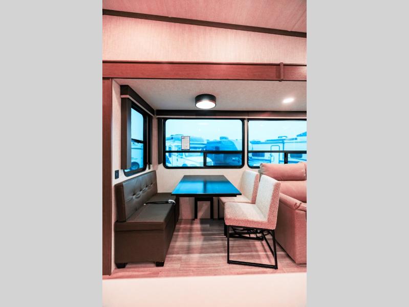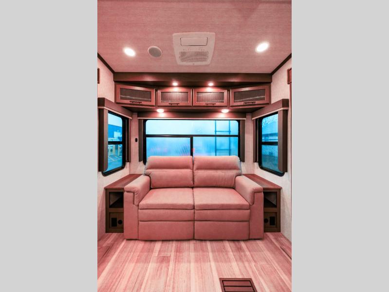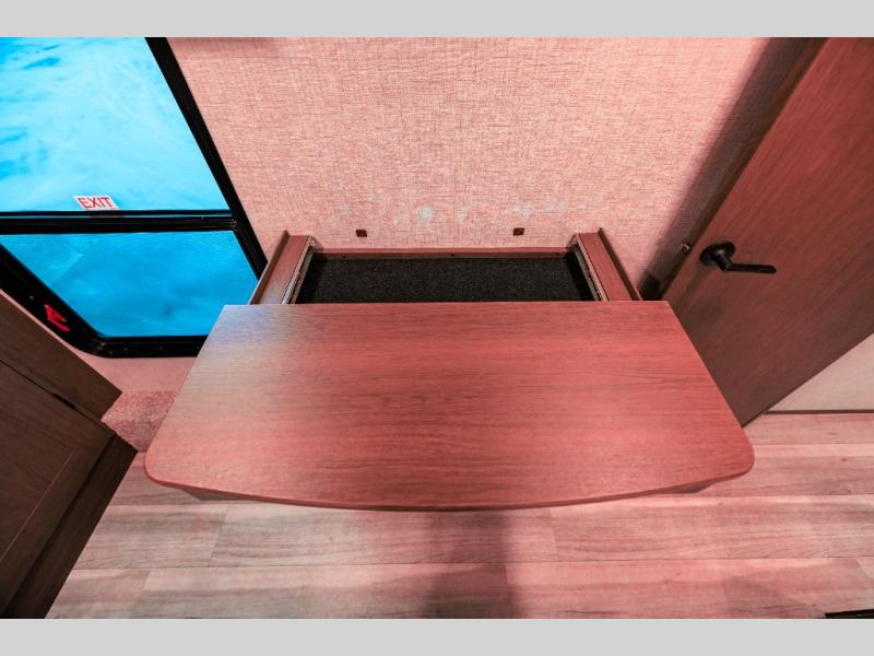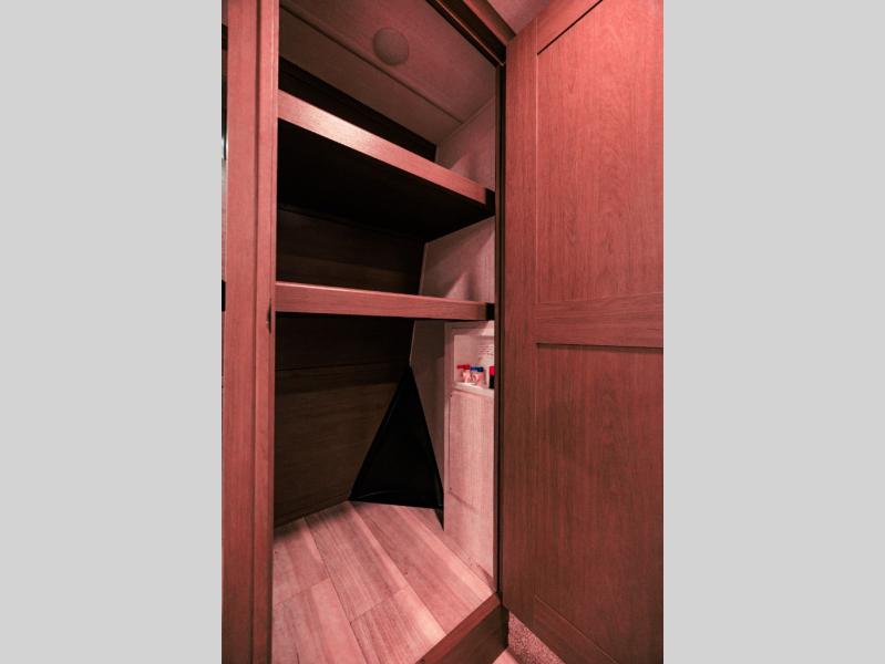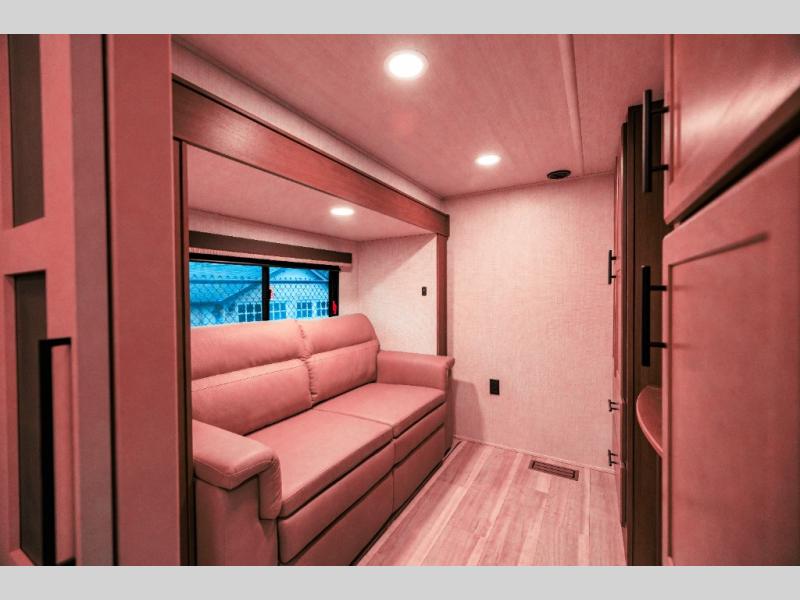 You'll love having an extra room that you can decide what to do with on this Cougar fifth wheel! There is a tri-fold sleeper sofa here, a desk plus two wardrobes for storage. Above this room is a loft which adds more sleeping space without taking up precious interior living space. And speaking of space, you'll find more of it in the main living area when you push out the opposing slides. A second tri-fold sleeper sofa sits in the living area, and there is also theater seating that you can rest on in front of the entertainment center with a hidden pantry. The full bathroom has a linen closet for your towels and washcloths, and there is also great storage in the front private bedroom with the under-bed storage, dresser with a sliding top, and a full-height wardrobe. Outside, you'll find two power awnings, an unobstructed pass-thru storage, and an outdoor kitchen prep area!