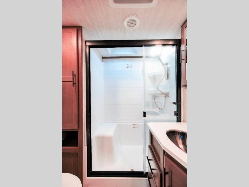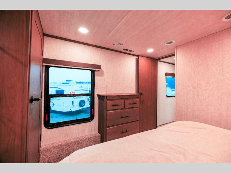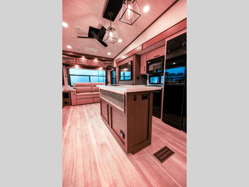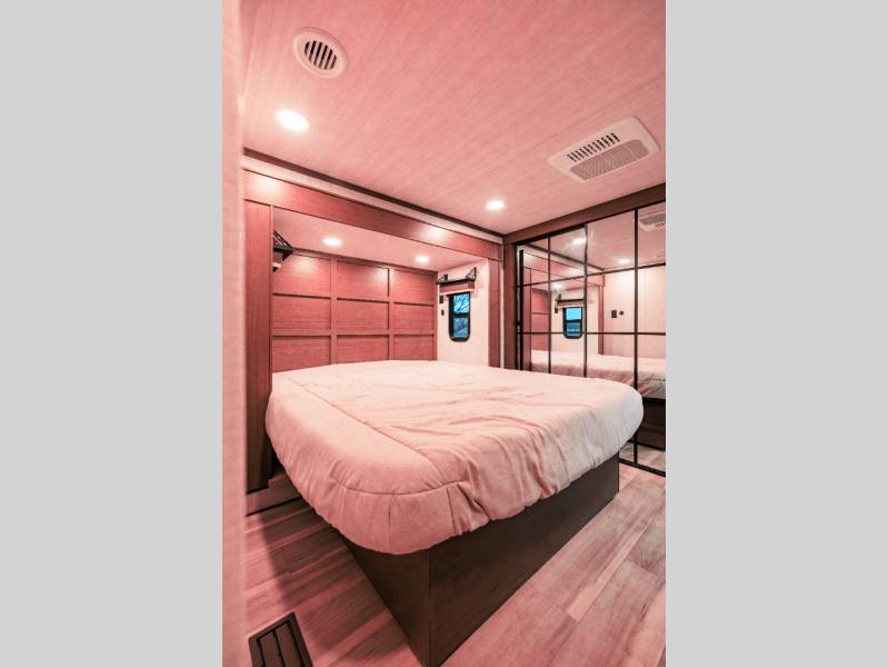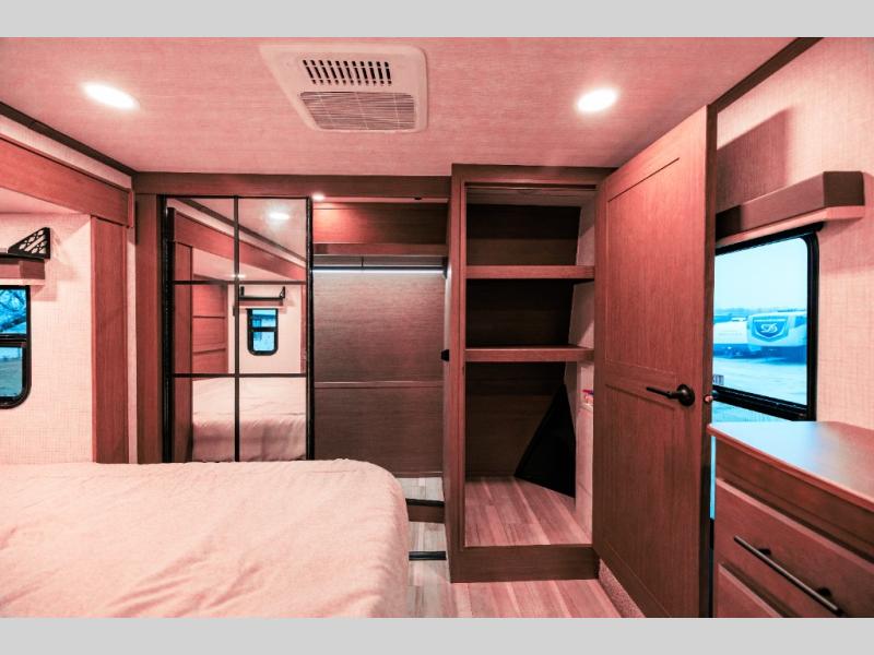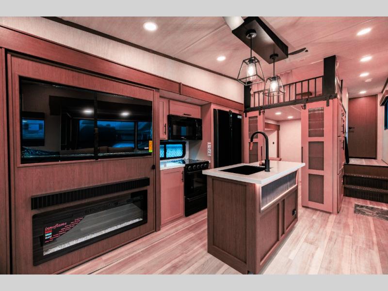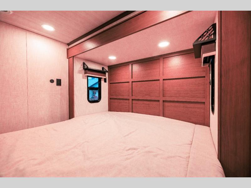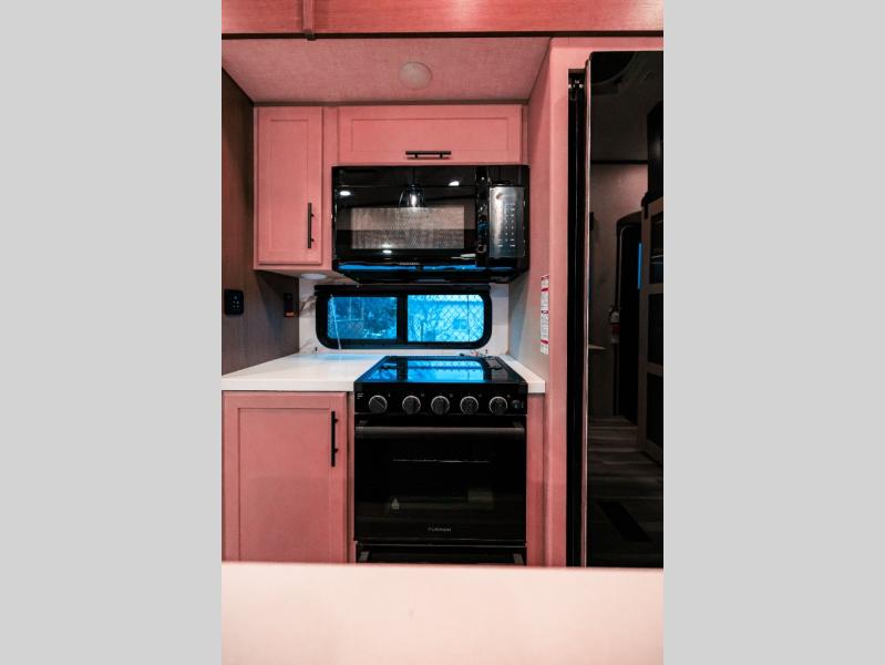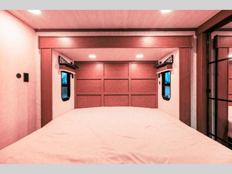 You'll love having an extra room that you can decide what to do with on this Cougar fifth wheel! There is a tri-fold sleeper sofa here, a desk plus two wardrobes for storage. Above this room is a loft which adds more sleeping space without taking up precious interior living space. And speaking of space, you'll find more of it in the main living area when you push out the opposing slides. A second tri-fold sleeper sofa sits in the living area, and there is also theater seating that you can rest on in front of the entertainment center with a hidden pantry. The full bathroom has a linen closet for your towels and washcloths, and there is also great storage in the front private bedroom with the under-bed storage, dresser with a sliding top, and a full-height wardrobe. Outside, you'll find two power awnings, an unobstructed pass-thru storage, and an outdoor kitchen prep area!