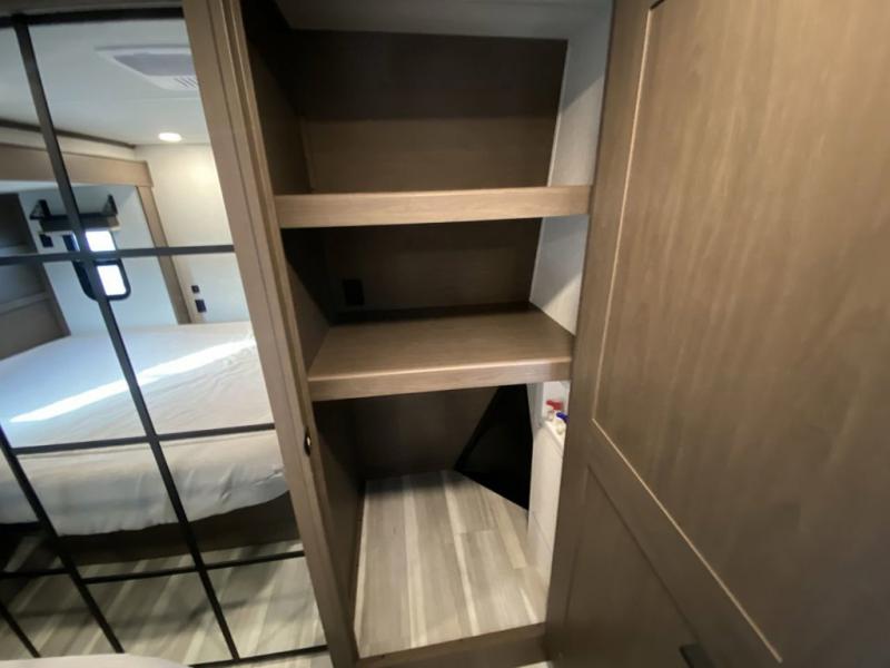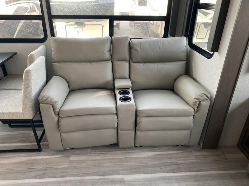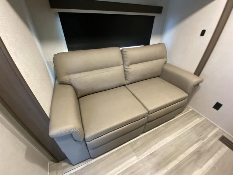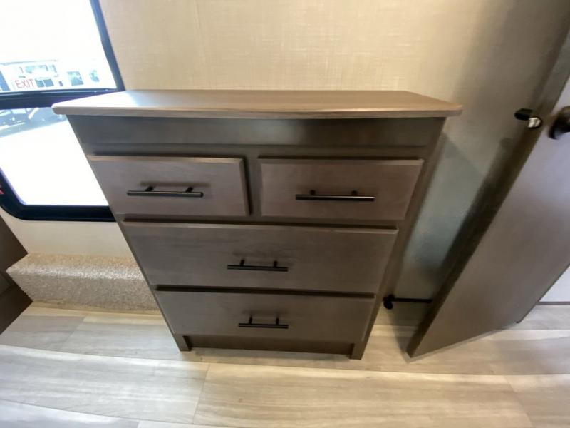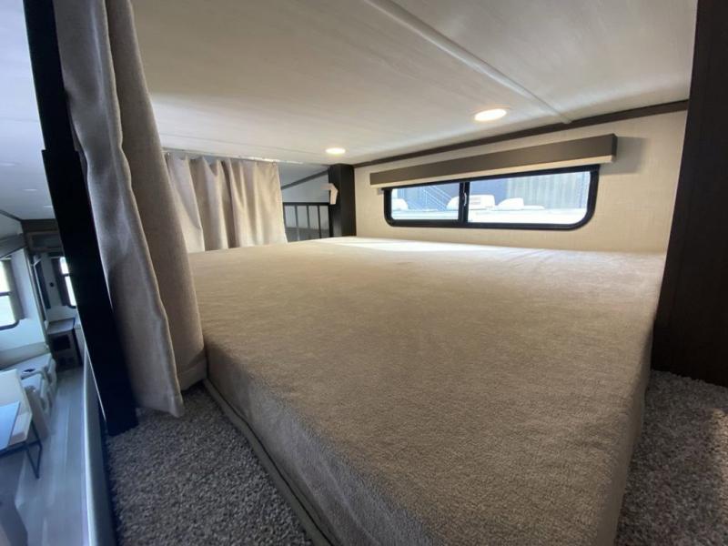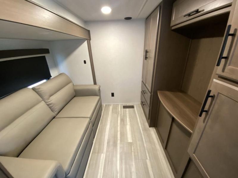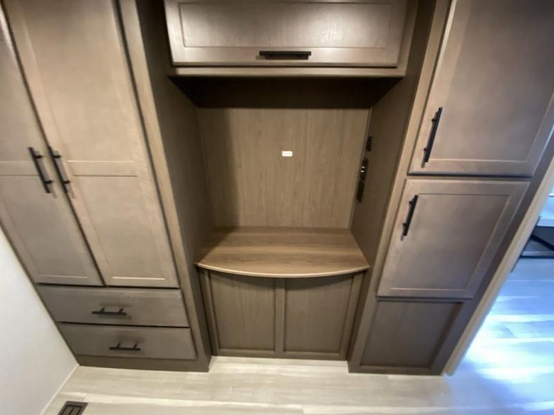You'll love having an extra room that you can decide what to do with on this Cougar fifth wheel! There is a tri-fold sleeper sofa here, a desk plus two wardrobes for storage. Above this room is a loft which adds more sleeping space without taking up precious interior living space. And speaking of space, you'll find more of it in the main living area when you push out the opposing slides. A second tri-fold sleeper sofa sits in the living area, and there is also theater seating that you can rest on in front of the entertainment center with a hidden pantry. The full bathroom has a linen closet for your towels and washcloths, and there is also great storage in the front private bedroom with the under-bed storage, dresser with a sliding top, and a full-height wardrobe. Outside, you'll find two power awnings, an unobstructed pass-thru storage, and an outdoor kitchen prep area!