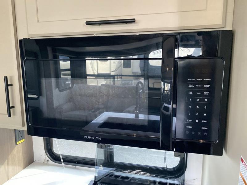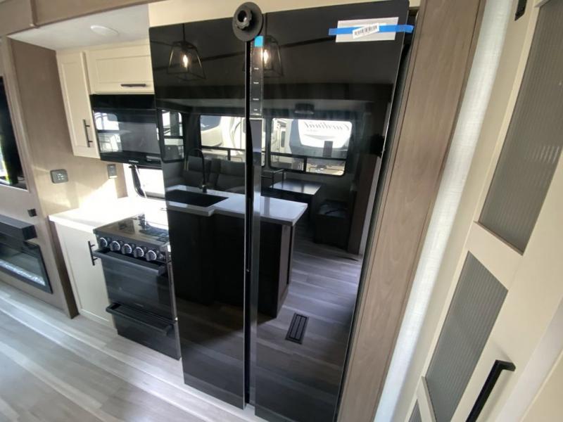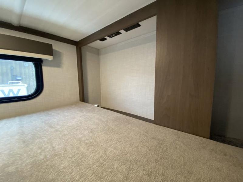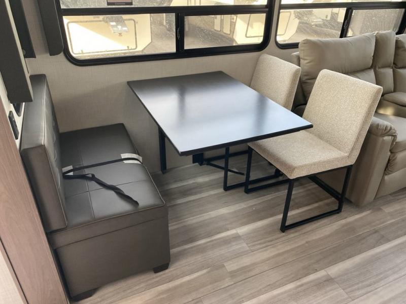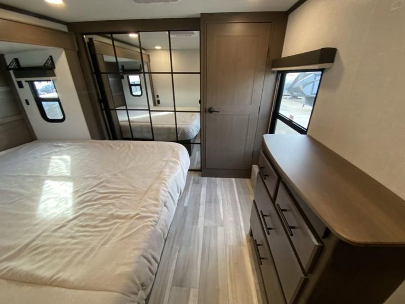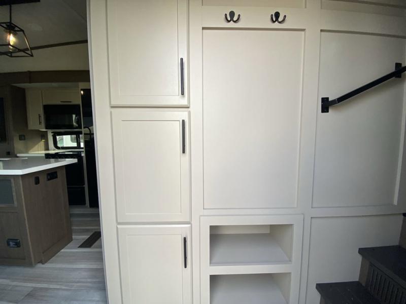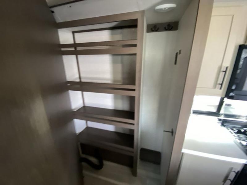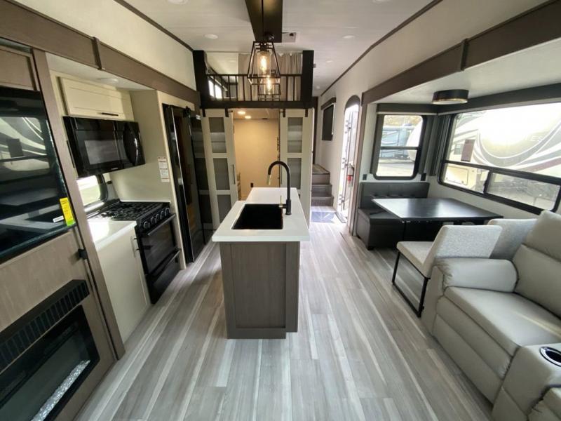You'll love having an extra room that you can decide what to do with on this Cougar fifth wheel! There is a tri-fold sleeper sofa here, a desk plus two wardrobes for storage. Above this room is a loft which adds more sleeping space without taking up precious interior living space. And speaking of space, you'll find more of it in the main living area when you push out the opposing slides. A second tri-fold sleeper sofa sits in the living area, and there is also theater seating that you can rest on in front of the entertainment center with a hidden pantry. The full bathroom has a linen closet for your towels and washcloths, and there is also great storage in the front private bedroom with the under-bed storage, dresser with a sliding top, and a full-height wardrobe. Outside, you'll find two power awnings, an unobstructed pass-thru storage, and an outdoor kitchen prep area!