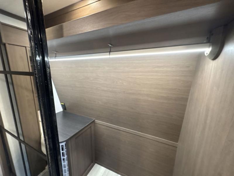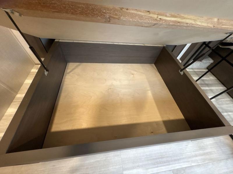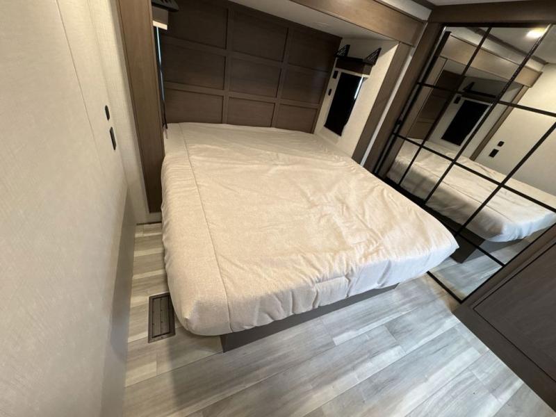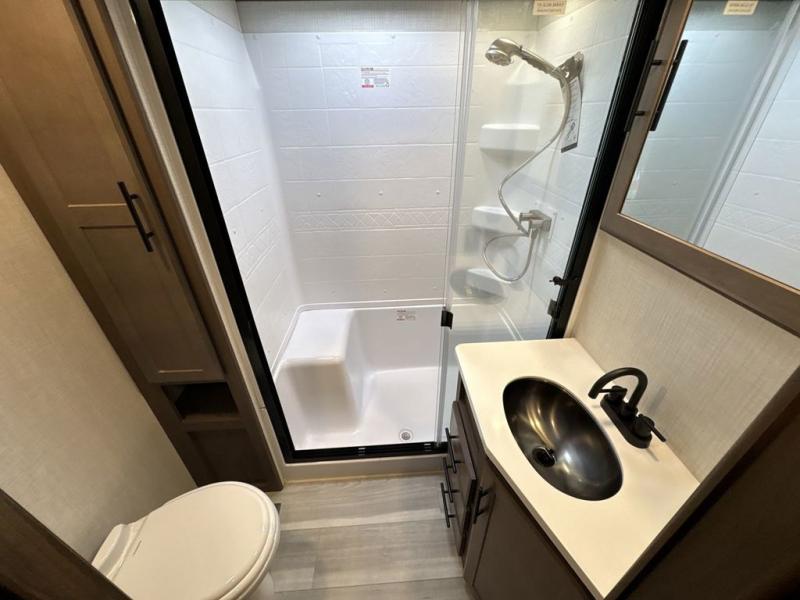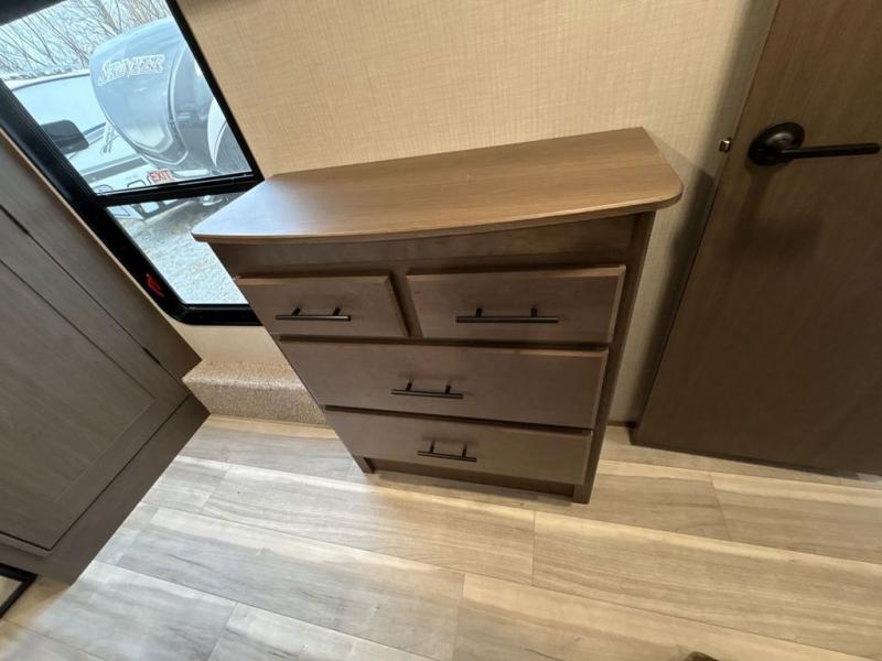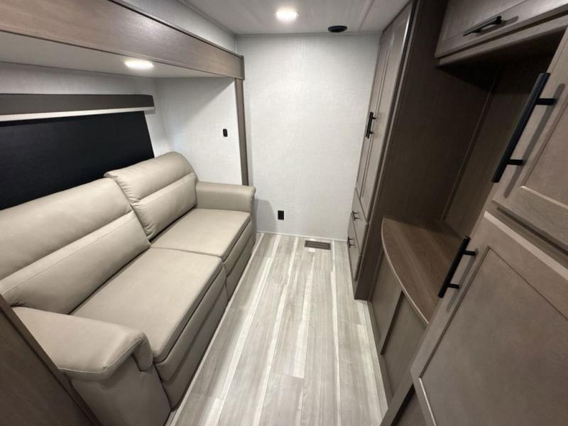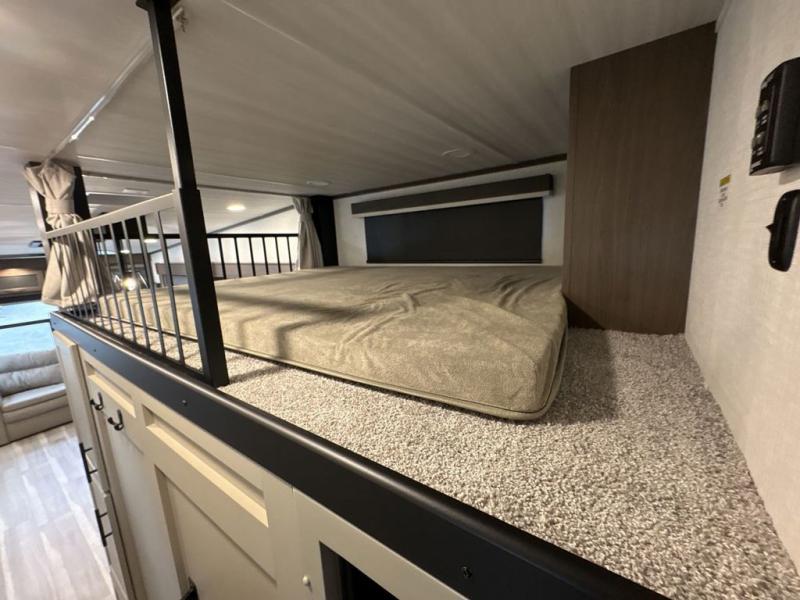 You'll love having an extra room that you can decide what to do with on this Cougar fifth wheel! There is a tri-fold sleeper sofa here, a desk plus two wardrobes for storage. Above this room is a loft which adds more sleeping space without taking up precious interior living space. And speaking of space, you'll find more of it in the main living area when you push out the opposing slides. A second tri-fold sleeper sofa sits in the living area, and there is also theater seating that you can rest on in front of the entertainment center with a hidden pantry. The full bathroom has a linen closet for your towels and washcloths, and there is also great storage in the front private bedroom with the under-bed storage, dresser with a sliding top, and a full-height wardrobe. Outside, you'll find two power awnings, an unobstructed pass-thru storage, and an outdoor kitchen prep area!