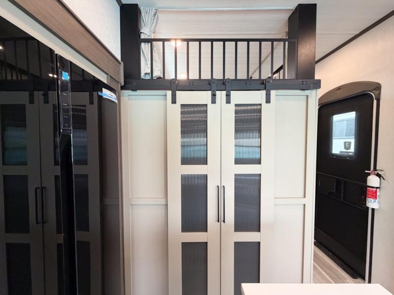 You'll love having an extra room that you can decide what to do with on this Cougar fifth wheel! There is a tri-fold sleeper sofa here, a desk plus two wardrobes for storage. Above this room is a loft which adds more sleeping space without taking up precious interior living space. And speaking of space, you'll find more of it in the main living area when you push out the opposing slides. A second tri-fold sleeper sofa sits in the living area, and there is also theater seating that you can rest on in front of the entertainment center with a hidden pantry. The full bathroom has a linen closet for your towels and washcloths, and there is also great storage in the front private bedroom with the under-bed storage, dresser with a sliding top, and a full-height wardrobe. Outside, you'll find two power awnings, an unobstructed pass-thru storage, and an outdoor kitchen prep area!
