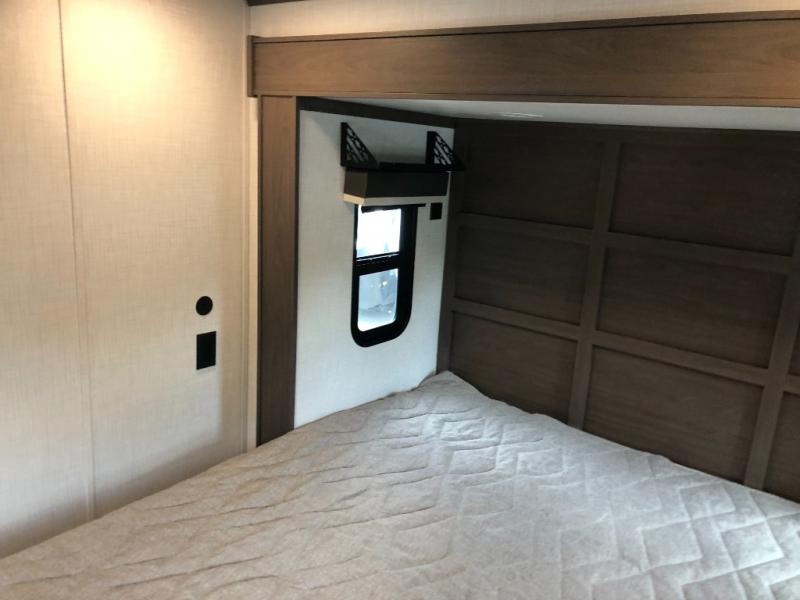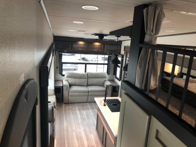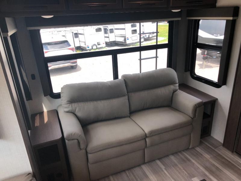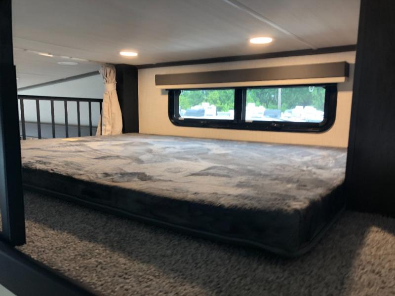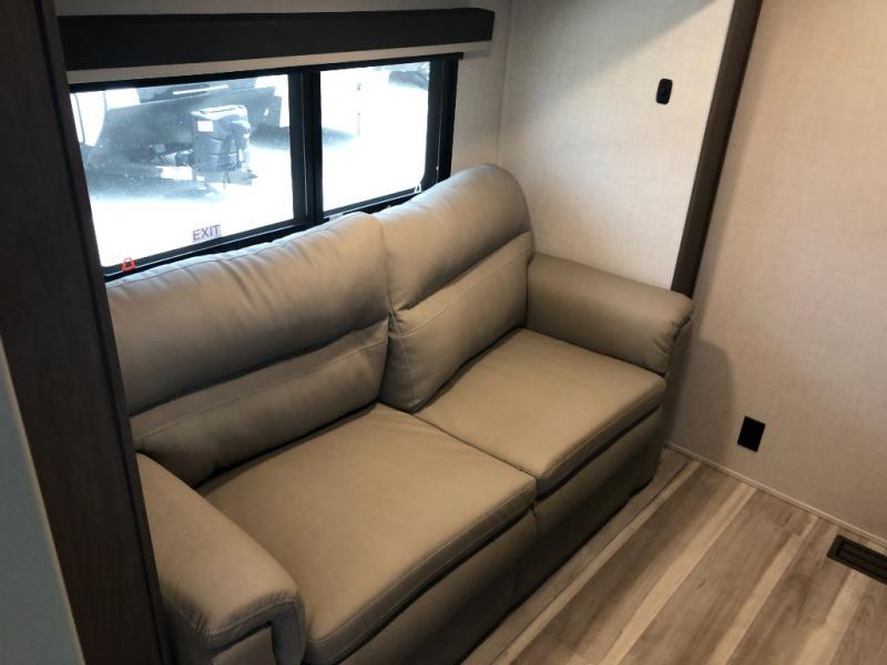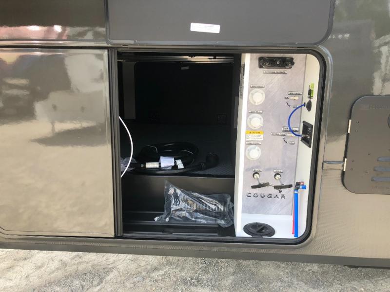 You'll love having an extra room that you can decide what to do with on this Cougar fifth wheel! There is a tri-fold sleeper sofa here, a desk plus two wardrobes for storage. Above this room is a loft which adds more sleeping space without taking up precious interior living space. And speaking of space, you'll find more of it in the main living area when you push out the opposing slides. A second tri-fold sleeper sofa sits in the living area, and there is also theater seating that you can rest on in front of the entertainment center with a hidden pantry. The full bathroom has a linen closet for your towels and washcloths, and there is also great storage in the front private bedroom with the under-bed storage, dresser with a sliding top, and a full-height wardrobe. Outside, you'll find two power awnings, an unobstructed pass-thru storage, and an outdoor kitchen prep area!