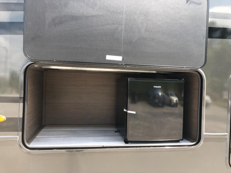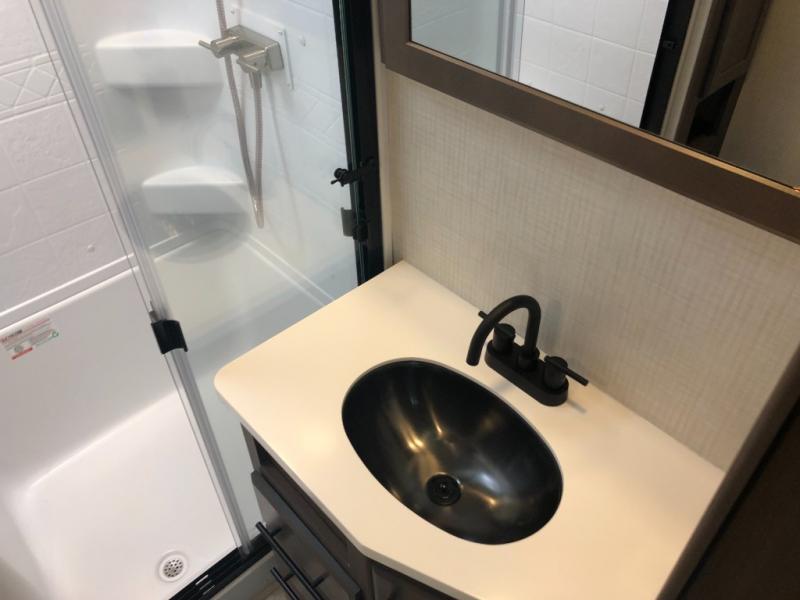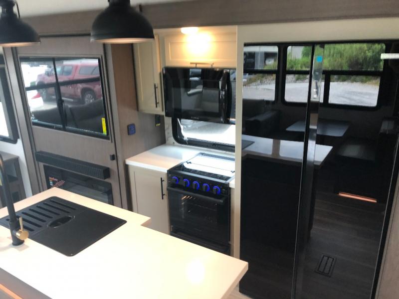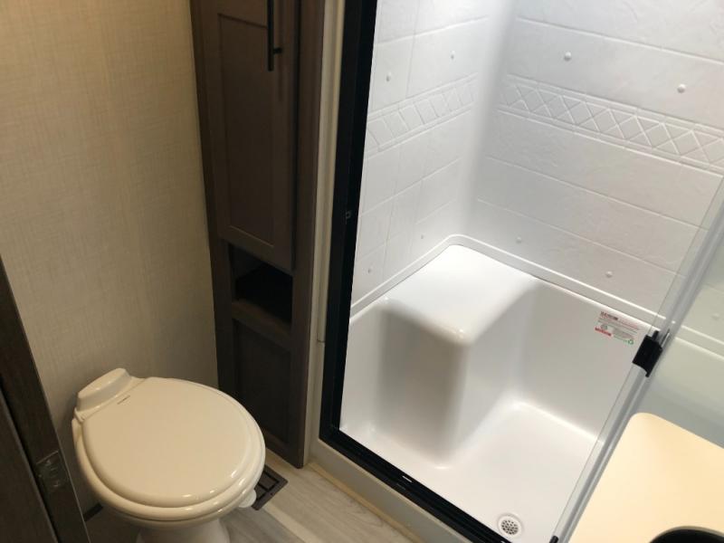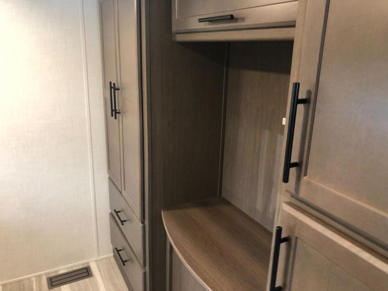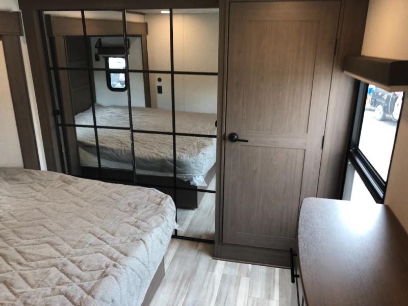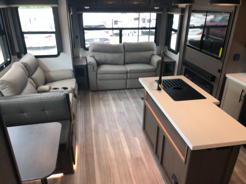 You'll love having an extra room that you can decide what to do with on this Cougar fifth wheel! There is a tri-fold sleeper sofa here, a desk plus two wardrobes for storage. Above this room is a loft which adds more sleeping space without taking up precious interior living space. And speaking of space, you'll find more of it in the main living area when you push out the opposing slides. A second tri-fold sleeper sofa sits in the living area, and there is also theater seating that you can rest on in front of the entertainment center with a hidden pantry. The full bathroom has a linen closet for your towels and washcloths, and there is also great storage in the front private bedroom with the under-bed storage, dresser with a sliding top, and a full-height wardrobe. Outside, you'll find two power awnings, an unobstructed pass-thru storage, and an outdoor kitchen prep area!