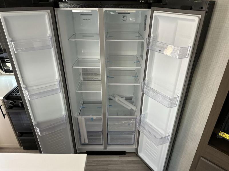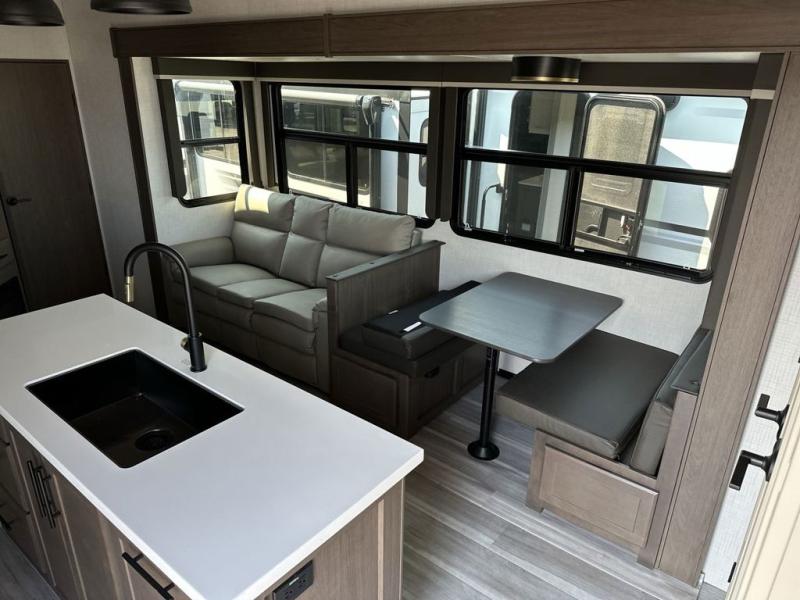 You'll want to pounce on this Cougar fifth wheel because of its amazing sleeping accommodations! Not only is there a master suite up front, but there is also a bedroom suite in the back. This rear suite has a 54" x 74" bed with a 54" x 74" loft bed above it. Plus, the second exterior entry door leads into the half bathroom, so you can exit the fifth wheel from this rear bedroom too. When you do exit, you'll be right next to the outdoor kitchen prep area with a mini refrigerator, and two 12' power awnings. A 68" tri-fold sleeper sofa and booth dinette adds more sleeping space, and it also gives you a comfortable place to watch the LED HDTV at night. A kitchen island will be helpful to use while you're cooking, and the 16 cu. ft. 12V refrigerator will hold perishables for the whole week!