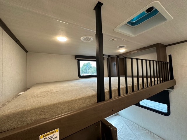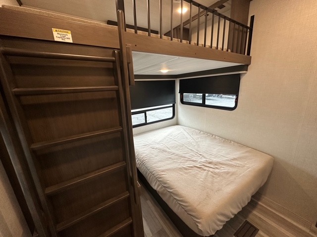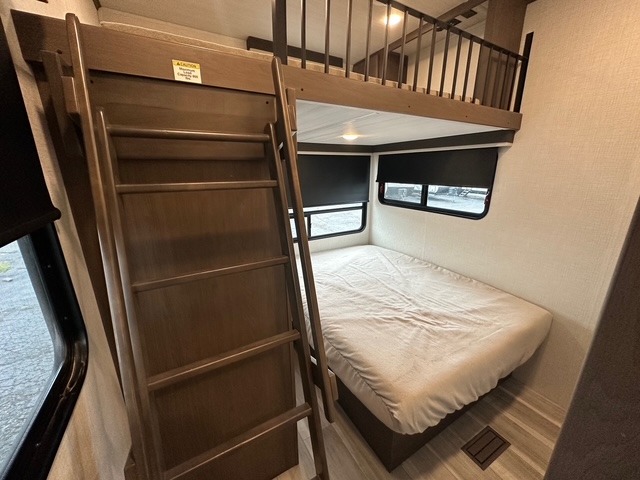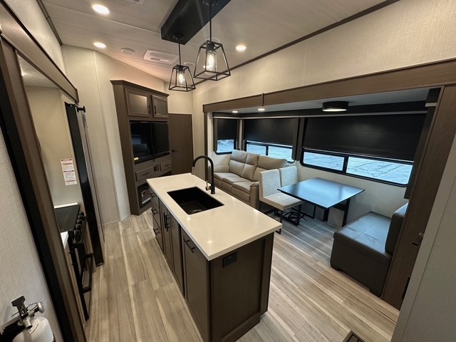 You'll want to pounce on this Cougar fifth wheel because of its amazing sleeping accommodations! Not only is there a master suite up front, but there is also a bedroom suite in the back. This rear suite has a 54" x 74" bed with a 54" x 74" loft bed above it. Plus, the second exterior entry door leads into the half bathroom, so you can exit the fifth wheel from this rear bedroom too. When you do exit, you'll be right next to the outdoor kitchen prep area with a mini refrigerator, and two 12' power awnings. A 68" tri-fold sleeper sofa and booth dinette adds more sleeping space, and it also gives you a comfortable place to watch the LED HDTV at night. A kitchen island will be helpful to use while you're cooking, and the 16 cu. ft. 12V refrigerator will hold perishables for the whole week!