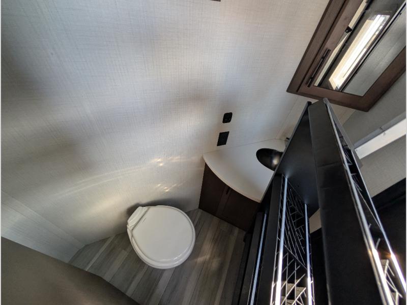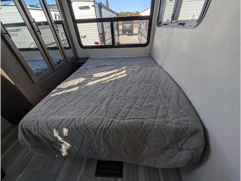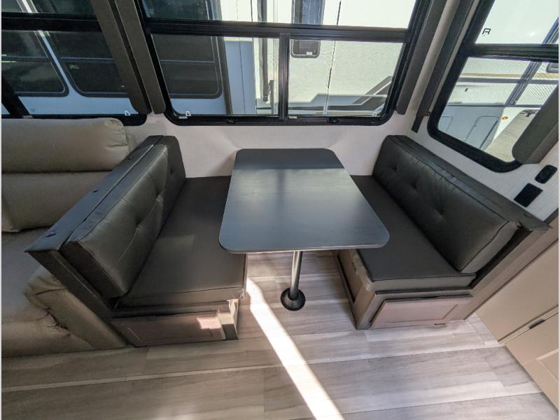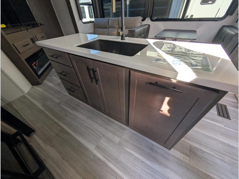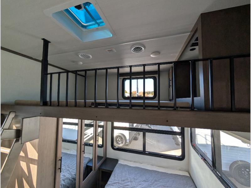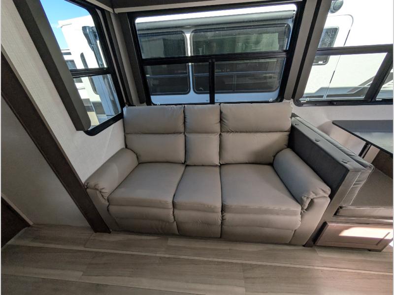 You'll want to pounce on this Cougar fifth wheel because of its amazing sleeping accommodations! Not only is there a master suite up front, but there is also a bedroom suite in the back. This rear suite has a 54" x 74" bed with a 54" x 74" loft bed above it. Plus, the second exterior entry door leads into the half bathroom, so you can exit the fifth wheel from this rear bedroom too. When you do exit, you'll be right next to the outdoor kitchen prep area with a mini refrigerator, and two 12' power awnings. A 68" tri-fold sleeper sofa and booth dinette adds more sleeping space, and it also gives you a comfortable place to watch the LED HDTV at night. A kitchen island will be helpful to use while you're cooking, and the 16 cu. ft. 12V refrigerator will hold perishables for the whole week!