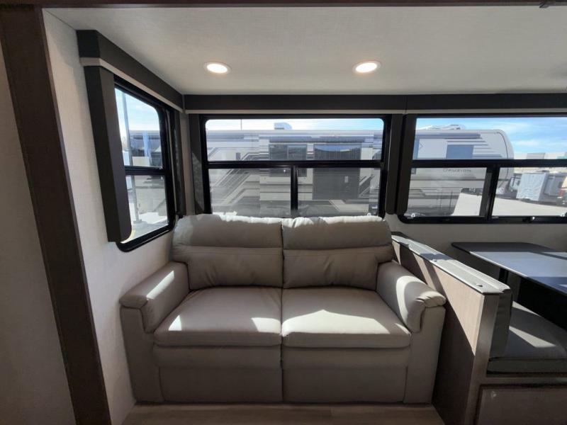 You'll want to pounce on this Cougar fifth wheel because of its amazing sleeping accommodations! Not only is there a master suite up front, but there is also a bedroom suite in the back. This rear suite has a 54" x 74" bed with a 54" x 74" loft bed above it. Plus, the second exterior entry door leads into the half bathroom, so you can exit the fifth wheel from this rear bedroom too. When you do exit, you'll be right next to the outdoor kitchen prep area with a mini refrigerator, and two 12' power awnings. A 68" tri-fold sleeper sofa and booth dinette adds more sleeping space, and it also gives you a comfortable place to watch the LED HDTV at night. A kitchen island will be helpful to use while you're cooking, and the 16 cu. ft. 12V refrigerator will hold perishables for the whole week!