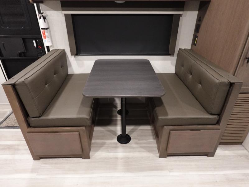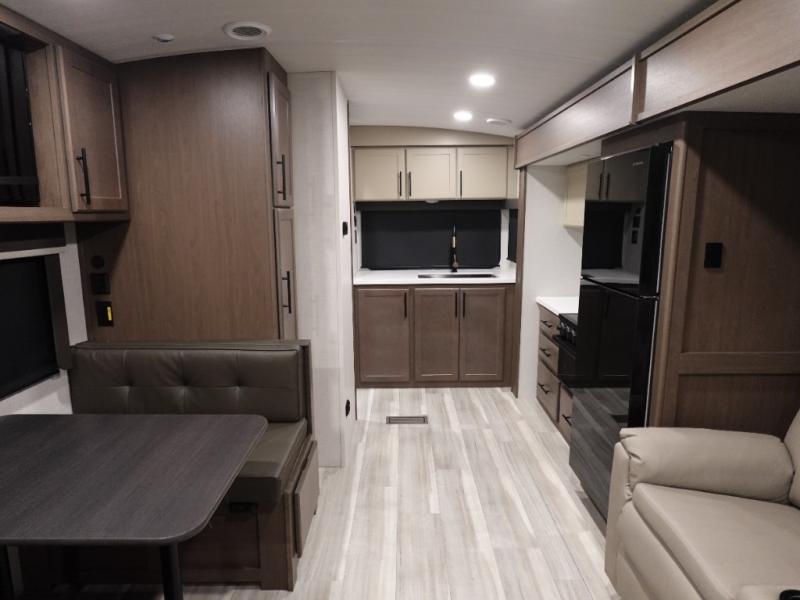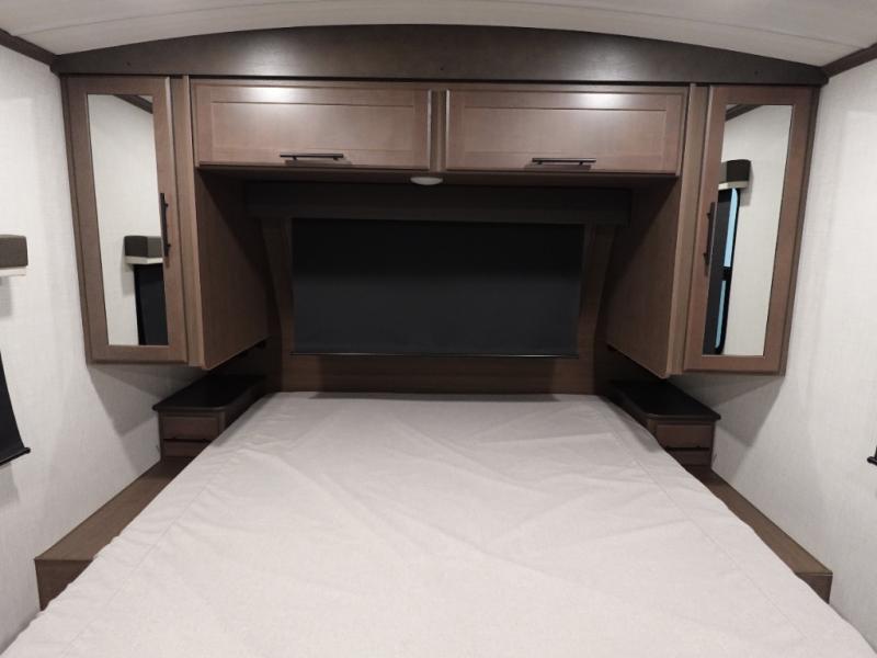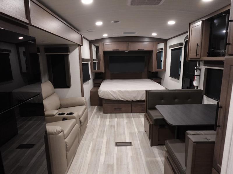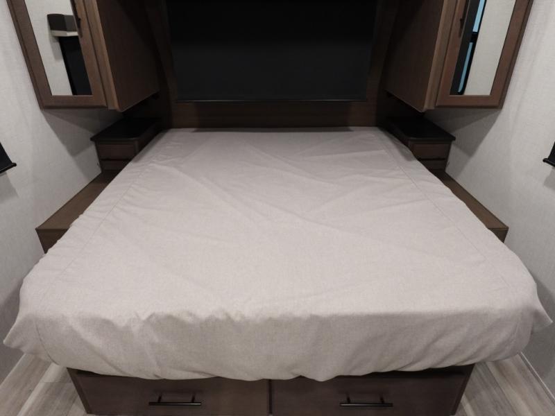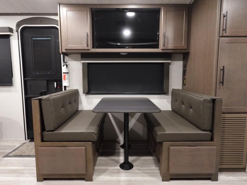 With a king-size bed, this Cougar Half-Ton travel trailer shows that you can still be comfortable even while you're away from home! The bed has drawers and nightstands on either side to keep your belongings tidy. There is a convenient shoe cubby right as you enter the unit to keep this space picked up as well. Right next to the booth dinette is the pantry, and next to the pantry is the full bathroom which is certainly one of the most valuable features to any trailer.