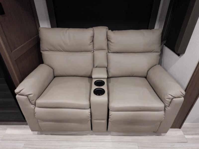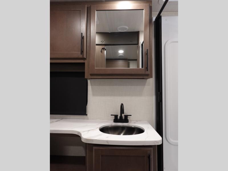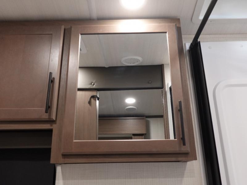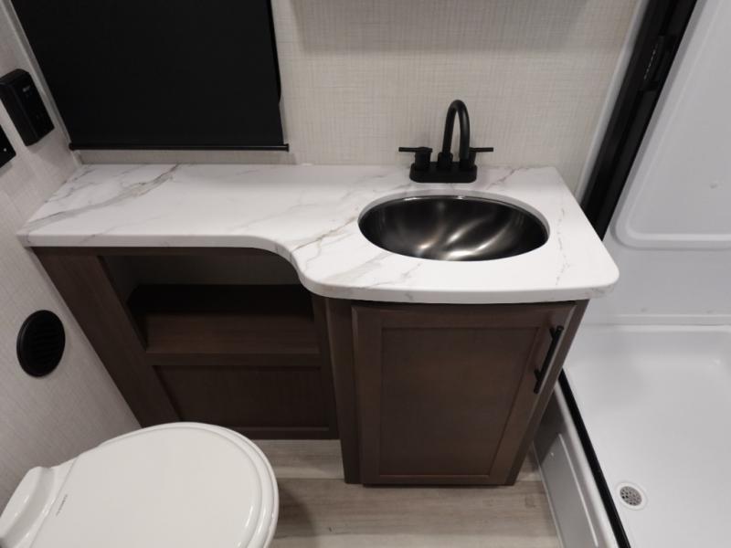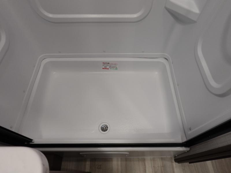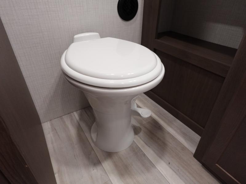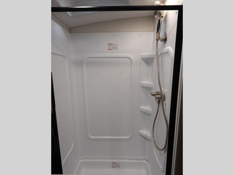 With a king-size bed, this Cougar Half-Ton travel trailer shows that you can still be comfortable even while you're away from home! The bed has drawers and nightstands on either side to keep your belongings tidy. There is a convenient shoe cubby right as you enter the unit to keep this space picked up as well. Right next to the booth dinette is the pantry, and next to the pantry is the full bathroom which is certainly one of the most valuable features to any trailer.
