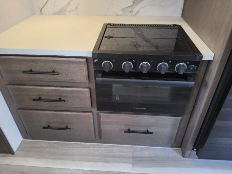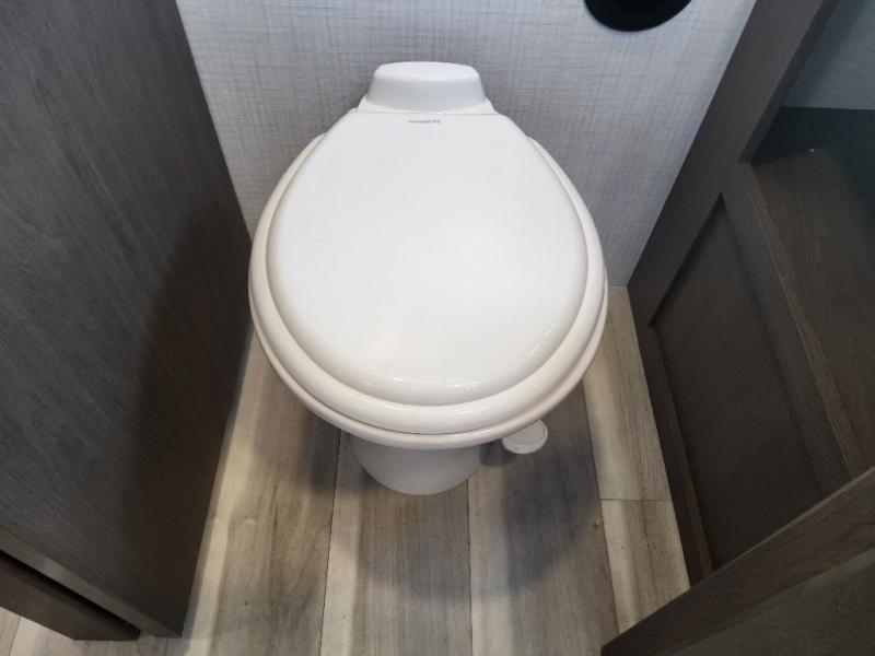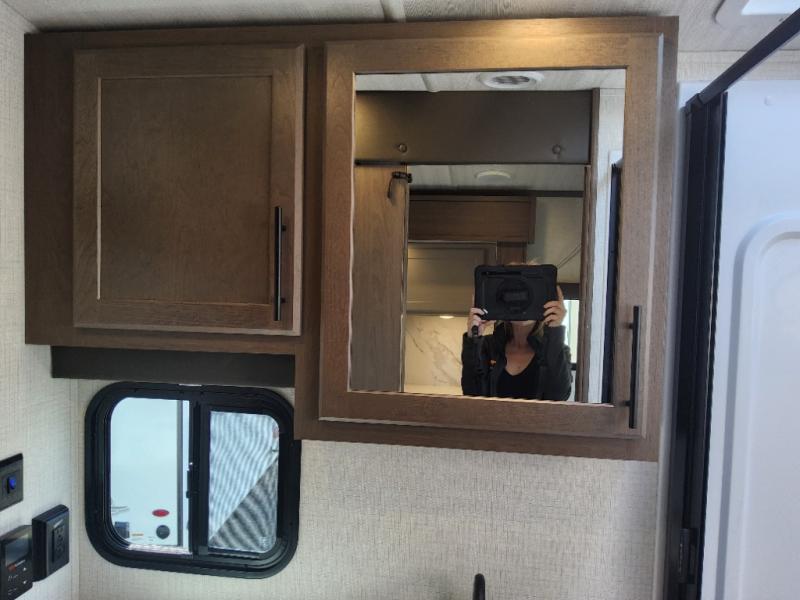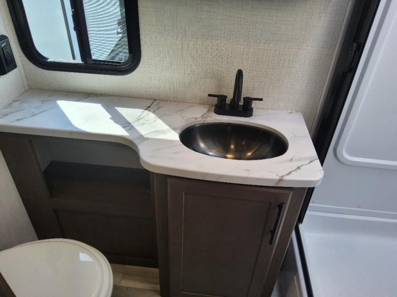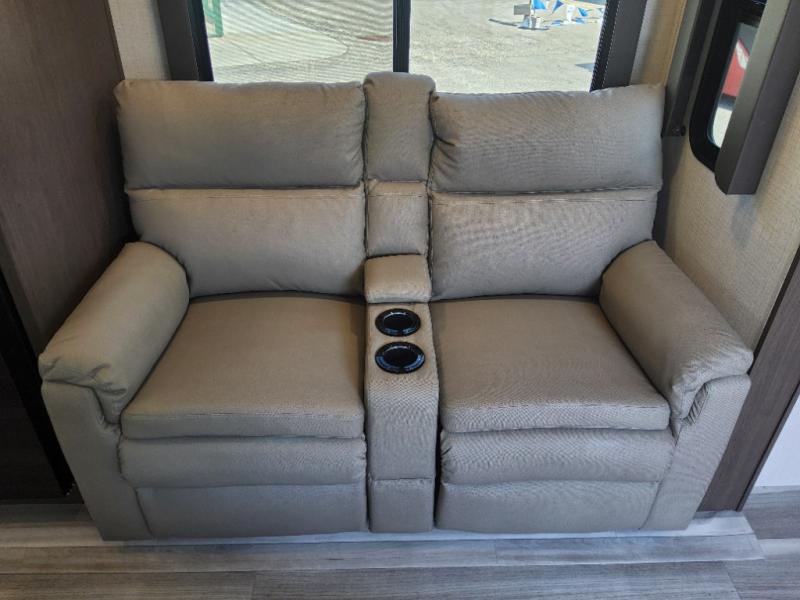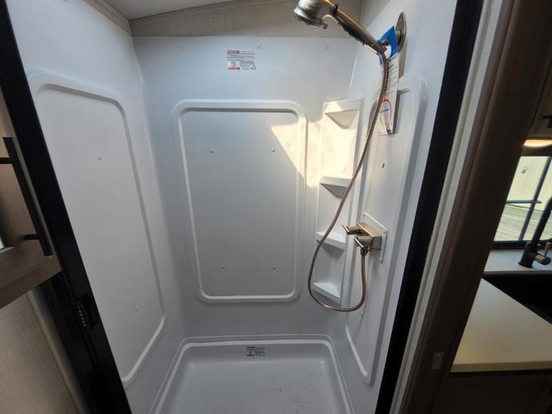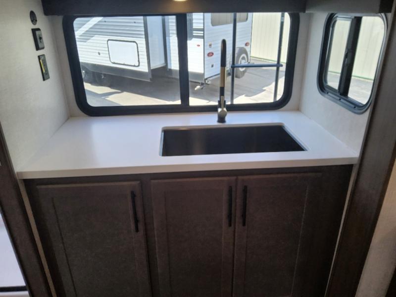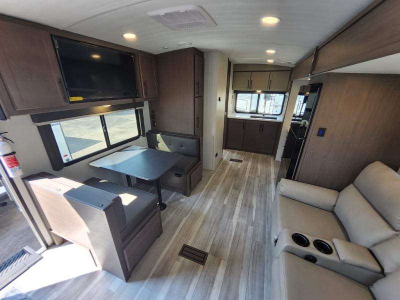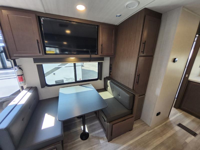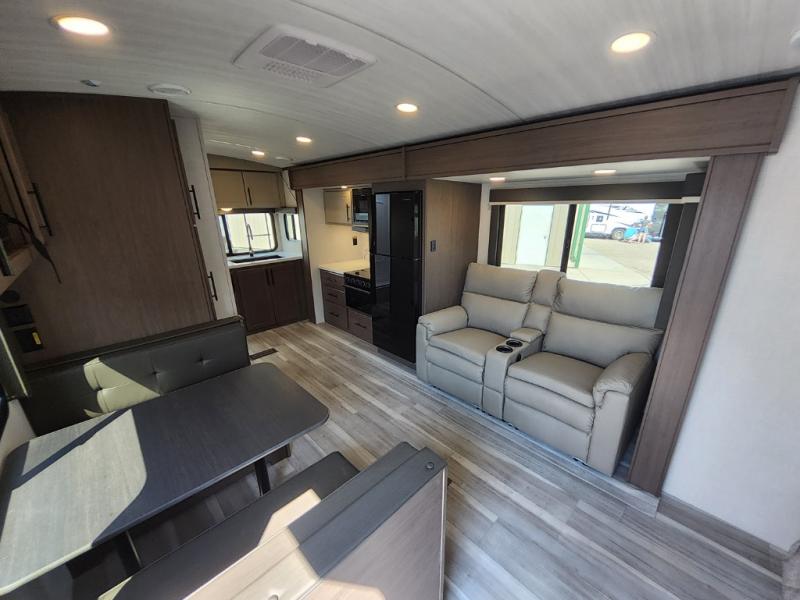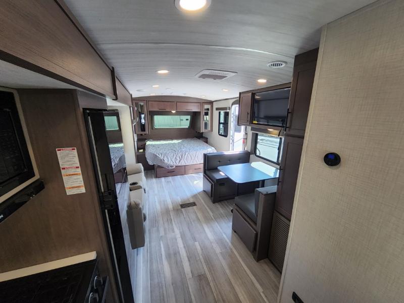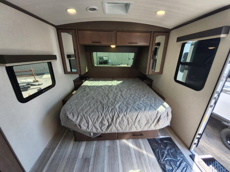 With a king-size bed, this Cougar Half-Ton travel trailer shows that you can still be comfortable even while you're away from home! The bed has drawers and nightstands on either side to keep your belongings tidy. There is a convenient shoe cubby right as you enter the unit to keep this space picked up as well. Right next to the booth dinette is the pantry, and next to the pantry is the full bathroom which is certainly one of the most valuable features to any trailer.