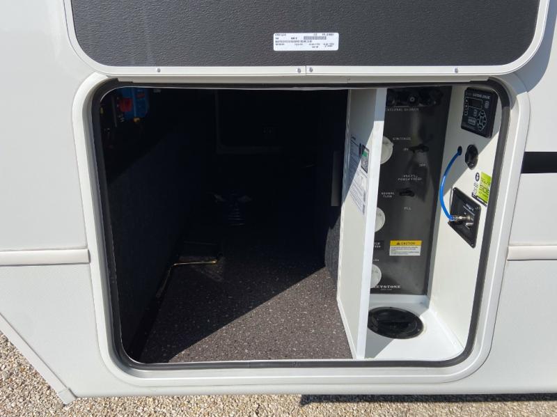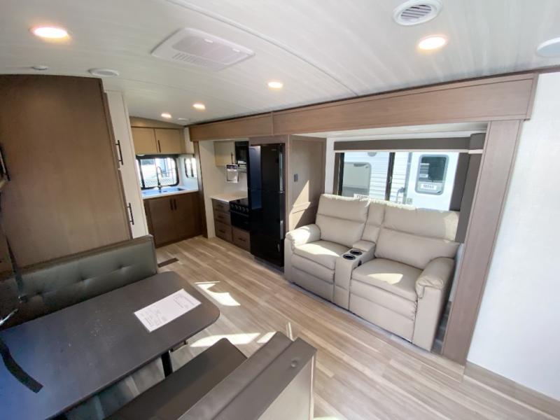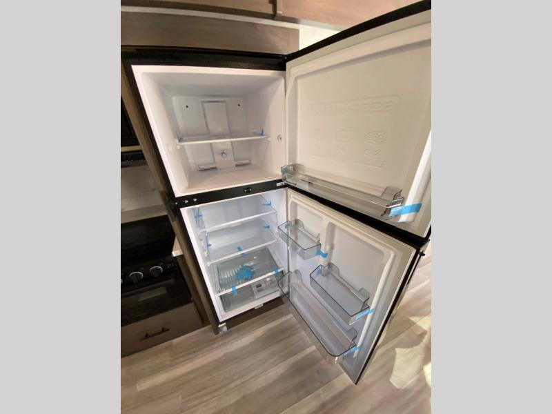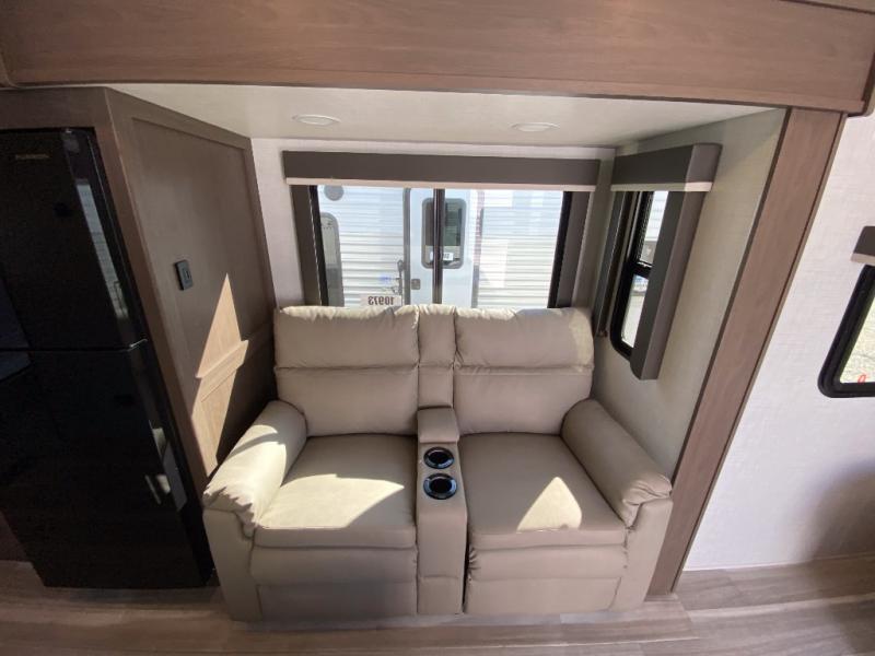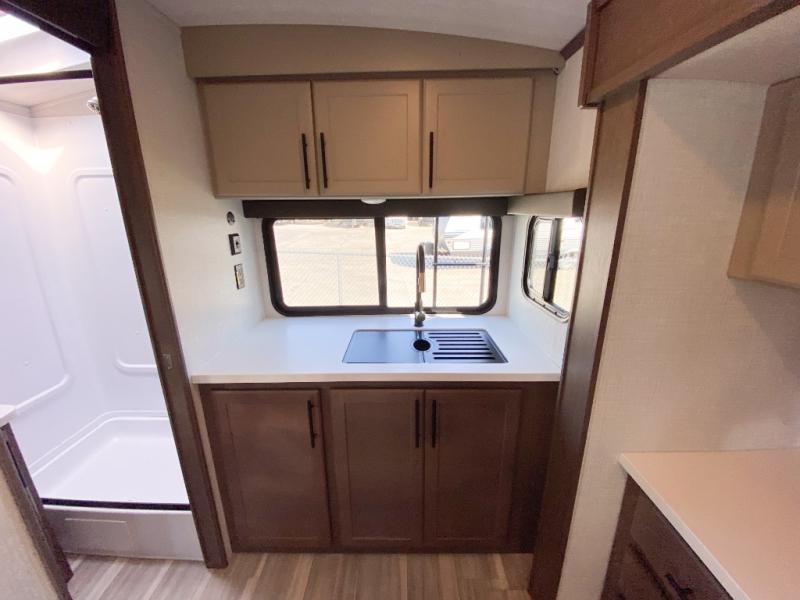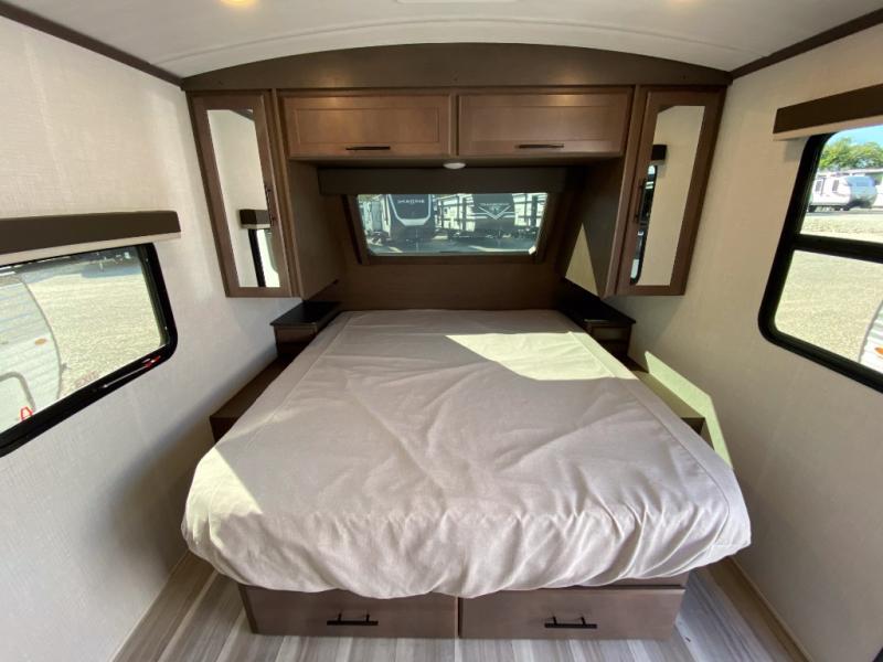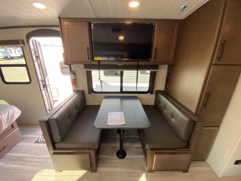 With a king-size bed, this Cougar Half-Ton travel trailer shows that you can still be comfortable even while you're away from home! The bed has drawers and nightstands on either side to keep your belongings tidy. There is a convenient shoe cubby right as you enter the unit to keep this space picked up as well. Right next to the booth dinette is the pantry, and next to the pantry is the full bathroom which is certainly one of the most valuable features to any trailer.