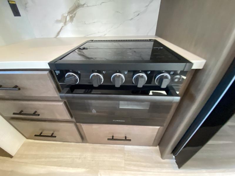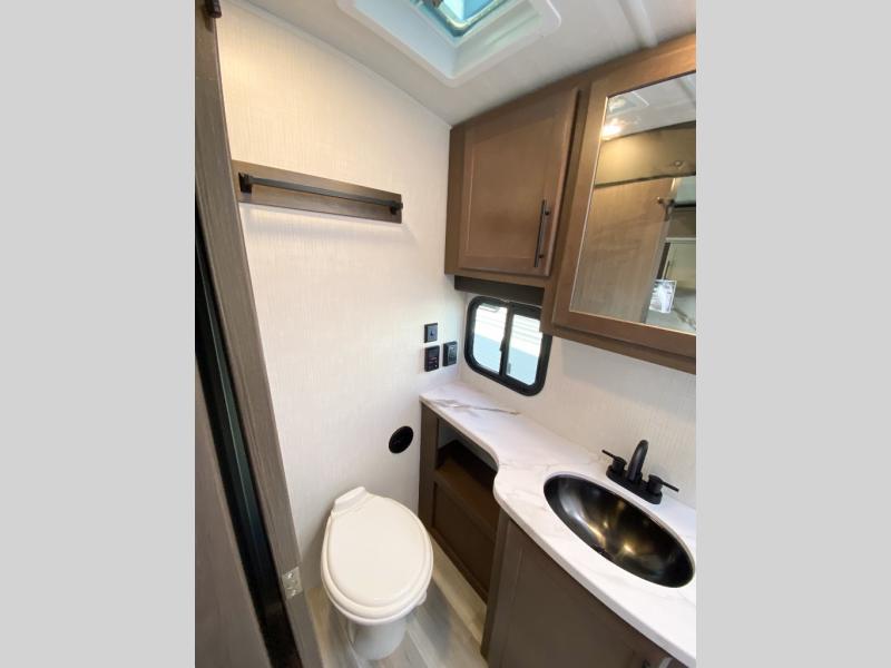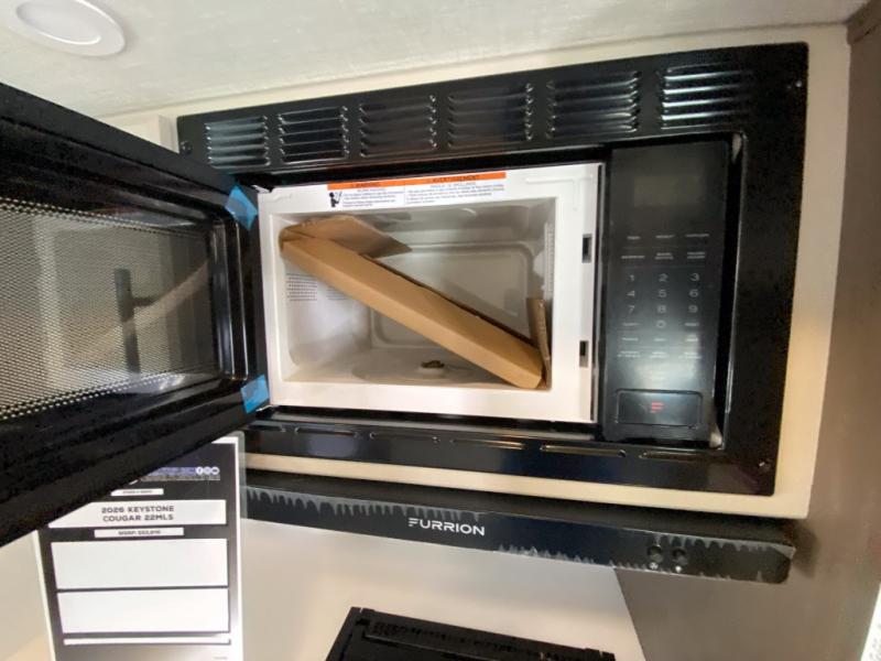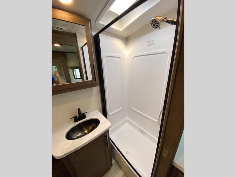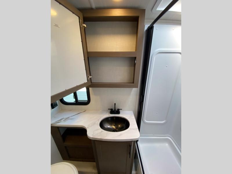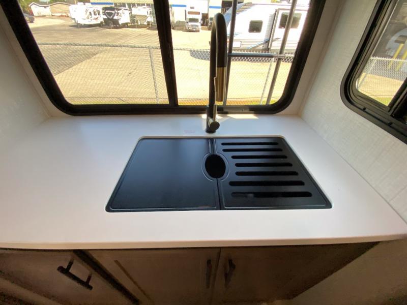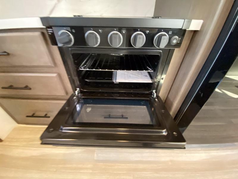 With a king-size bed, this Cougar Half-Ton travel trailer shows that you can still be comfortable even while you're away from home! The bed has drawers and nightstands on either side to keep your belongings tidy. There is a convenient shoe cubby right as you enter the unit to keep this space picked up as well. Right next to the booth dinette is the pantry, and next to the pantry is the full bathroom which is certainly one of the most valuable features to any trailer.