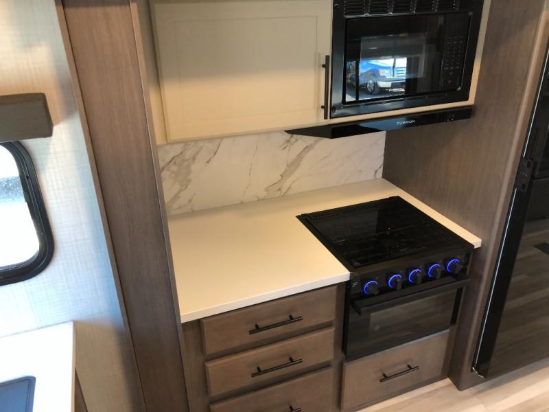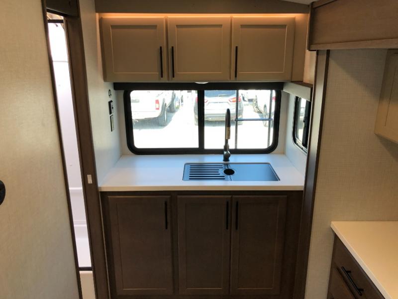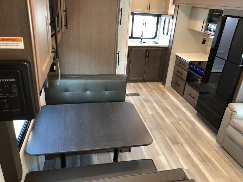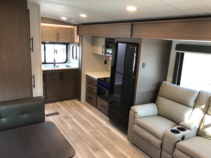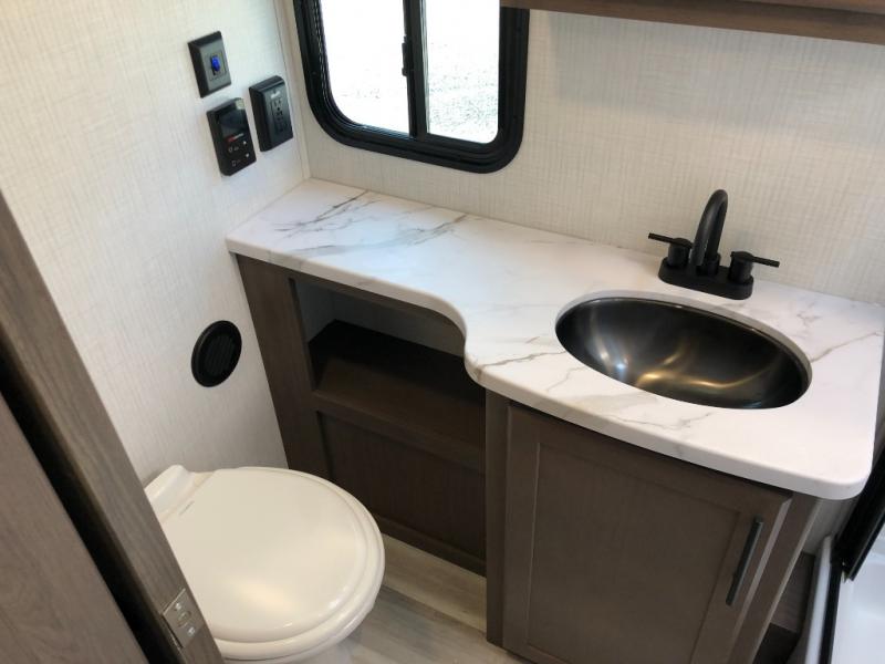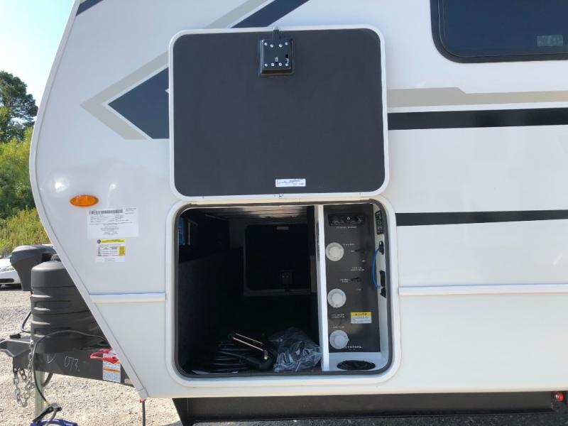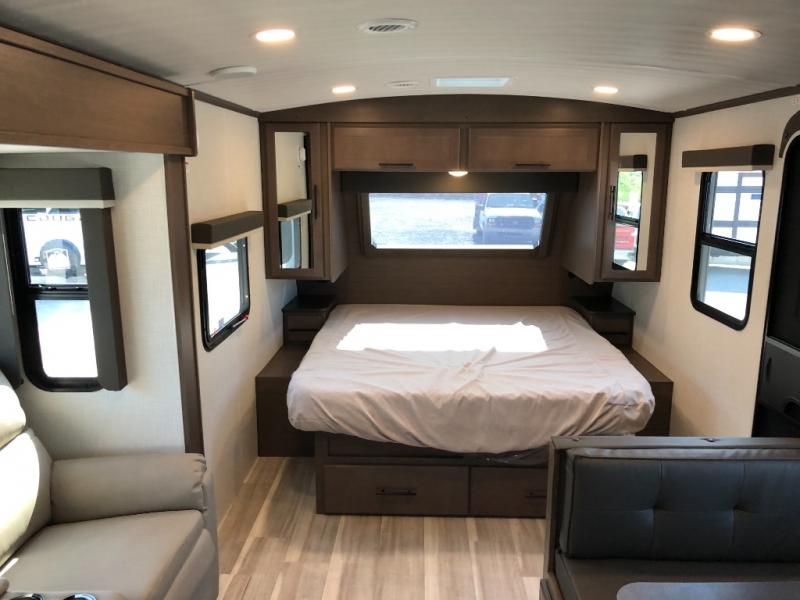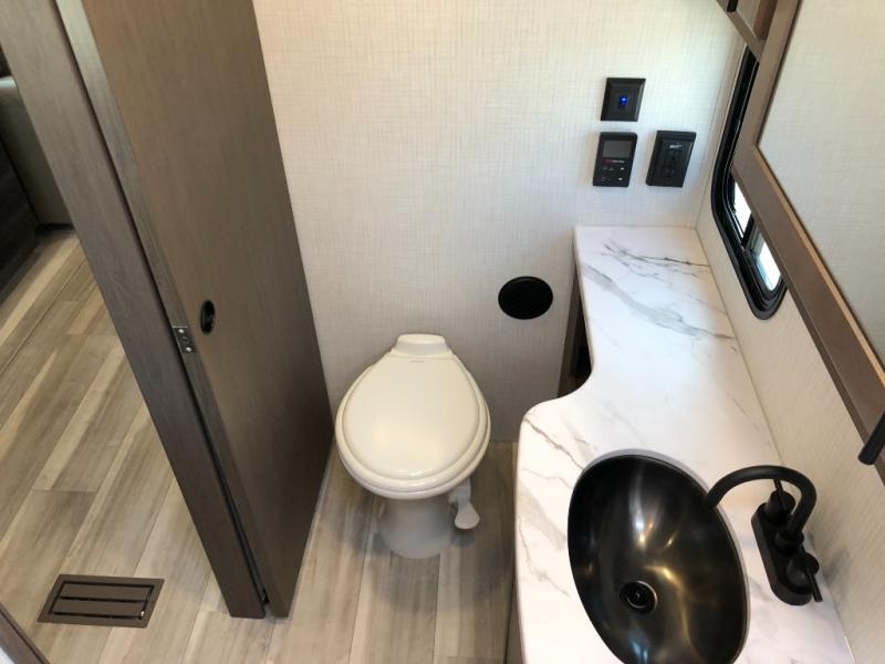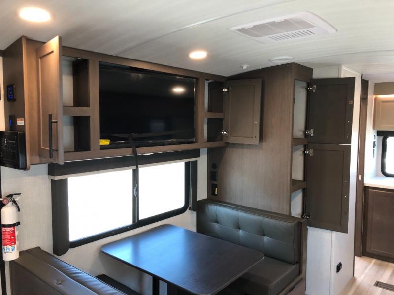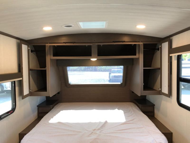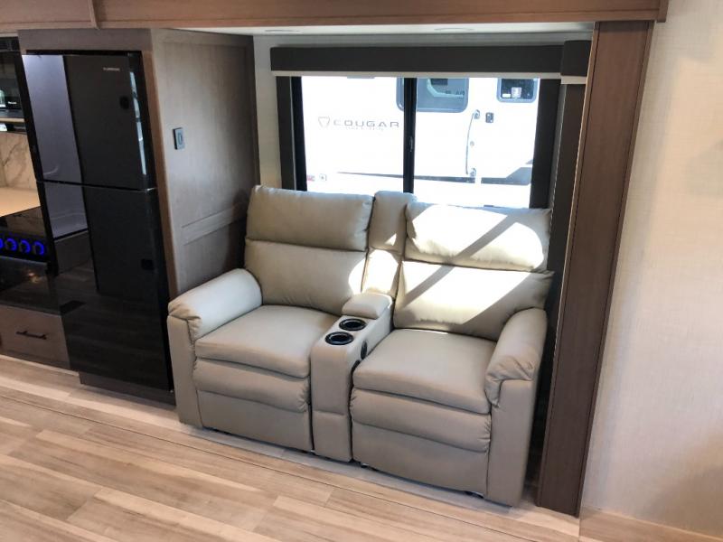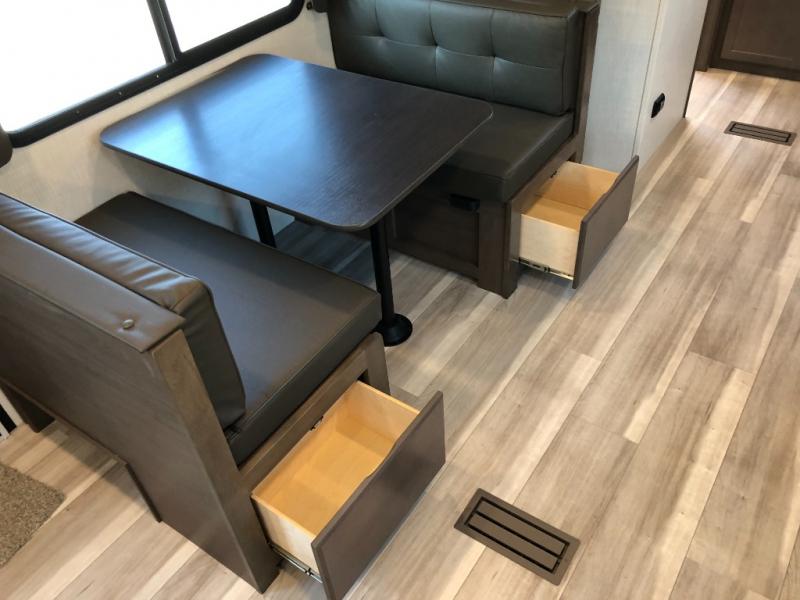 With a king-size bed, this Cougar Half-Ton travel trailer shows that you can still be comfortable even while you're away from home! The bed has drawers and nightstands on either side to keep your belongings tidy. There is a convenient shoe cubby right as you enter the unit to keep this space picked up as well. Right next to the booth dinette is the pantry, and next to the pantry is the full bathroom which is certainly one of the most valuable features to any trailer.