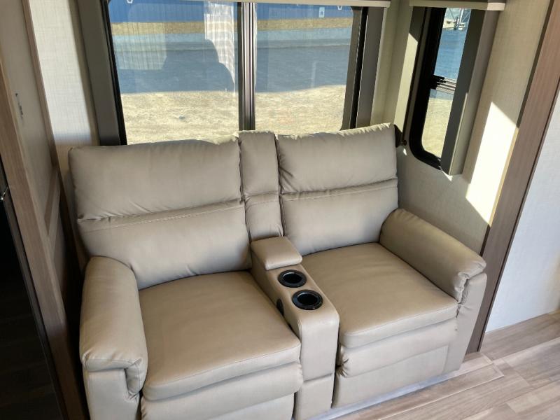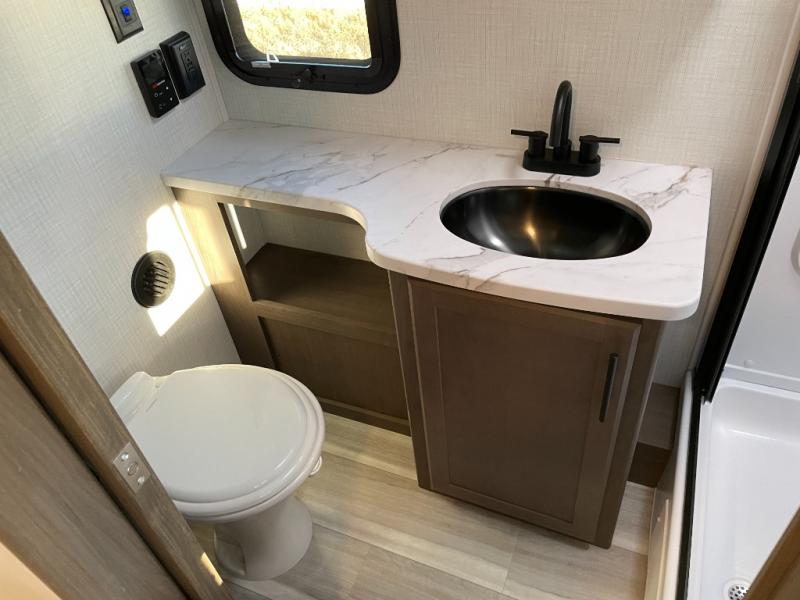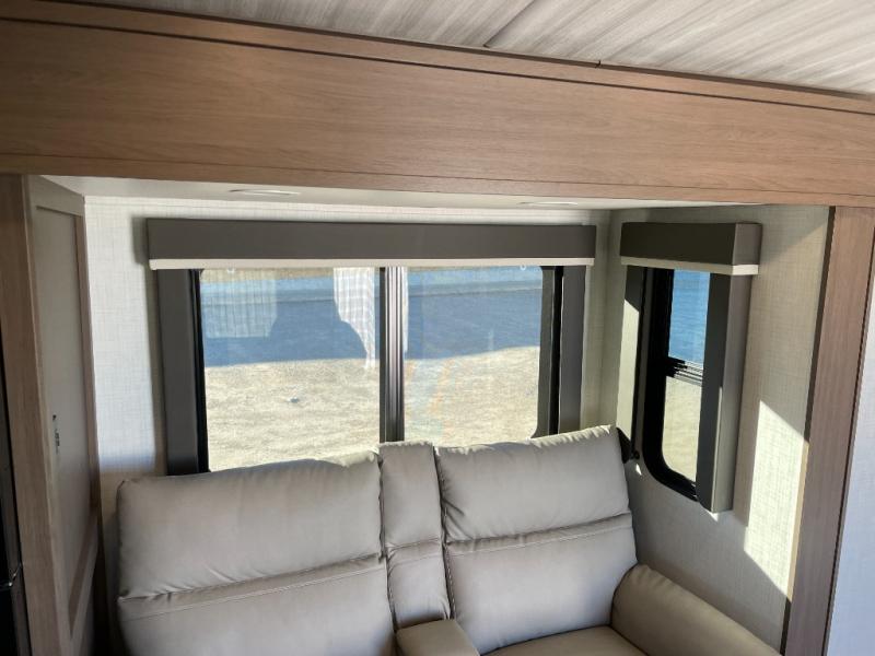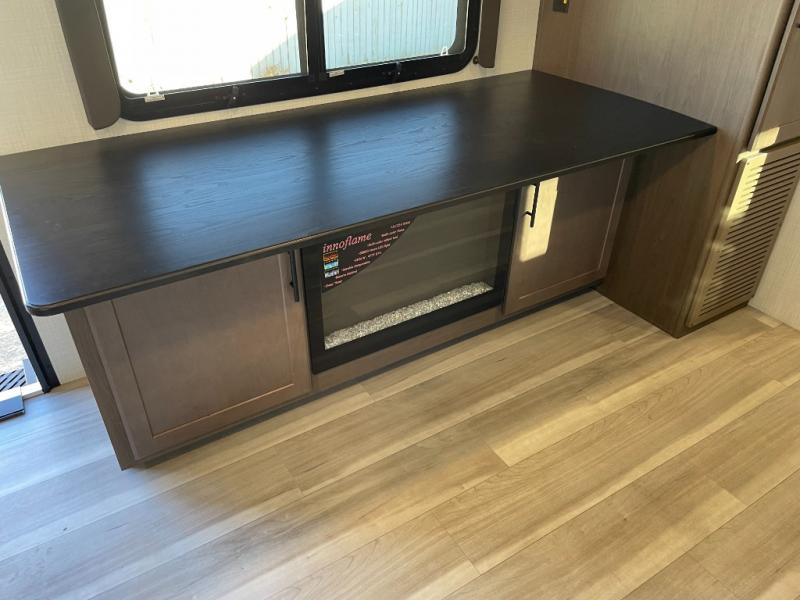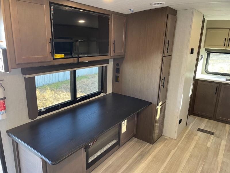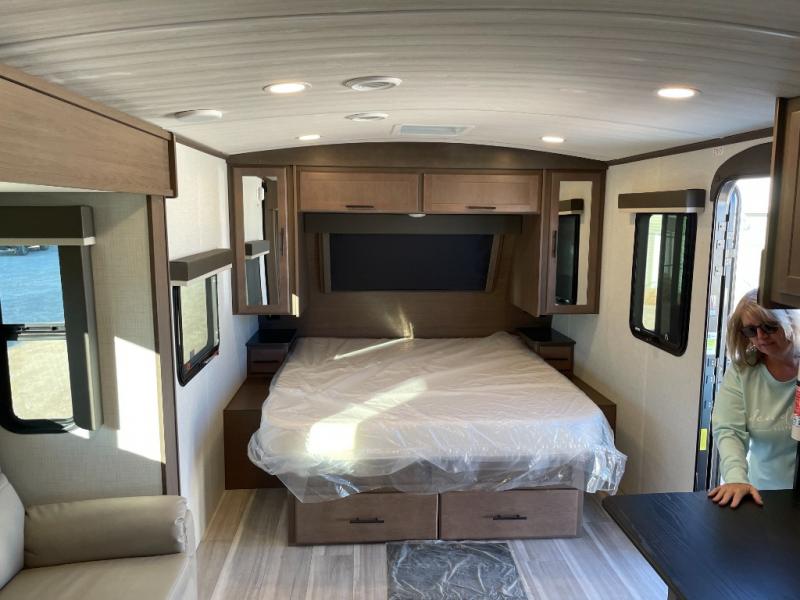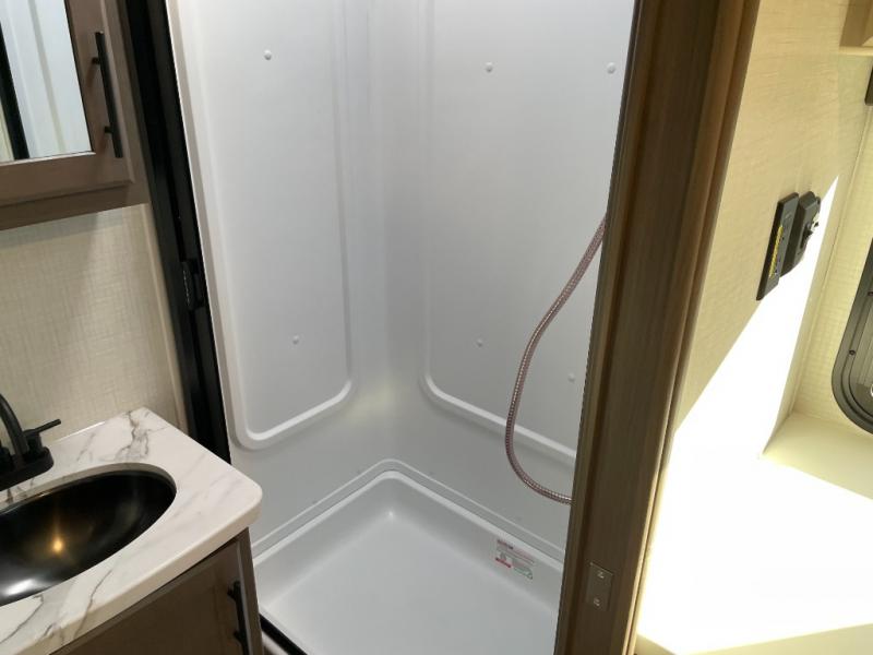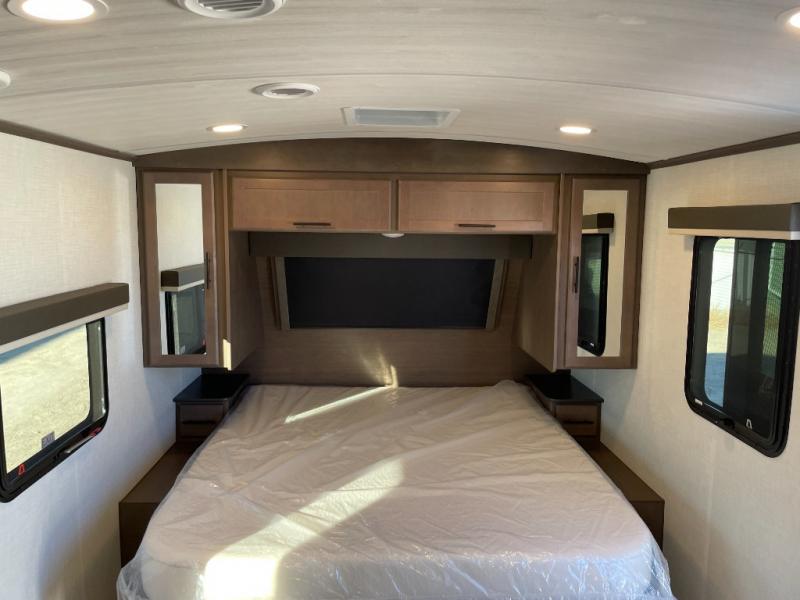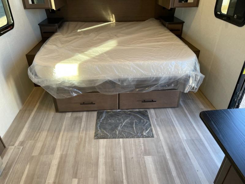 With a king-size bed, this Cougar Half-Ton travel trailer shows that you can still be comfortable even while you're away from home! The bed has drawers and nightstands on either side to keep your belongings tidy. There is a convenient shoe cubby right as you enter the unit to keep this space picked up as well. Right next to the booth dinette is the pantry, and next to the pantry is the full bathroom which is certainly one of the most valuable features to any trailer.