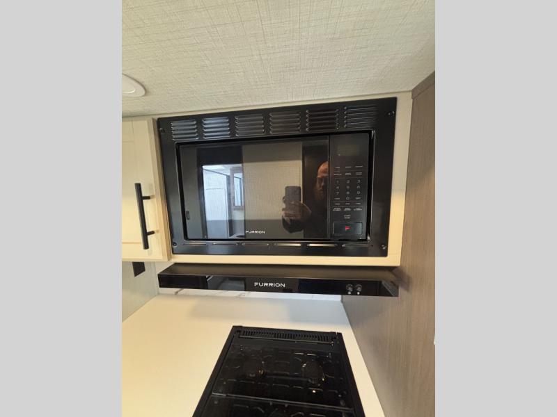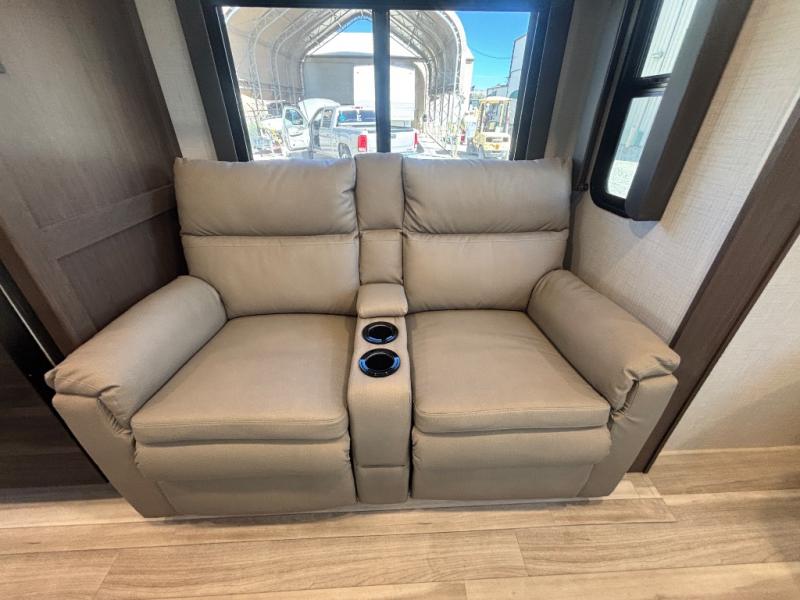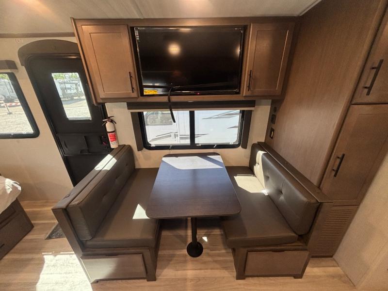 With a king-size bed, this Cougar Half-Ton travel trailer shows that you can still be comfortable even while you're away from home! The bed has drawers and nightstands on either side to keep your belongings tidy. There is a convenient shoe cubby right as you enter the unit to keep this space picked up as well. Right next to the booth dinette is the pantry, and next to the pantry is the full bathroom which is certainly one of the most valuable features to any trailer.