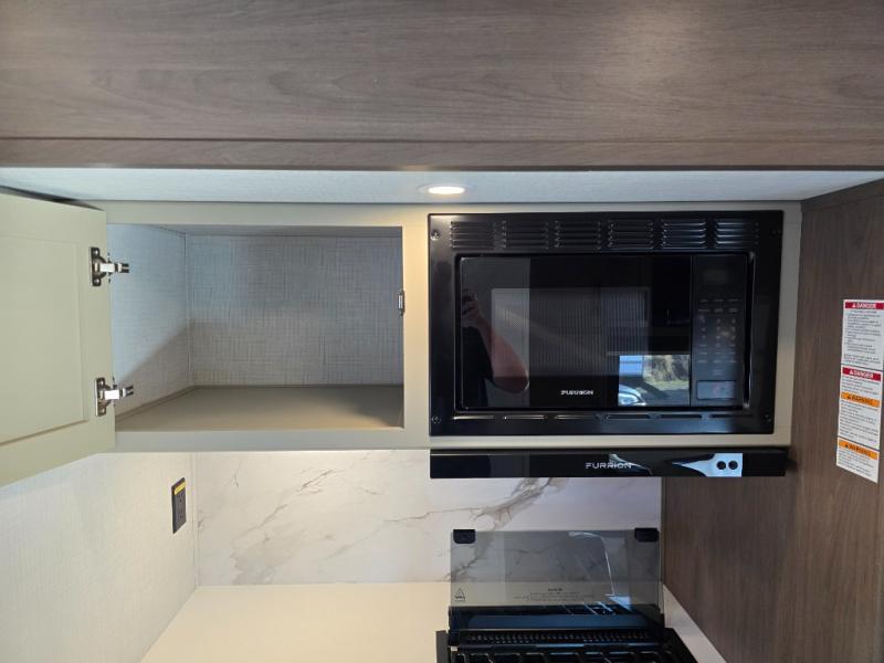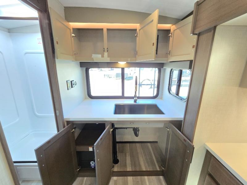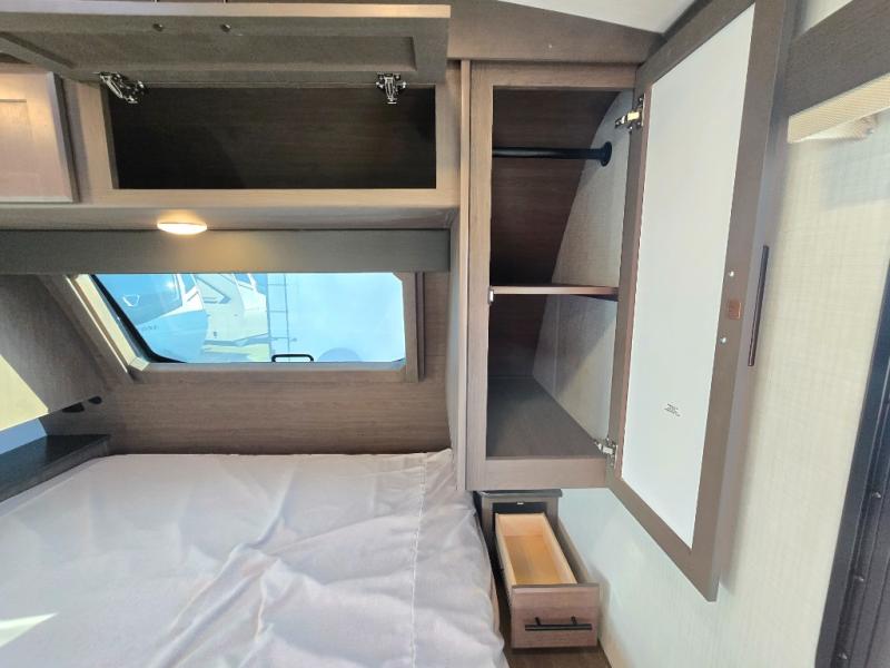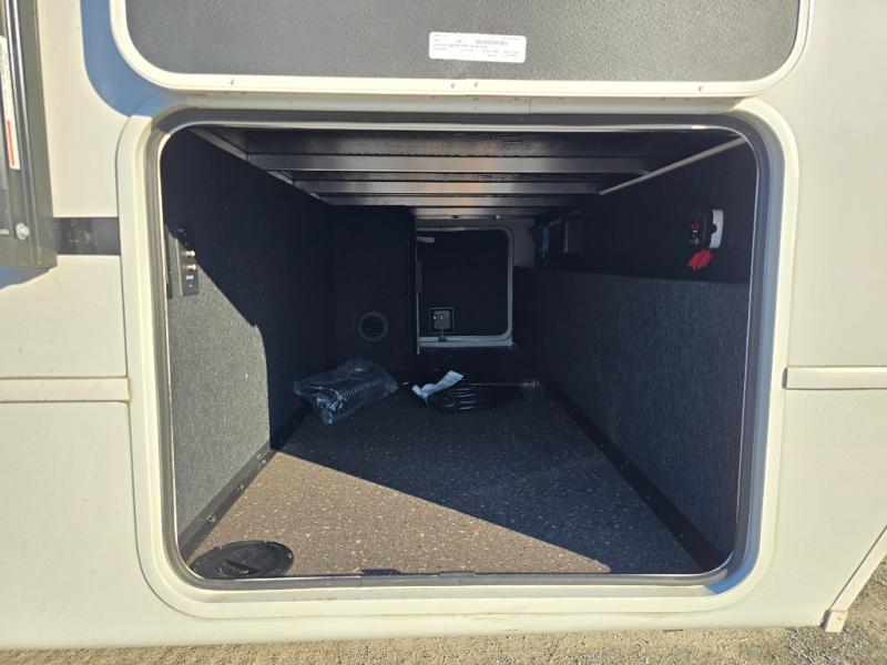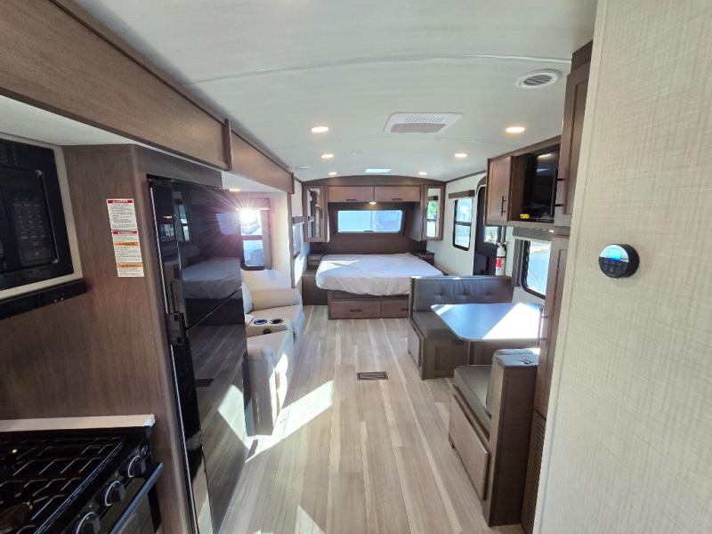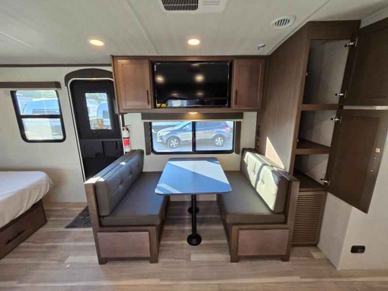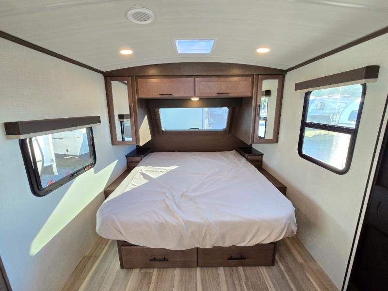 With a king-size bed, this Cougar Half-Ton travel trailer shows that you can still be comfortable even while you're away from home! The bed has drawers and nightstands on either side to keep your belongings tidy. There is a convenient shoe cubby right as you enter the unit to keep this space picked up as well. Right next to the booth dinette is the pantry, and next to the pantry is the full bathroom which is certainly one of the most valuable features to any trailer.