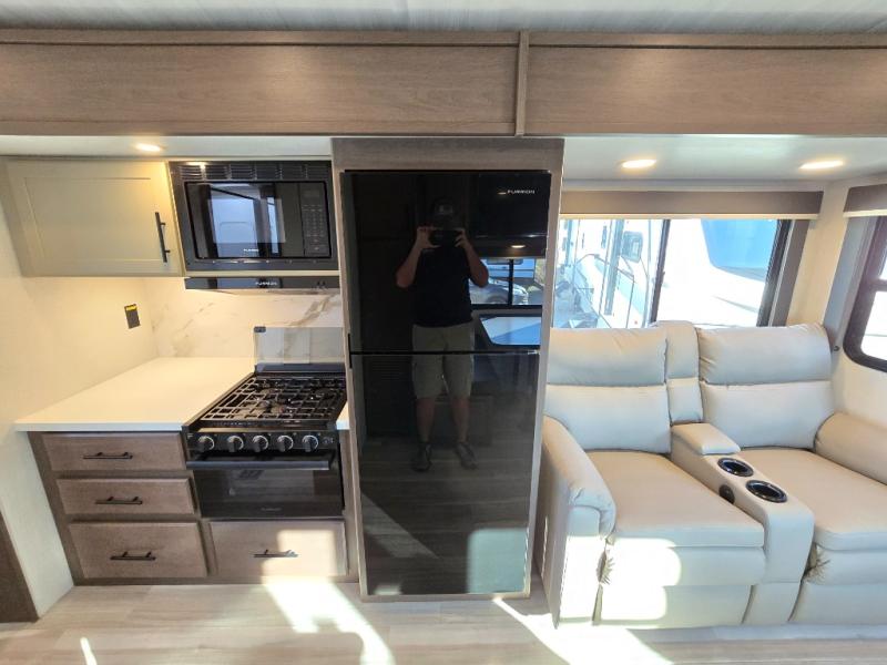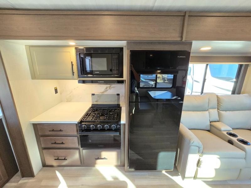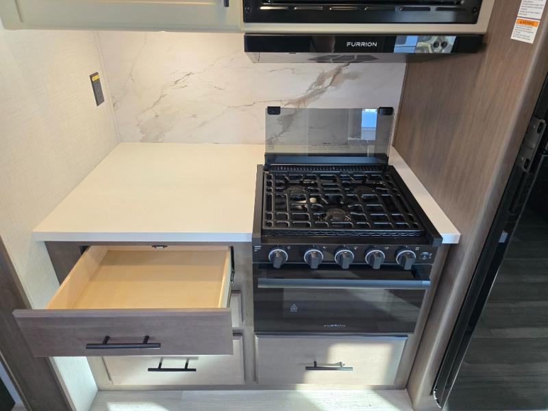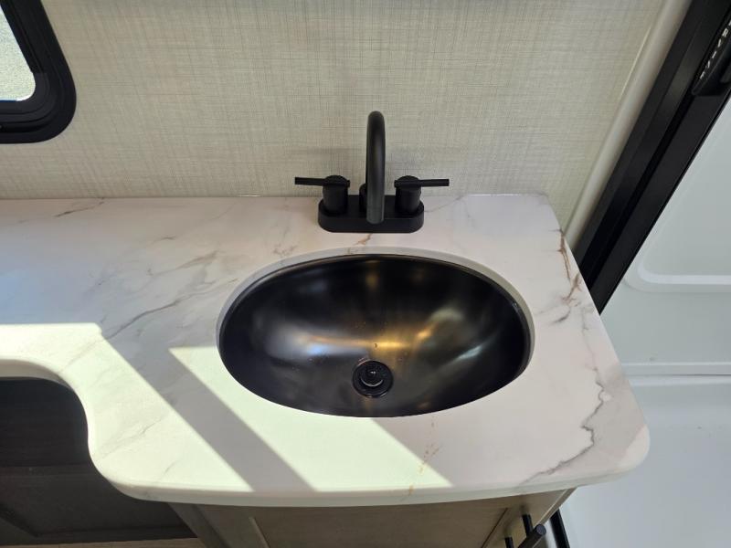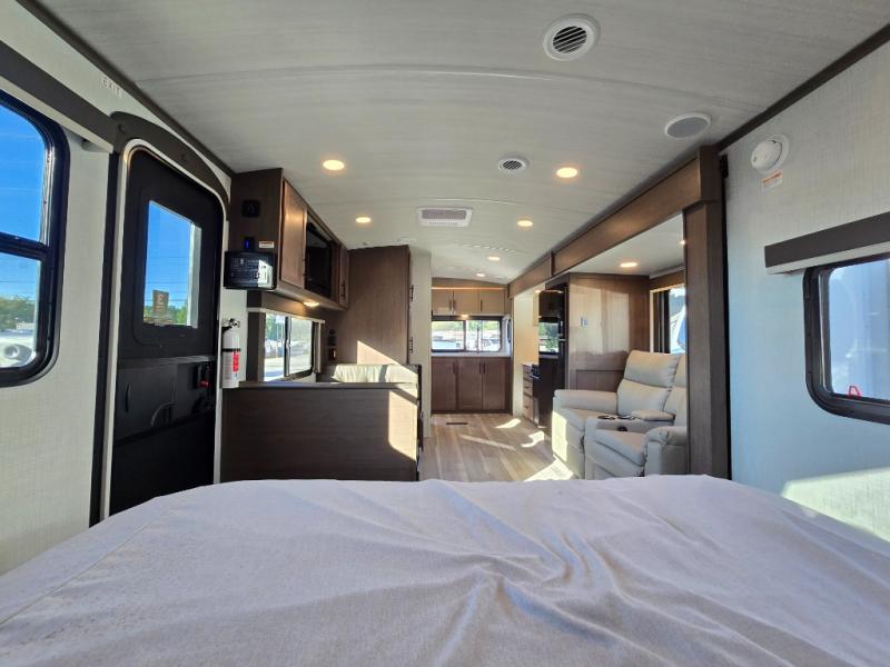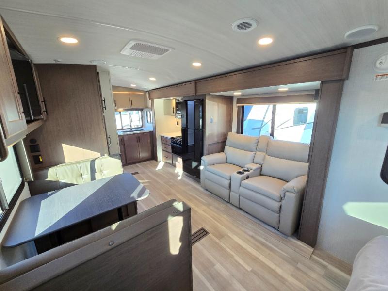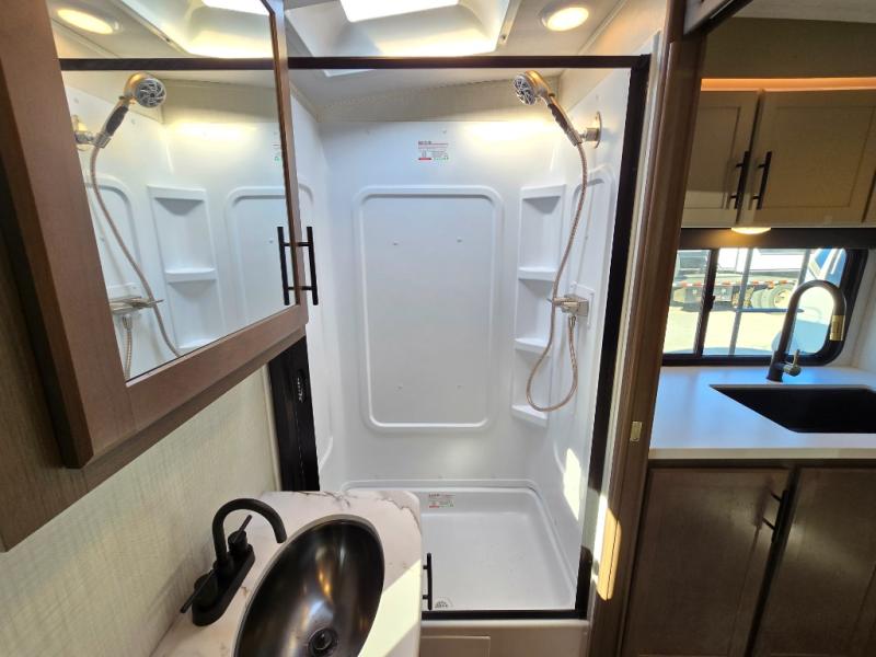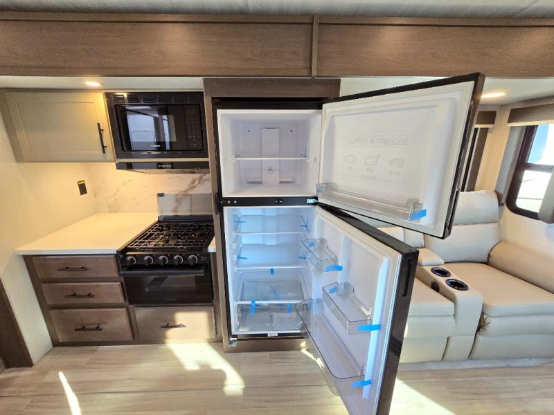 With a king-size bed, this Cougar Half-Ton travel trailer shows that you can still be comfortable even while you're away from home! The bed has drawers and nightstands on either side to keep your belongings tidy. There is a convenient shoe cubby right as you enter the unit to keep this space picked up as well. Right next to the booth dinette is the pantry, and next to the pantry is the full bathroom which is certainly one of the most valuable features to any trailer.