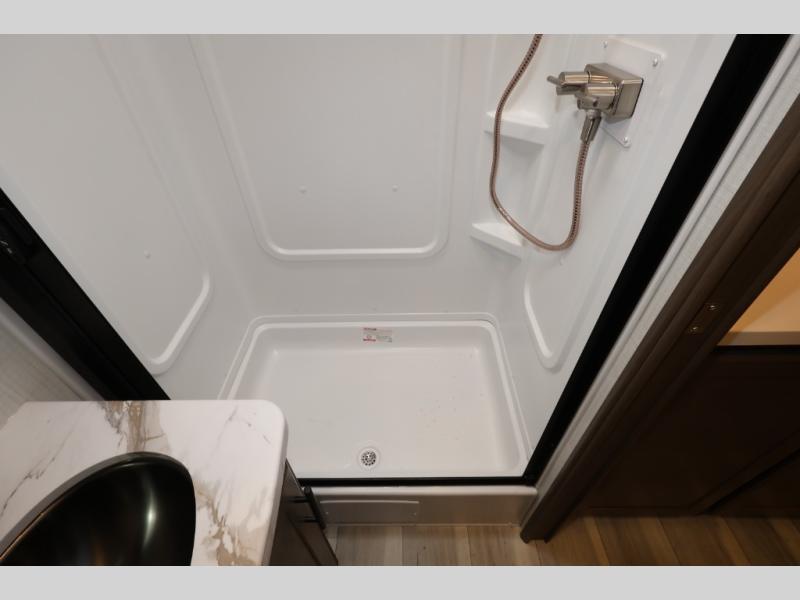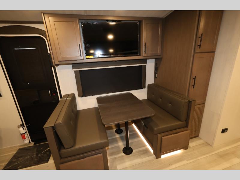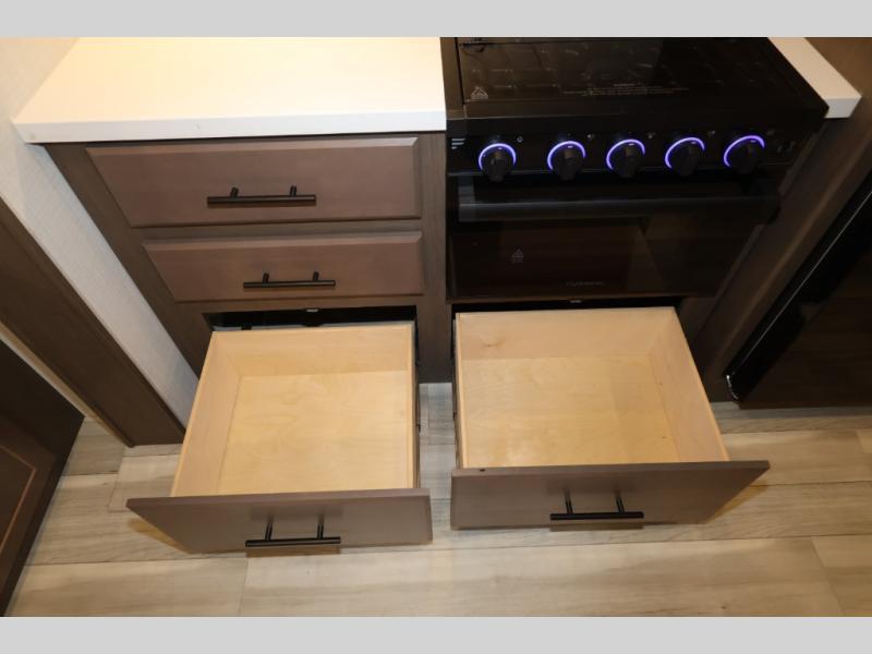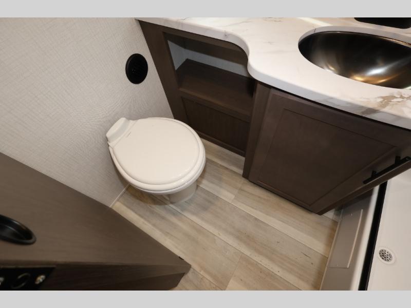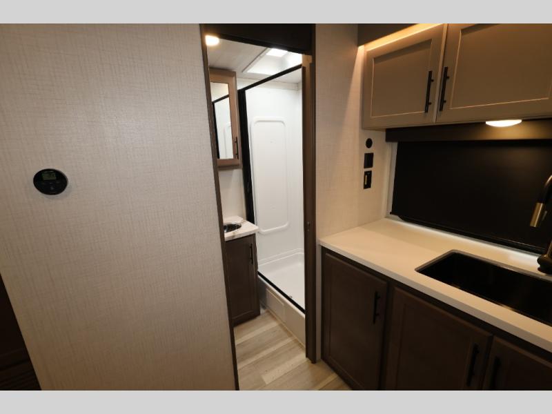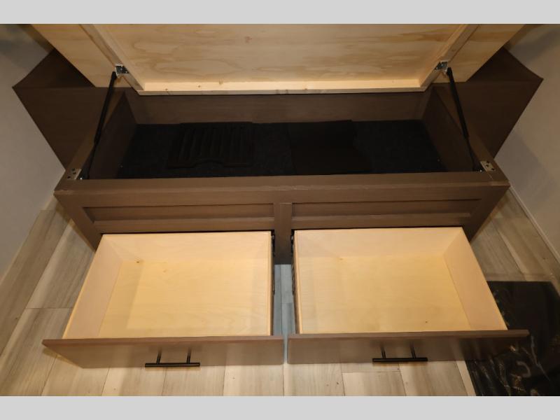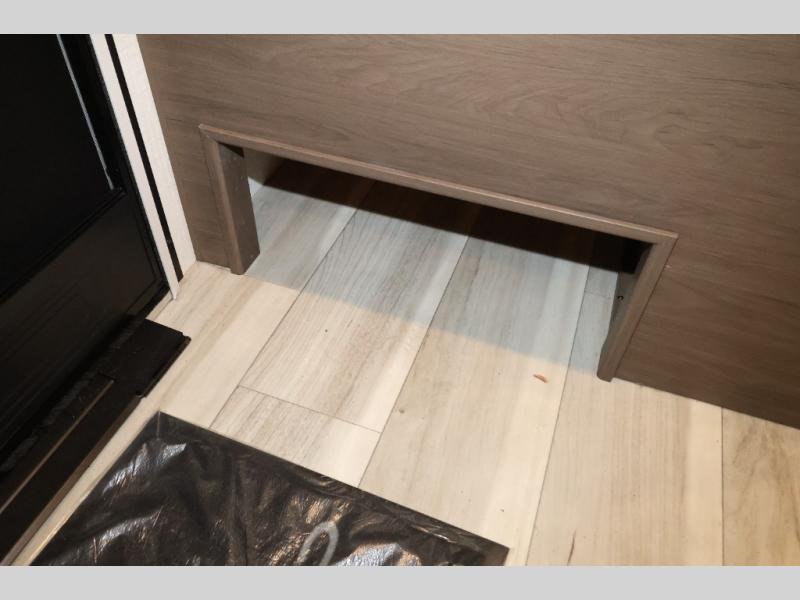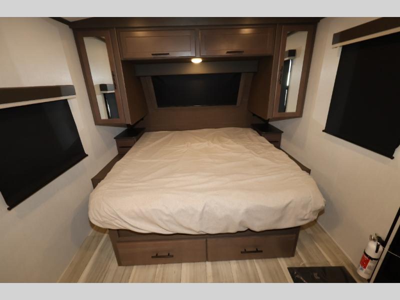 With a king-size bed, this Cougar Half-Ton travel trailer shows that you can still be comfortable even while you're away from home! The bed has drawers and nightstands on either side to keep your belongings tidy. There is a convenient shoe cubby right as you enter the unit to keep this space picked up as well. Right next to the booth dinette is the pantry, and next to the pantry is the full bathroom which is certainly one of the most valuable features to any trailer.