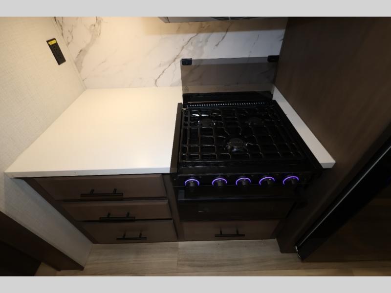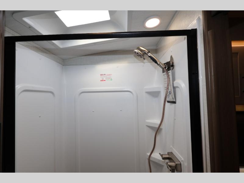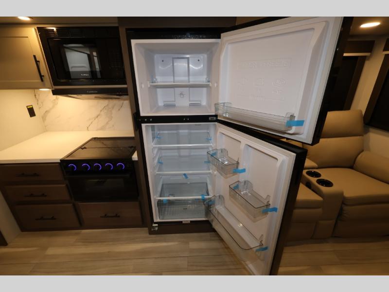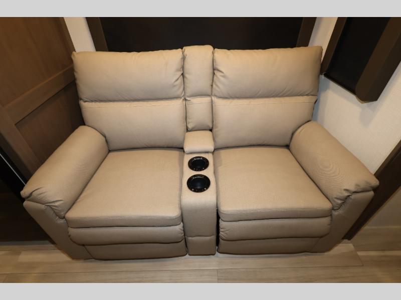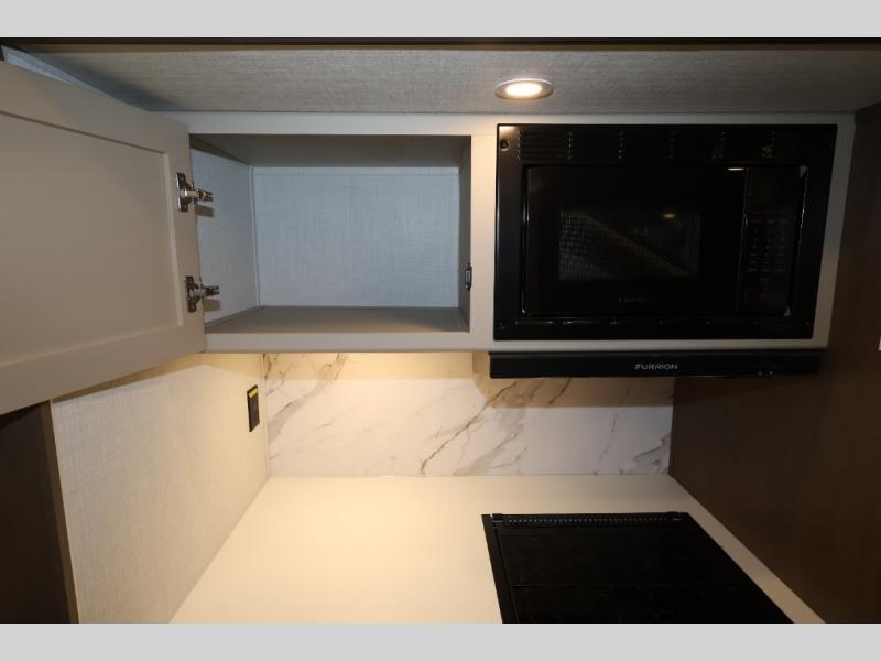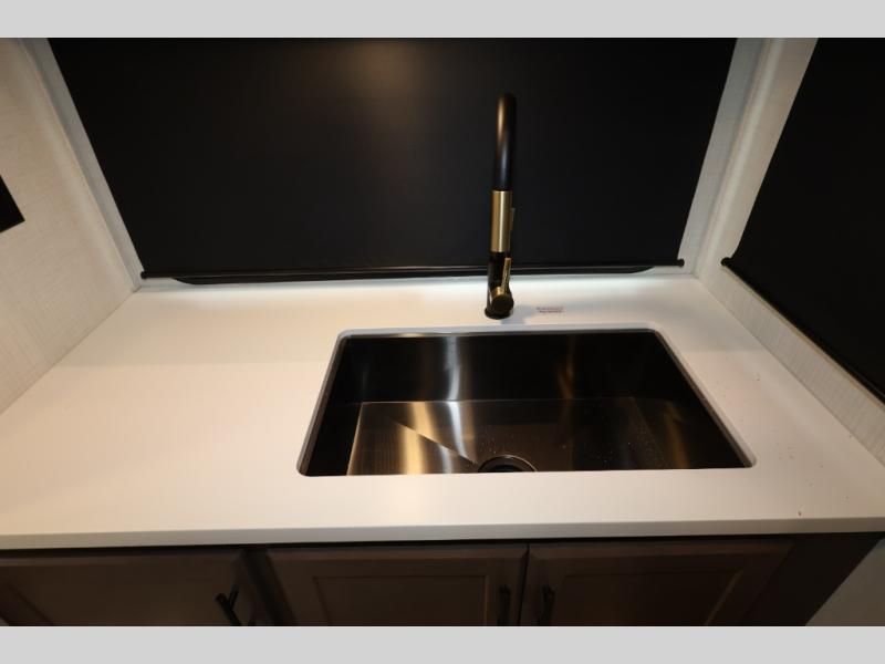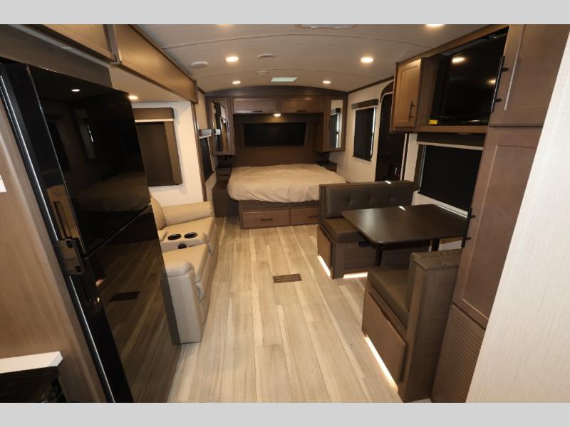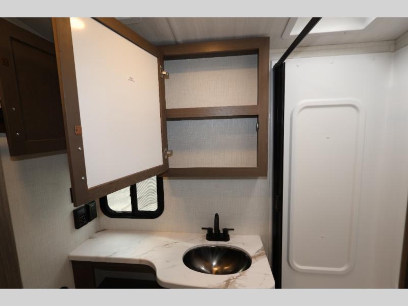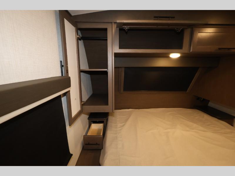 With a king-size bed, this Cougar Half-Ton travel trailer shows that you can still be comfortable even while you're away from home! The bed has drawers and nightstands on either side to keep your belongings tidy. There is a convenient shoe cubby right as you enter the unit to keep this space picked up as well. Right next to the booth dinette is the pantry, and next to the pantry is the full bathroom which is certainly one of the most valuable features to any trailer.