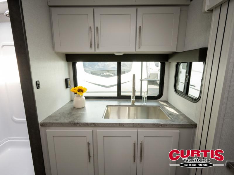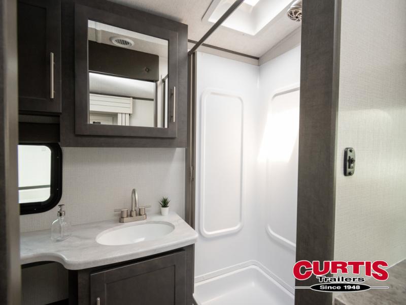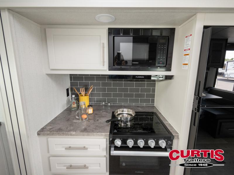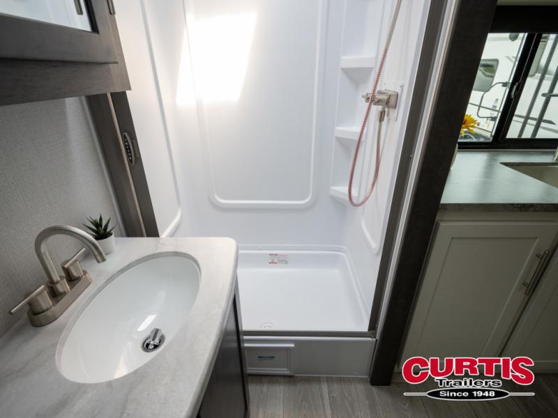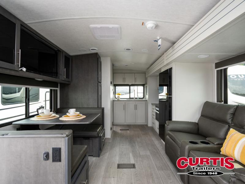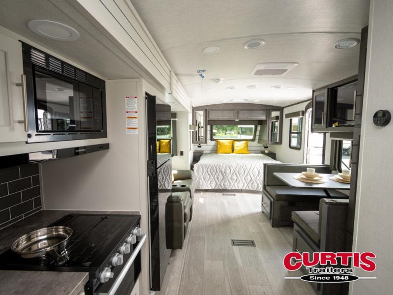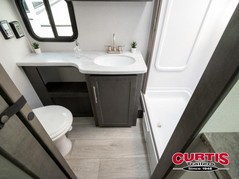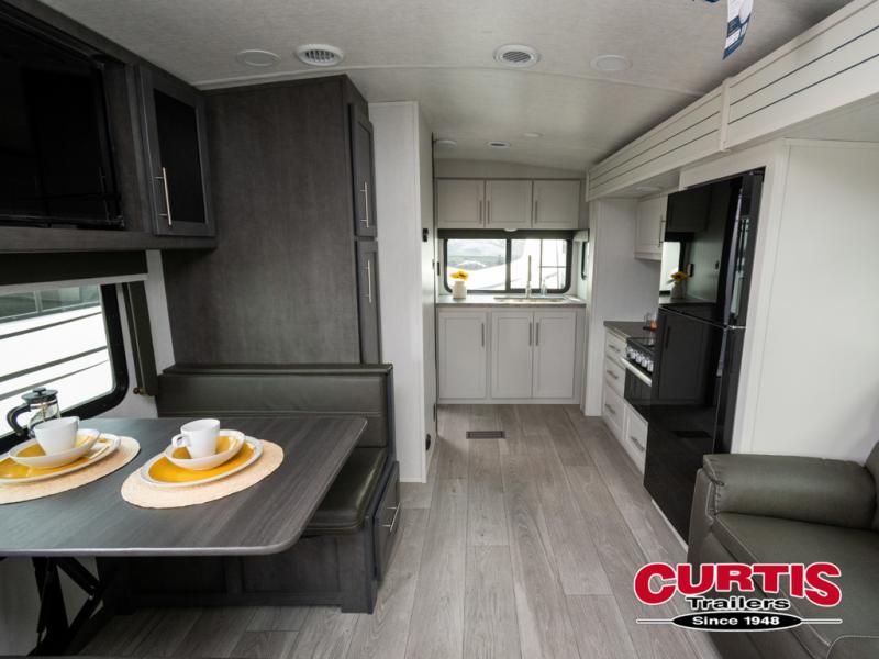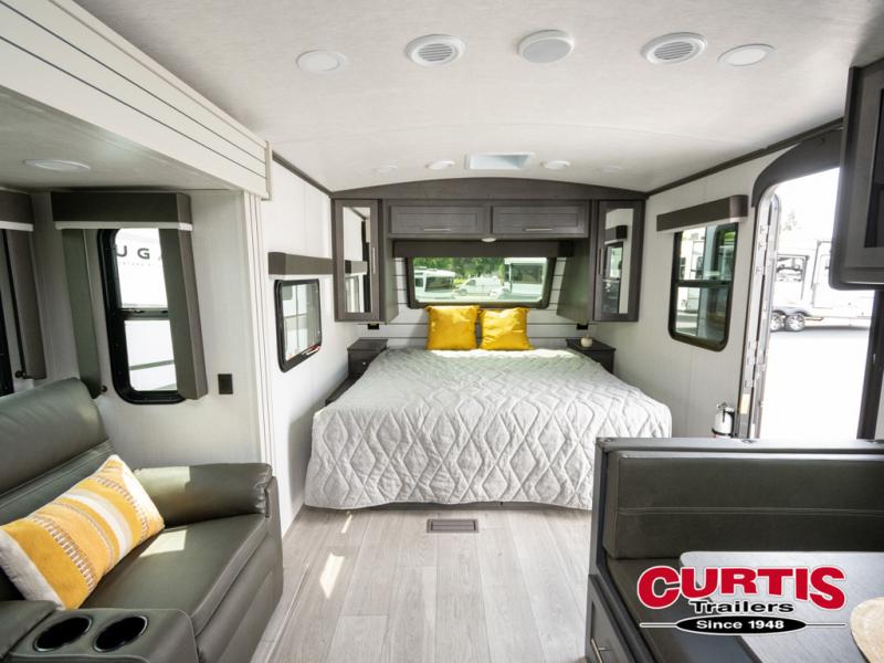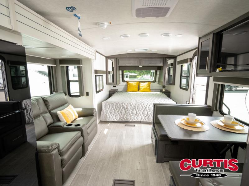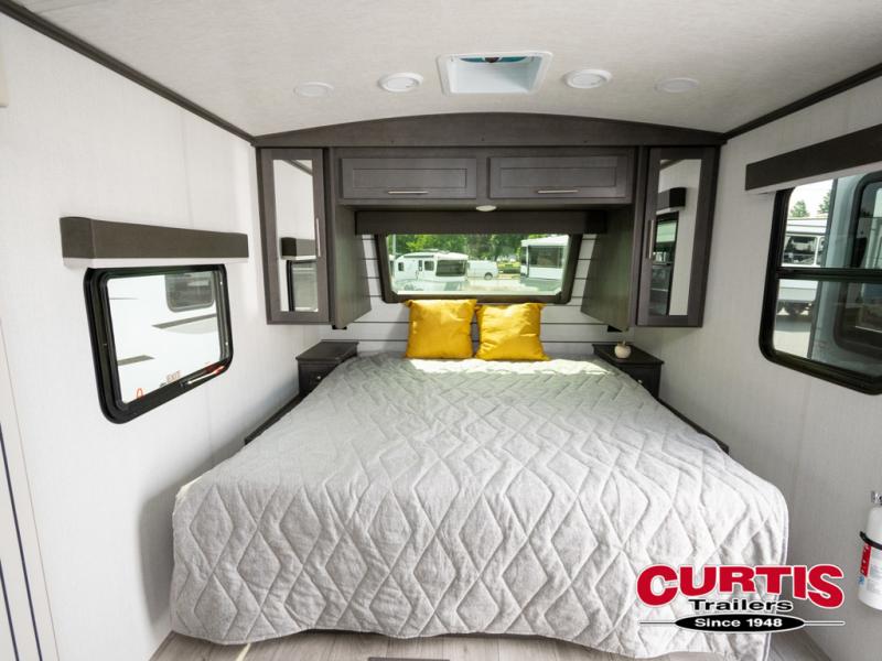 With a king-size bed, this Cougar Half-Ton travel trailer shows that you can still be comfortable even while you're away from home! The bed has drawers and nightstands on either side to keep your belongings tidy. Right next to the booth dinette is the pantry, and next to the pantry is the full bathroom which is certainly one of the most valuable features to any trailer.
