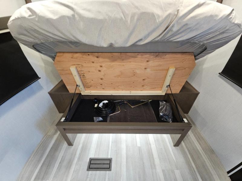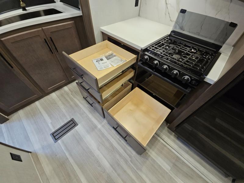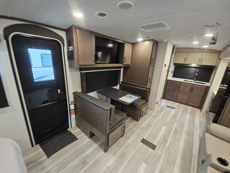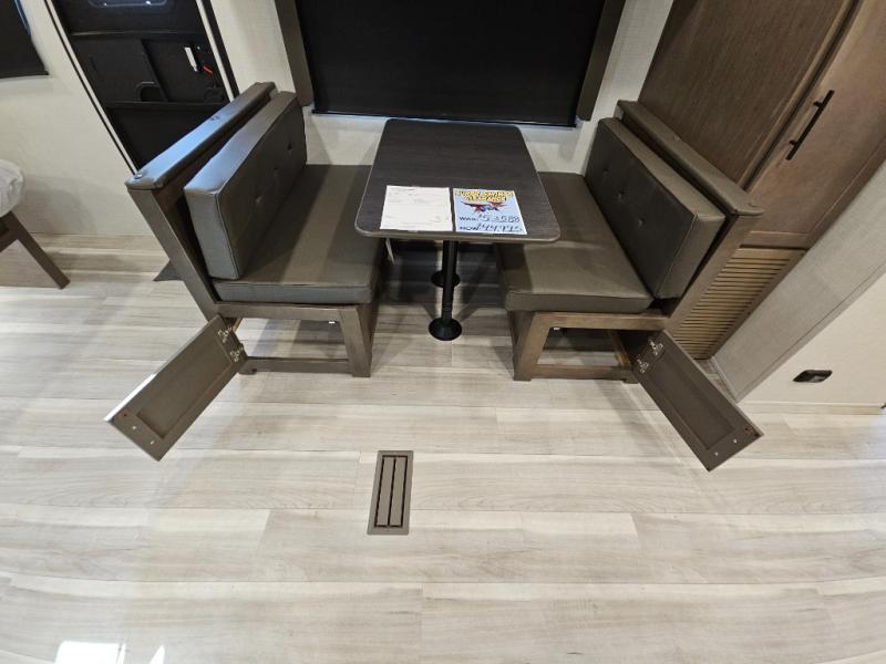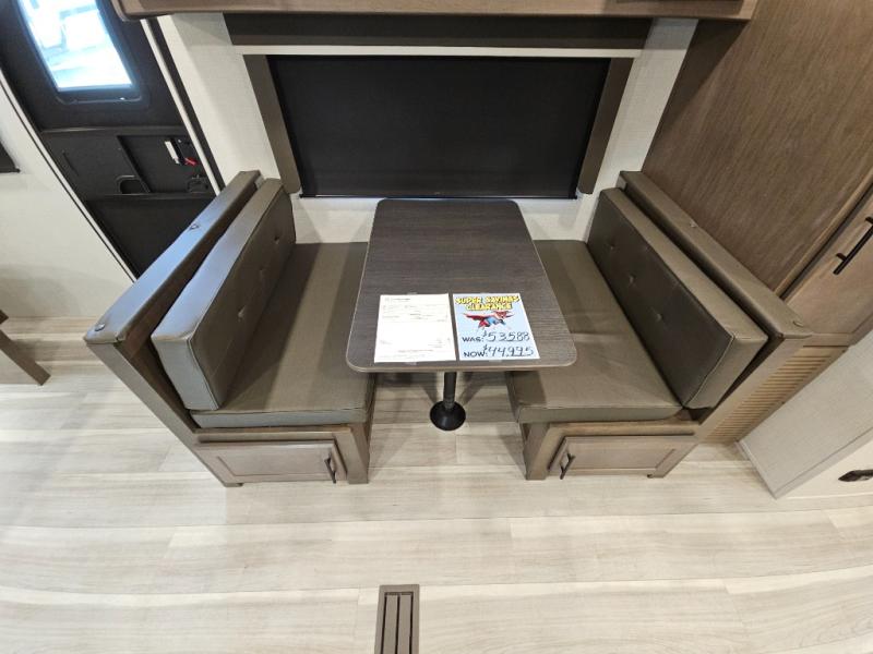 With a king-size bed, this Cougar Half-Ton travel trailer shows that you can still be comfortable even while you're away from home! The bed has drawers and nightstands on either side to keep your belongings tidy. Right next to the booth dinette is the pantry, and next to the pantry is the full bathroom which is certainly one of the most valuable features to any trailer.
