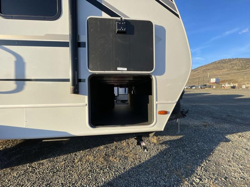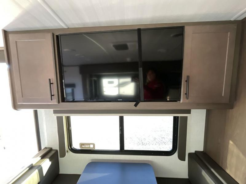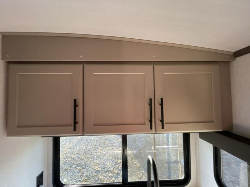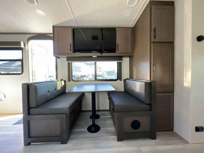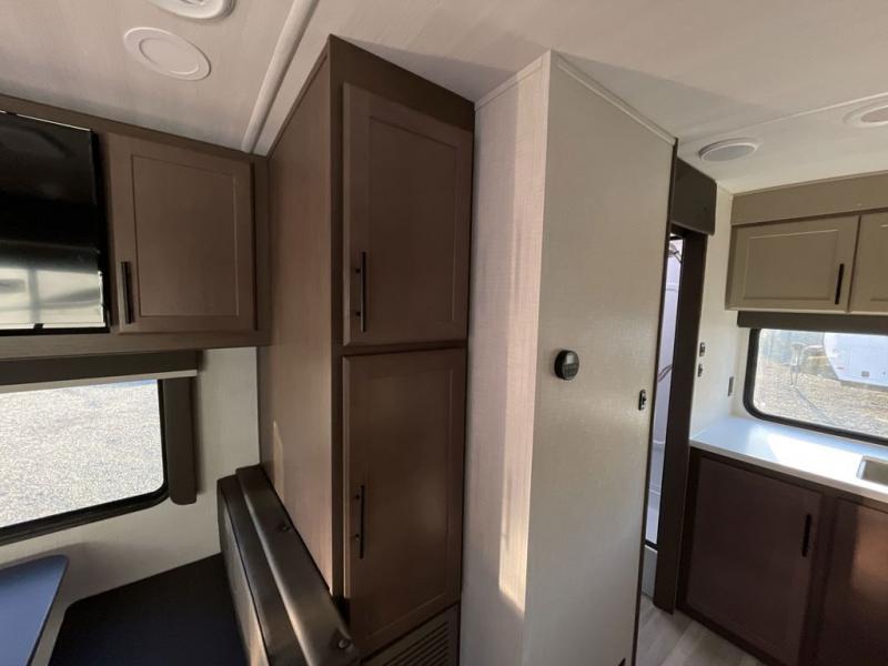 With a king-size bed, this Cougar Half-Ton travel trailer shows that you can still be comfortable even while you're away from home! The bed has drawers and nightstands on either side to keep your belongings tidy. Right next to the booth dinette is the pantry, and next to the pantry is the full bathroom which is certainly one of the most valuable features to any trailer.