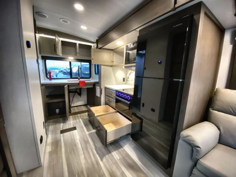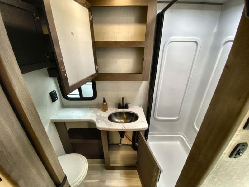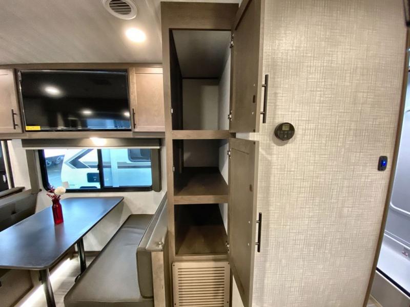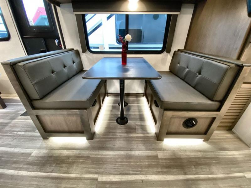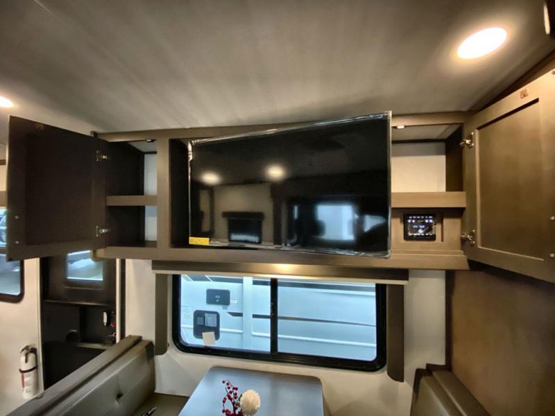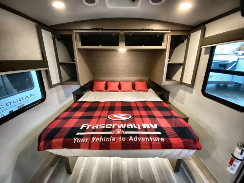 With a king-size bed, this Cougar Half-Ton travel trailer shows that you can still be comfortable even while you're away from home! The bed has drawers and nightstands on either side to keep your belongings tidy. Right next to the booth dinette is the pantry, and next to the pantry is the full bathroom which is certainly one of the most valuable features to any trailer.