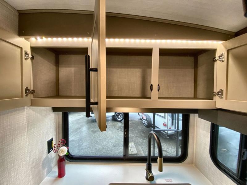With a king-size bed, this Cougar Half-Ton travel trailer shows that you can still be comfortable even while you're away from home! The bed has drawers and nightstands on either side to keep your belongings tidy. Right next to the booth dinette is the pantry, and next to the pantry is the full bathroom which is certainly one of the most valuable features to any trailer.