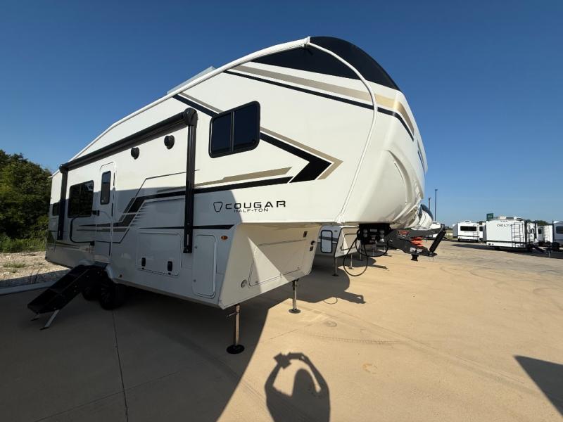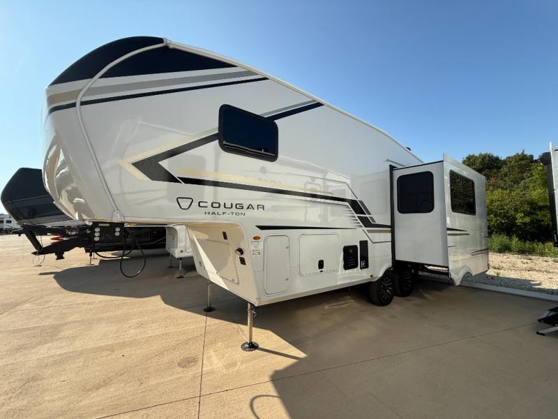 The Keystone Cougar Half-Ton fifth wheel and travel trailers are known as one of America's favorites for a reason! Some of those reasons are the exclusive features that come from Keystone, like the Winegard Air 360+ omni-directional rooftop antenna, the in-floor heating ducts, and the HyperCore composite wall construction with Vixen Fibrogloss high-gloss finish. The Cougar Half-Ton has a Climate Guard protection package with heat-deflecting white sidewalls, two roof attic vents, PEX plumbing and more to enjoy four season camping. Inside, you'll love the dimmable lighting, night roller shades throughout, shower skylight, and bedside USB outlets to keep your electronics charged.