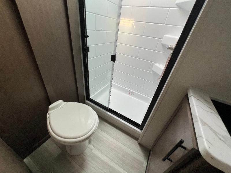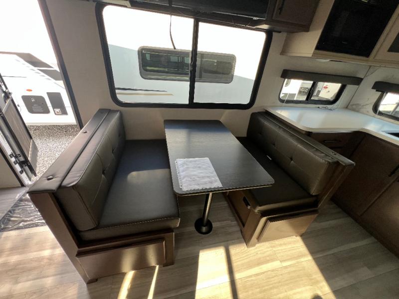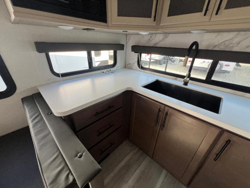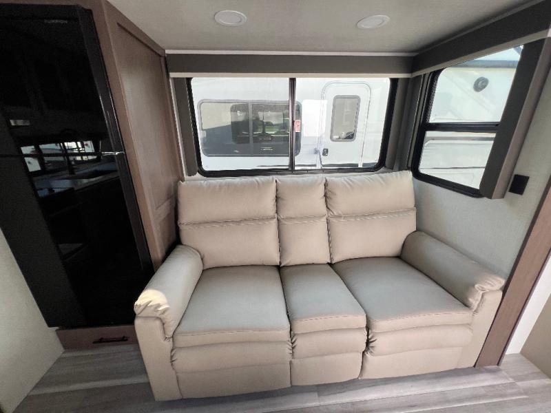 You'll love camping in this rear kitchen fifth wheel that can sleep five to six! Up front, you will enjoy a private bedroom with a king bed and bedside wardrobe/nightstands as well as a wardrobe with washer and dryer prep. A complete bath provides a large shower, toilet and sink, plus linen storage which you are sure to appreciate as you travel. There are plenty of options for this unit making it easy to customize to your use and style. The theater seating and free standing dinette options can be selected in place of the sleeper sofa and booth dinette if you prefer. There is also a 16' awning to create even more living space to enjoy, and the unobstructed pass-through storage compartment can easily house all of your outdoor camping gear like lawn chairs and yard games.