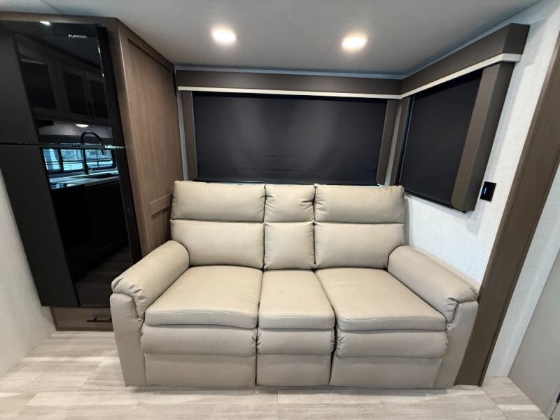 You'll love camping in this rear kitchen fifth wheel that can sleep five to six! Up front, you will enjoy a private bedroom with a king bed and bedside wardrobe/nightstands as well as a wardrobe with washer and dryer prep. A complete bath provides a large shower, toilet and sink, plus linen storage which you are sure to appreciate as you travel. There are plenty of options for this unit making it easy to customize to your use and style. The theater seating and free standing dinette options can be selected in place of the sleeper sofa and booth dinette if you prefer. There is also a 16' awning to create even more living space to enjoy, and the unobstructed pass-through storage compartment can easily house all of your outdoor camping gear like lawn chairs and yard games.