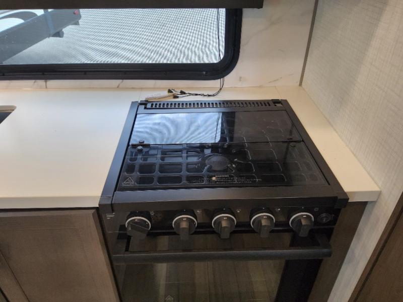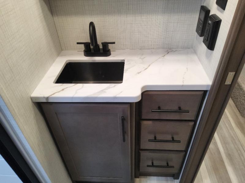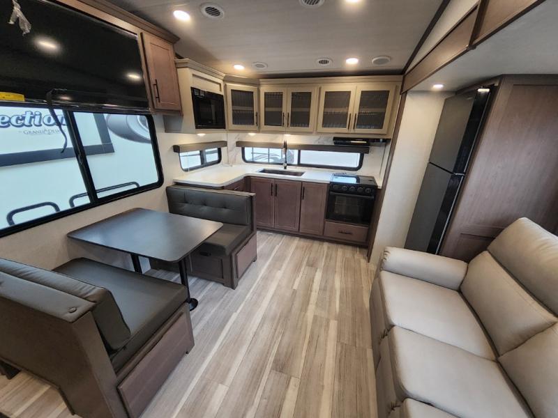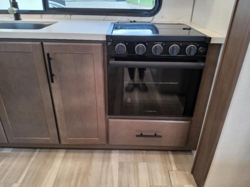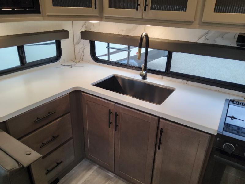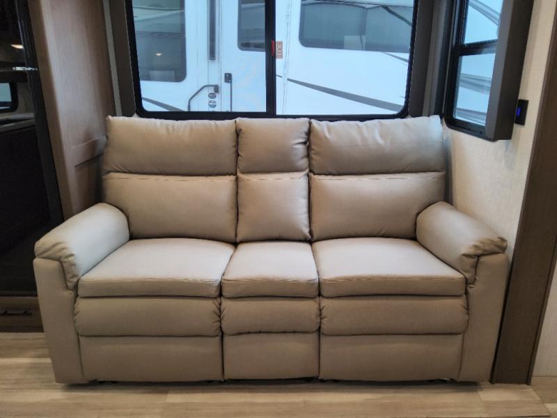 You'll love camping in this rear kitchen fifth wheel that can sleep five to six! Up front, you will enjoy a private bedroom with a king bed and bedside wardrobe/nightstands as well as a wardrobe with washer and dryer prep. A complete bath provides a large shower, toilet and sink, plus linen storage which you are sure to appreciate as you travel. There are plenty of options for this unit making it easy to customize to your use and style. The theater seating and free standing dinette options can be selected in place of the sleeper sofa and booth dinette if you prefer. There is also a 16' awning to create even more living space to enjoy, and the unobstructed pass-through storage compartment can easily house all of your outdoor camping gear like lawn chairs and yard games.