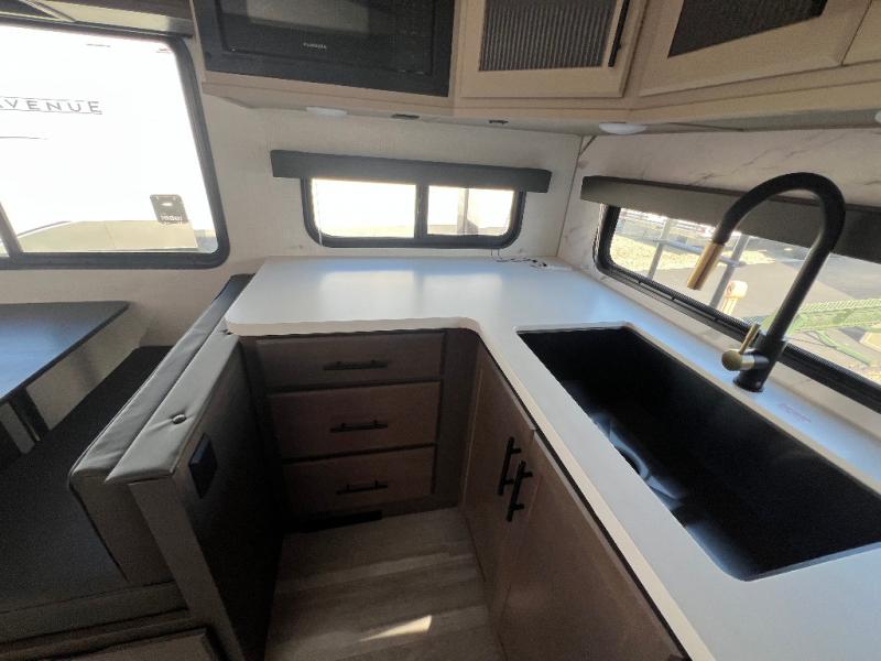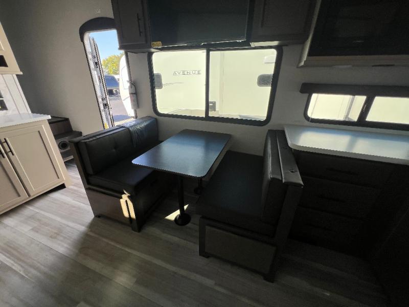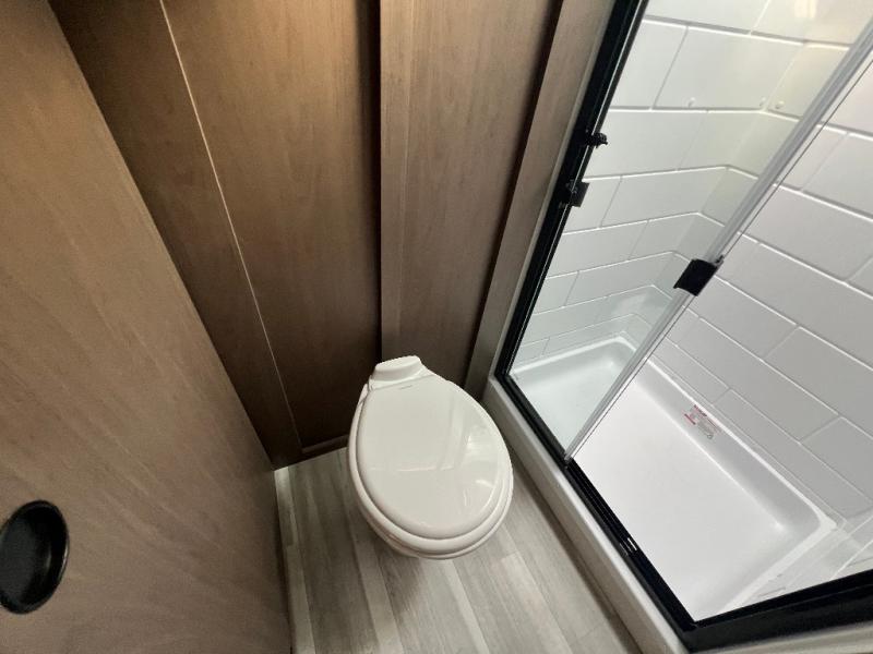 You'll love camping in this rear kitchen fifth wheel that can sleep five to six! Up front, you will enjoy a private bedroom with a king bed and bedside wardrobe/nightstands as well as a wardrobe with washer and dryer prep. A complete bath provides a large shower, toilet and sink, plus linen storage which you are sure to appreciate as you travel. There are plenty of options for this unit making it easy to customize to your use and style. The theater seating and free standing dinette options can be selected in place of the sleeper sofa and booth dinette if you prefer. There is also a 16' awning to create even more living space to enjoy, and the unobstructed pass-through storage compartment can easily house all of your outdoor camping gear like lawn chairs and yard games.