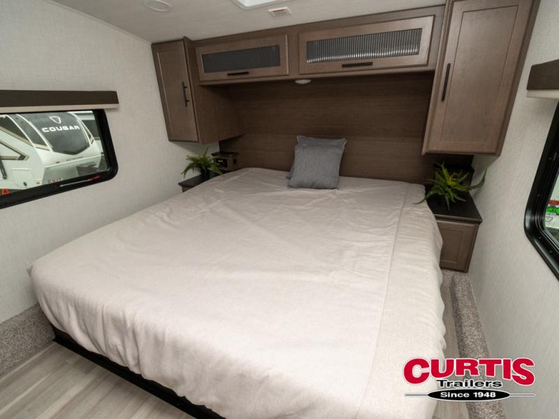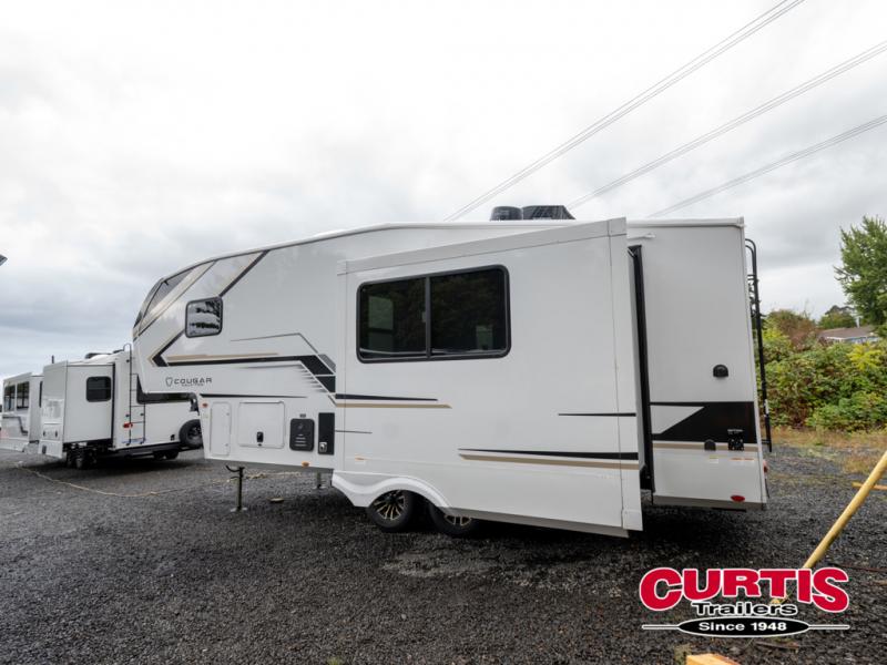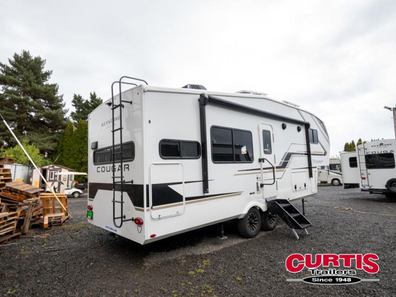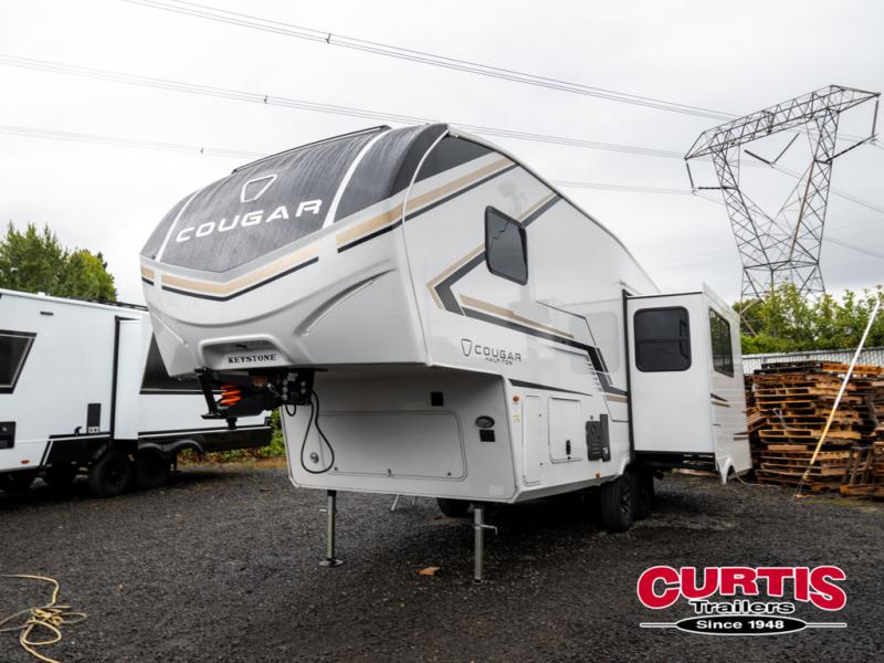 The Keystone Cougar Half-Ton fifth wheel and travel trailers are known as one of America's favorites for a reason! Some of those reasons are the exclusive features that come from Keystone, like the Winegard Air 360+ omni-directional rooftop antenna, the in-floor heating ducts, and the HyperCore composite wall construction with Vixen Fibrogloss high-gloss finish. The Cougar Half-Ton has a Climate Guard protection package with heat-deflecting white sidewalls, two roof attic vents, PEX plumbing and more to enjoy four season camping. Inside, you'll love the dimmable lighting, night roller shades throughout, shower skylight, and bedside USB outlets to keep your electronics charged.