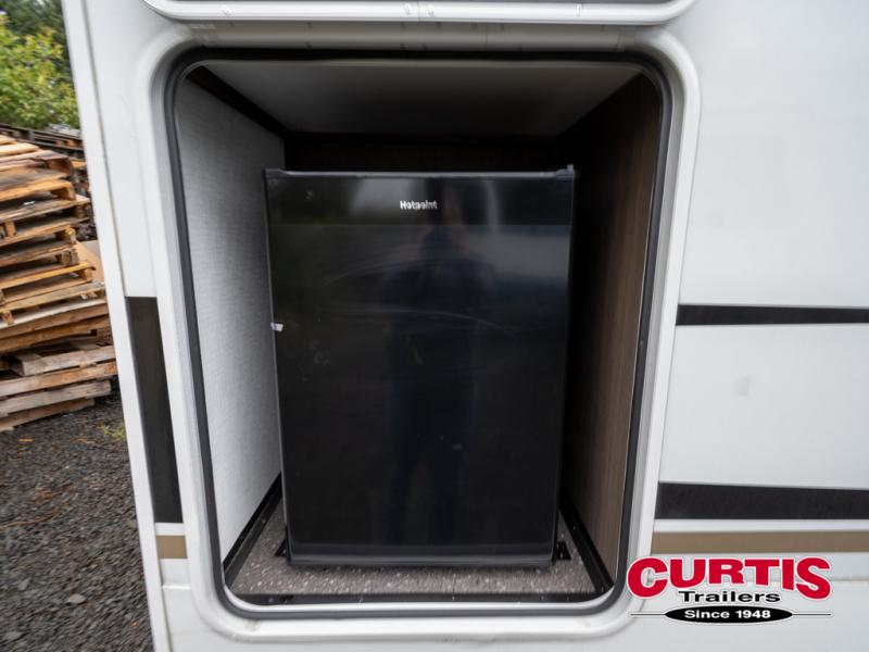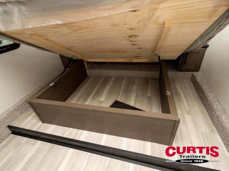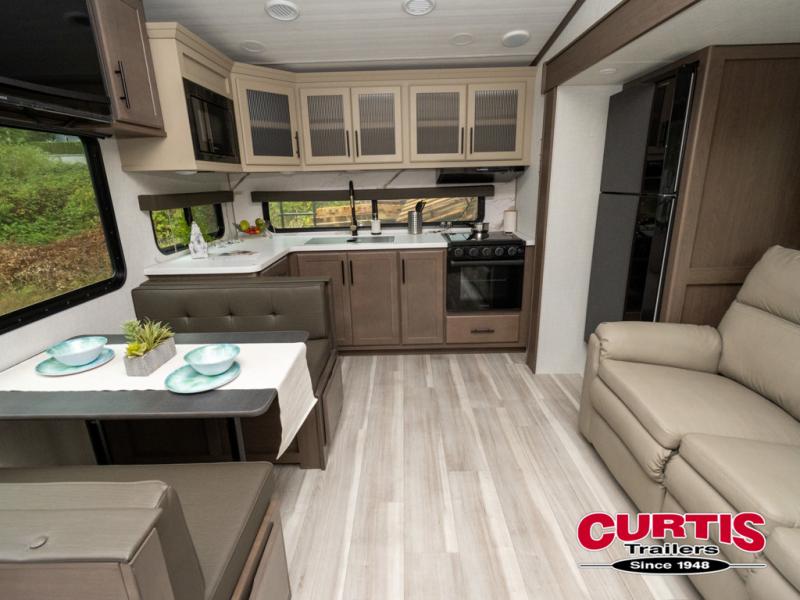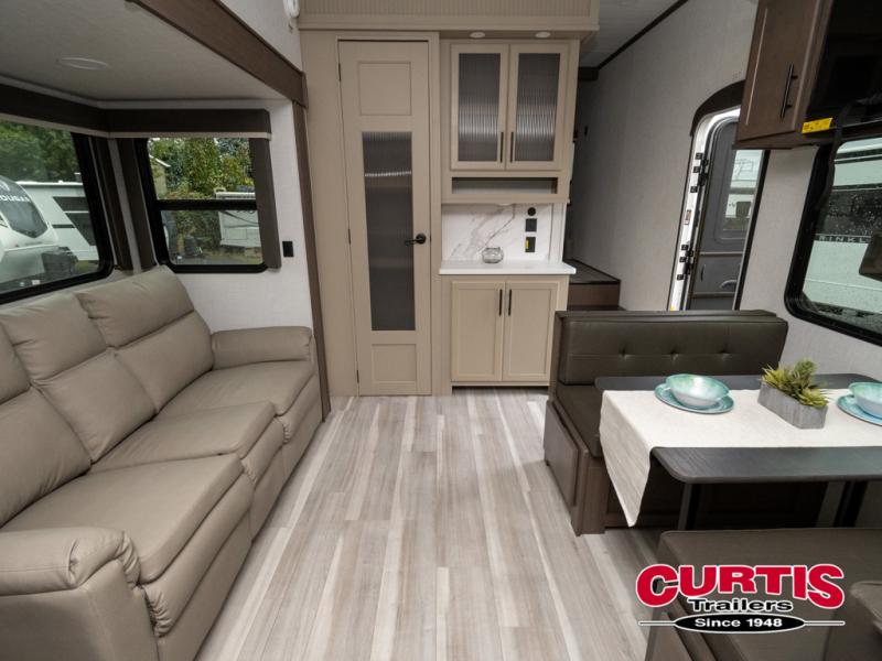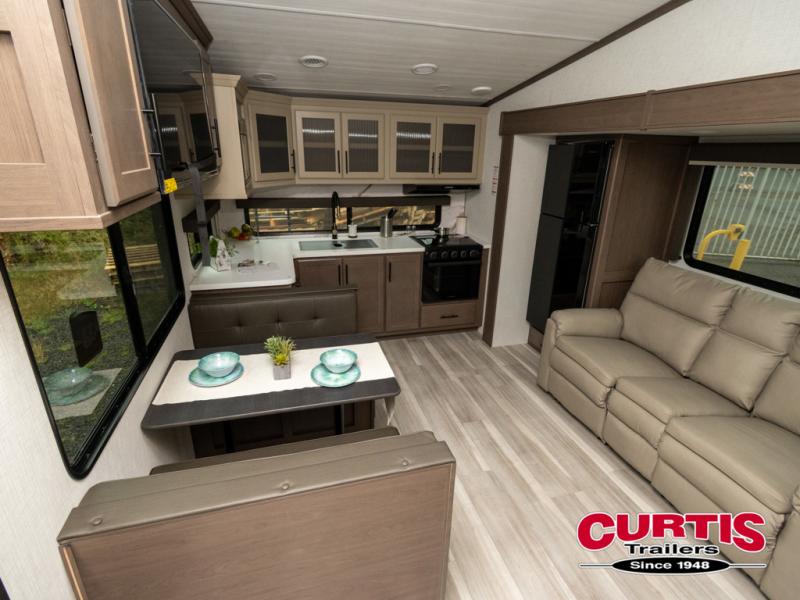 You'll love camping in this rear kitchen fifth wheel that can sleep five to six! Up front, you will enjoy a private bedroom with a king bed and bedside wardrobe/nightstands as well as a wardrobe with washer and dryer prep. A complete bath provides a large shower, toilet and sink, plus linen storage which you are sure to appreciate as you travel. There are plenty of options for this unit making it easy to customize to your use and style. The theater seating and free standing dinette options can be selected in place of the sleeper sofa and booth dinette if you prefer. There is also a 16' awning to create even more living space to enjoy, and the unobstructed pass-through storage compartment can easily house all of your outdoor camping gear like lawn chairs and yard games.