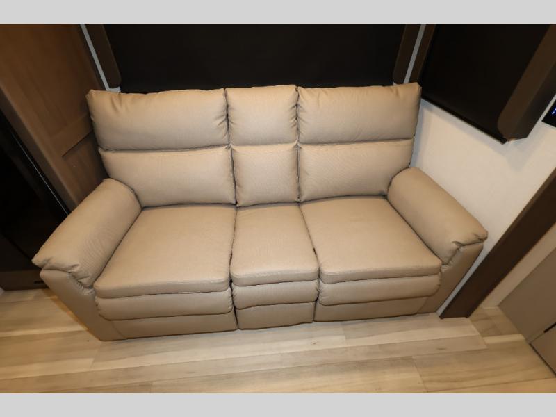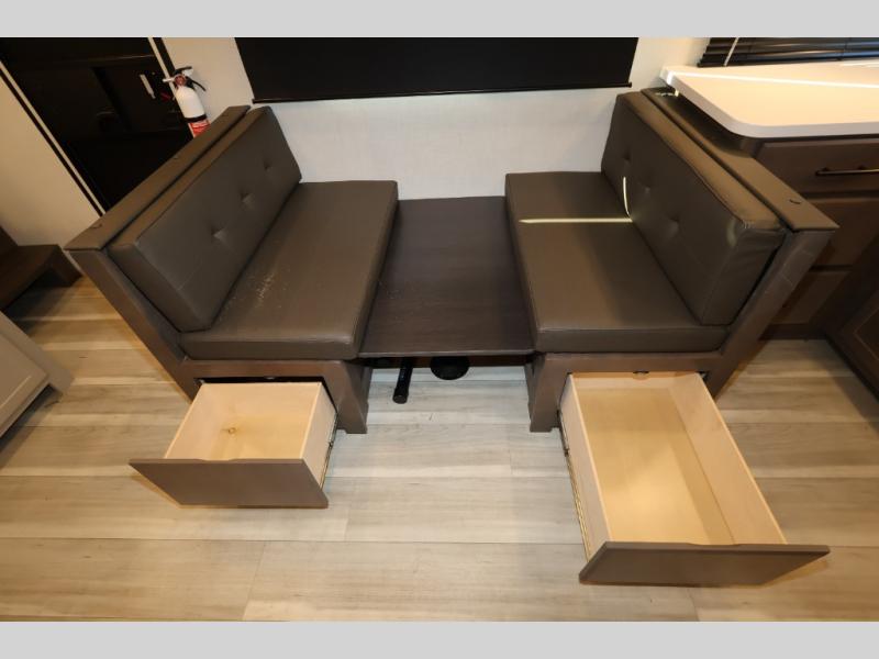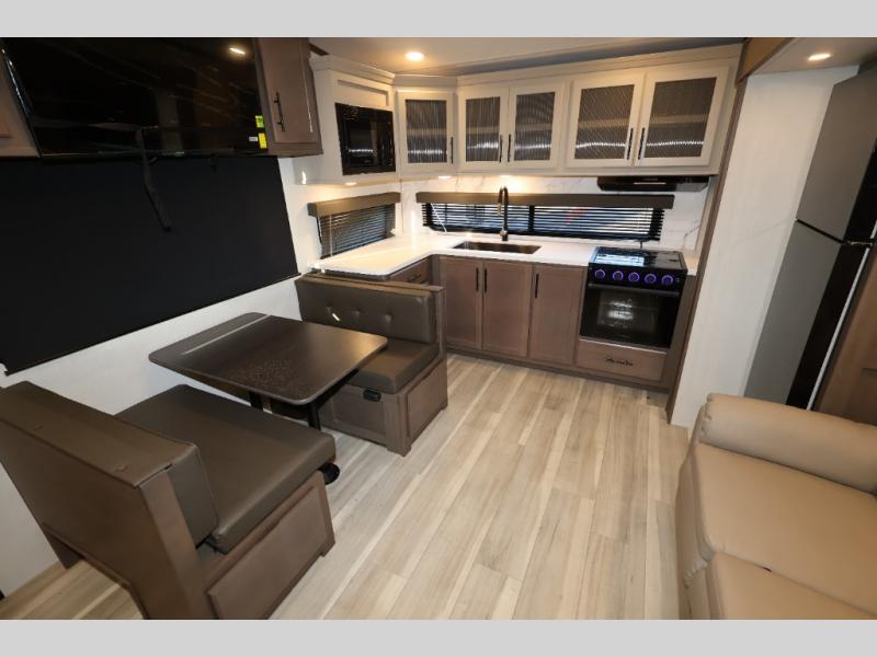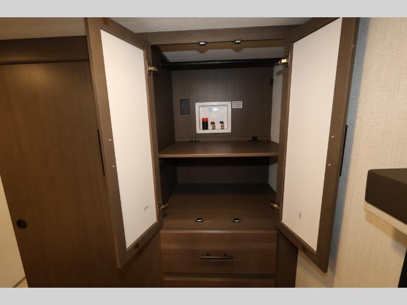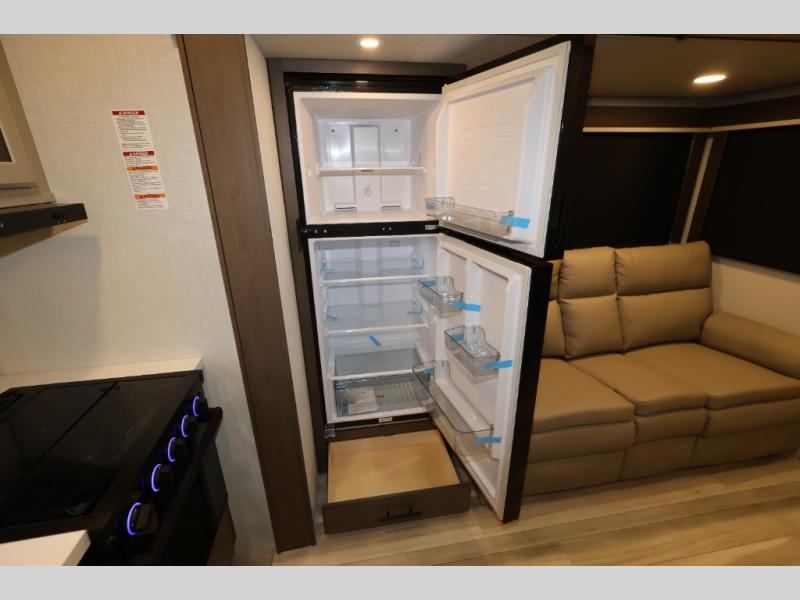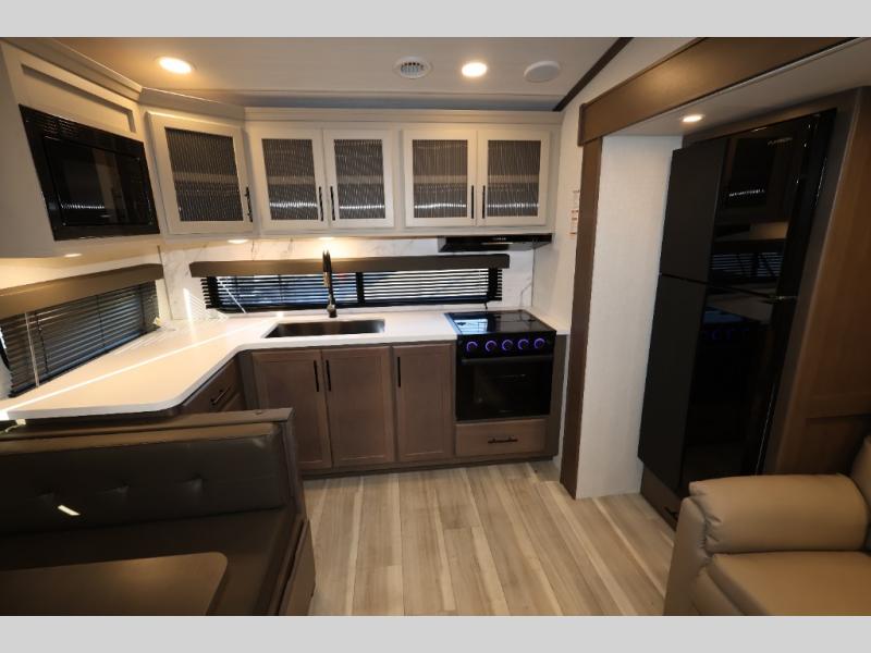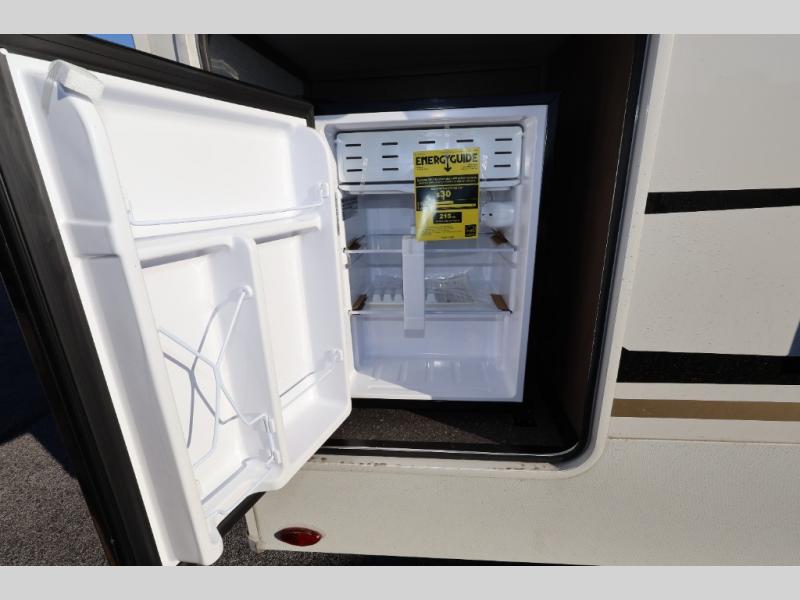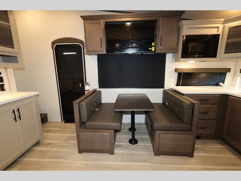 You'll love camping in this rear kitchen fifth wheel that can sleep five to six! Up front, you will enjoy a private bedroom with a king bed and bedside wardrobe/nightstands as well as a wardrobe with washer and dryer prep. A complete bath provides a large shower, toilet and sink, plus linen storage which you are sure to appreciate as you travel. There are plenty of options for this unit making it easy to customize to your use and style. The theater seating and free standing dinette options can be selected in place of the sleeper sofa and booth dinette if you prefer. There is also a 16' awning to create even more living space to enjoy, and the unobstructed pass-through storage compartment can easily house all of your outdoor camping gear like lawn chairs and yard games.