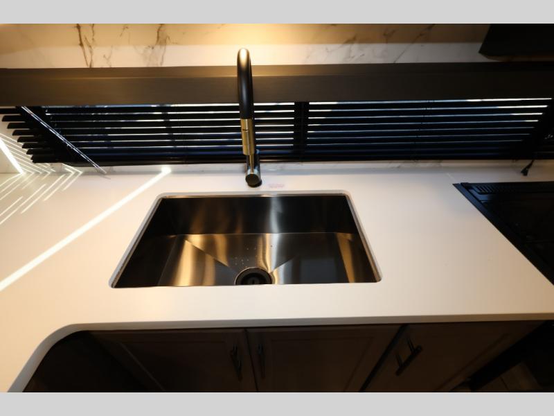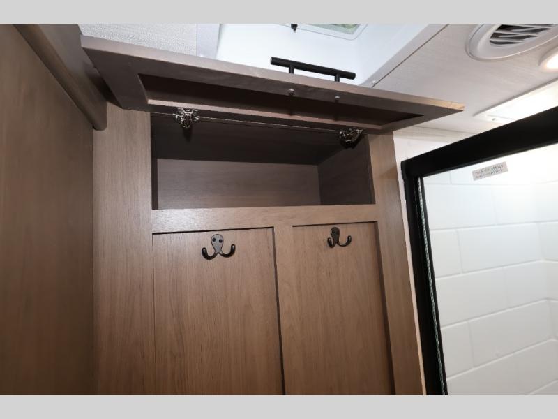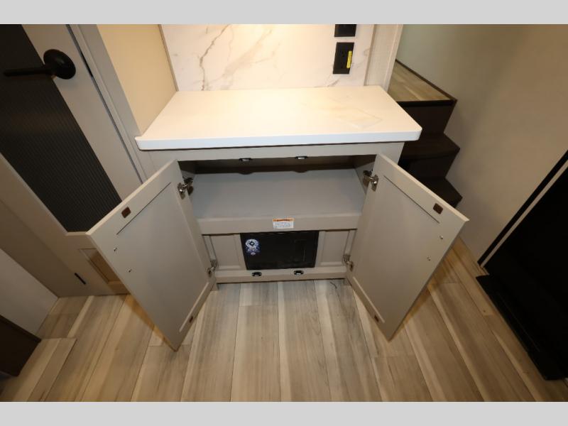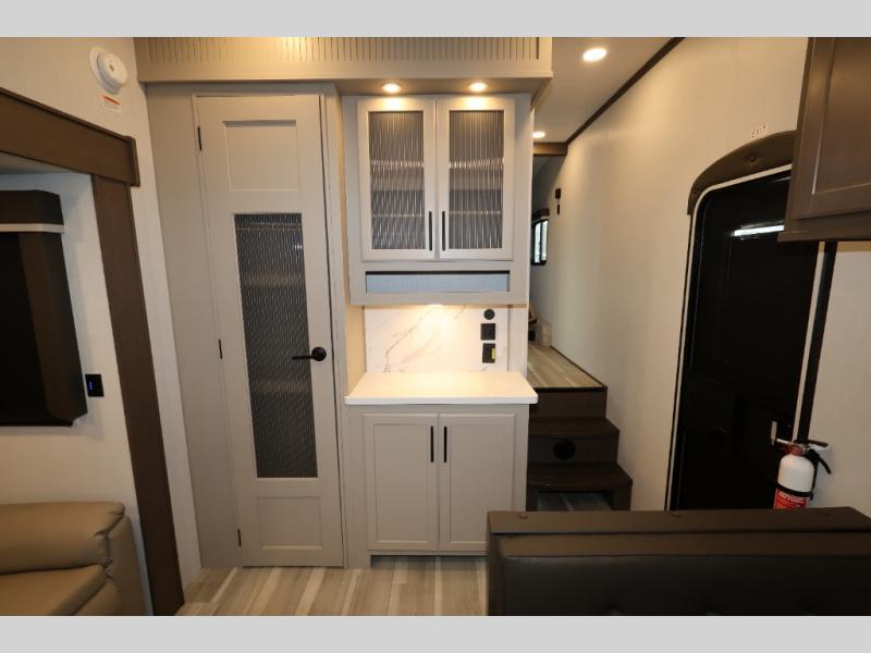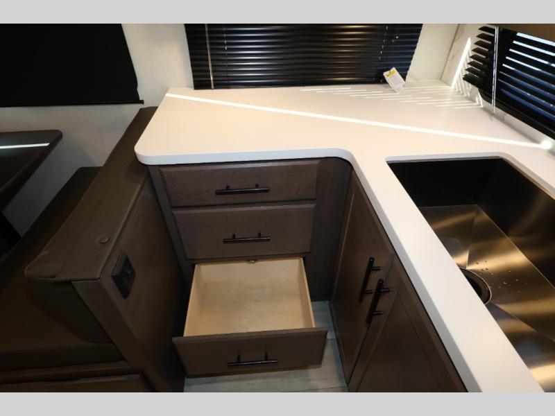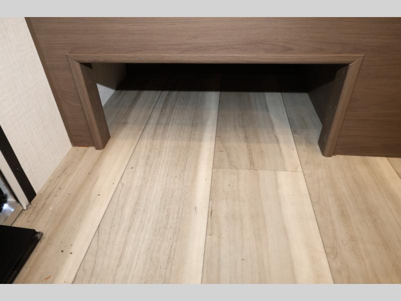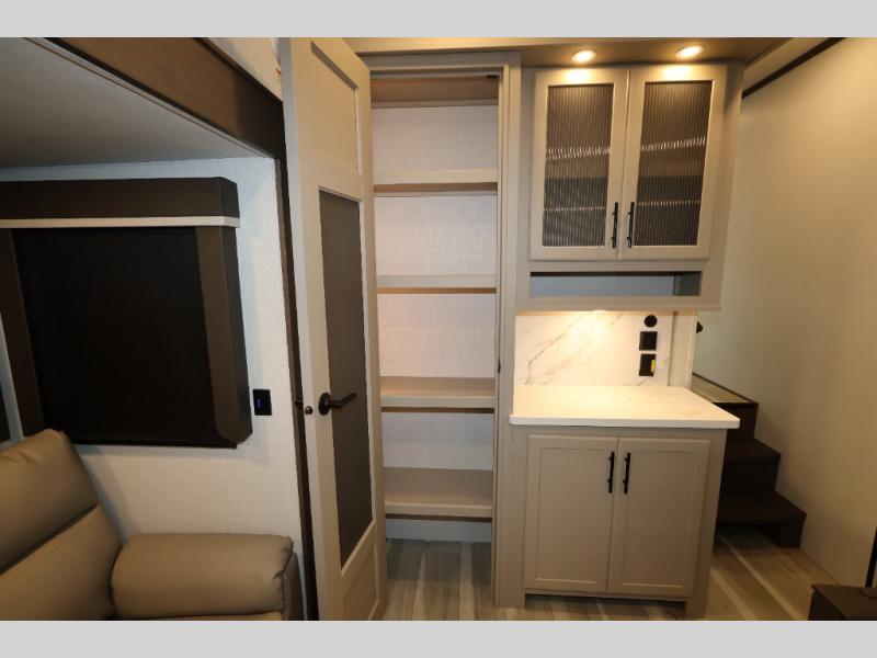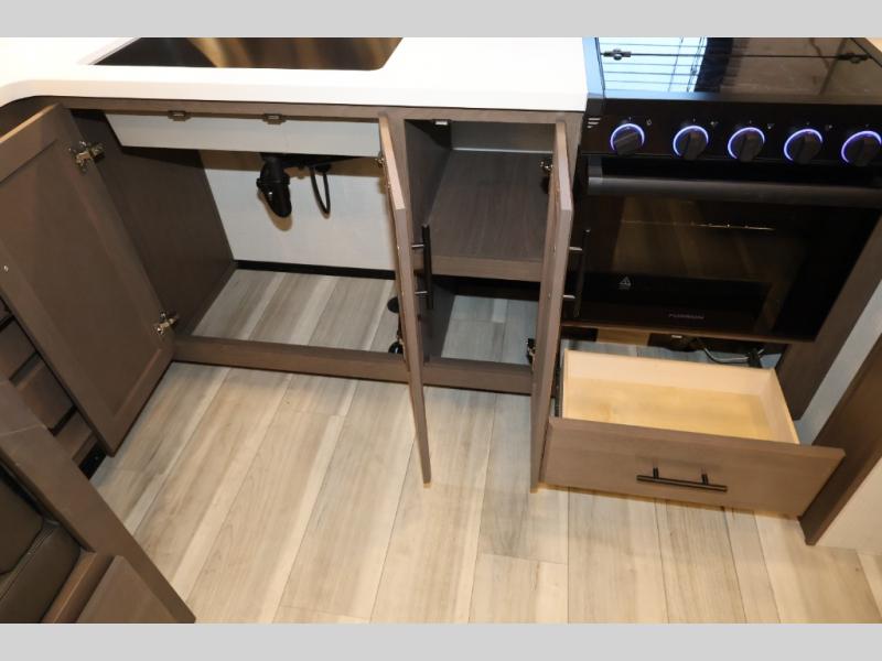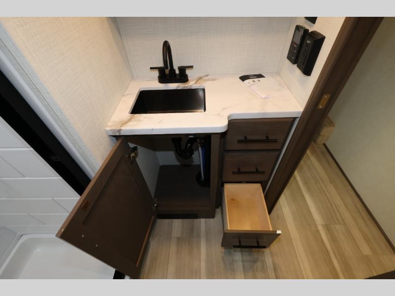 You'll love camping in this rear kitchen fifth wheel that can sleep five to six! Up front, you will enjoy a private bedroom with a king bed and bedside wardrobe/nightstands as well as a wardrobe with washer and dryer prep. A complete bath provides a large shower, toilet and sink, plus linen storage which you are sure to appreciate as you travel. There are plenty of options for this unit making it easy to customize to your use and style. The theater seating and free standing dinette options can be selected in place of the sleeper sofa and booth dinette if you prefer. There is also a 16' awning to create even more living space to enjoy, and the unobstructed pass-through storage compartment can easily house all of your outdoor camping gear like lawn chairs and yard games.