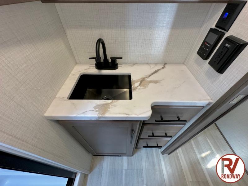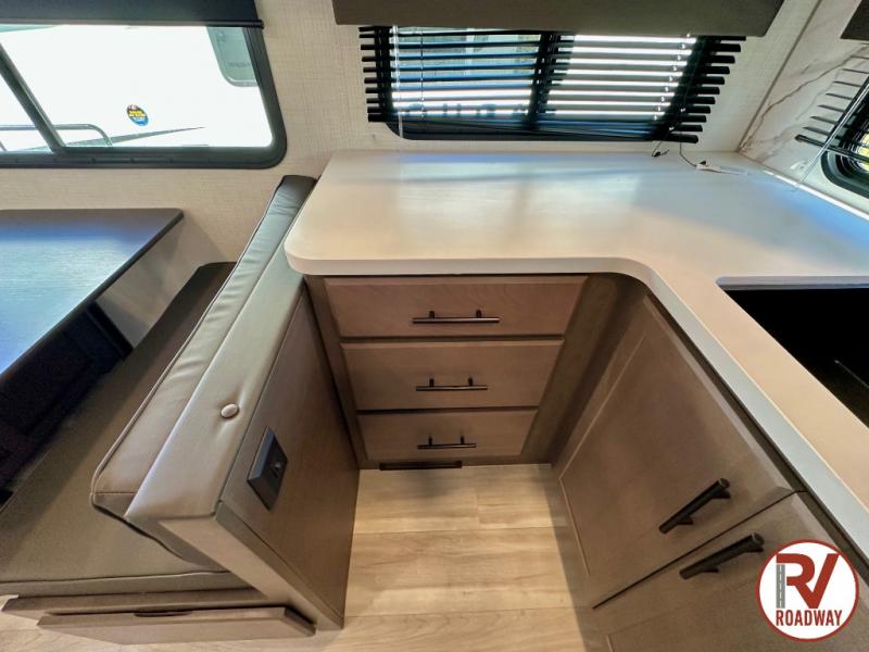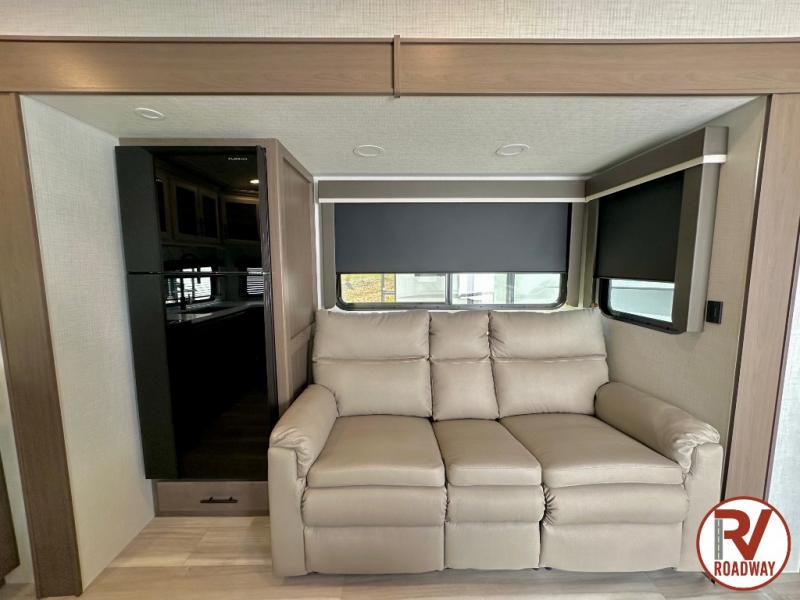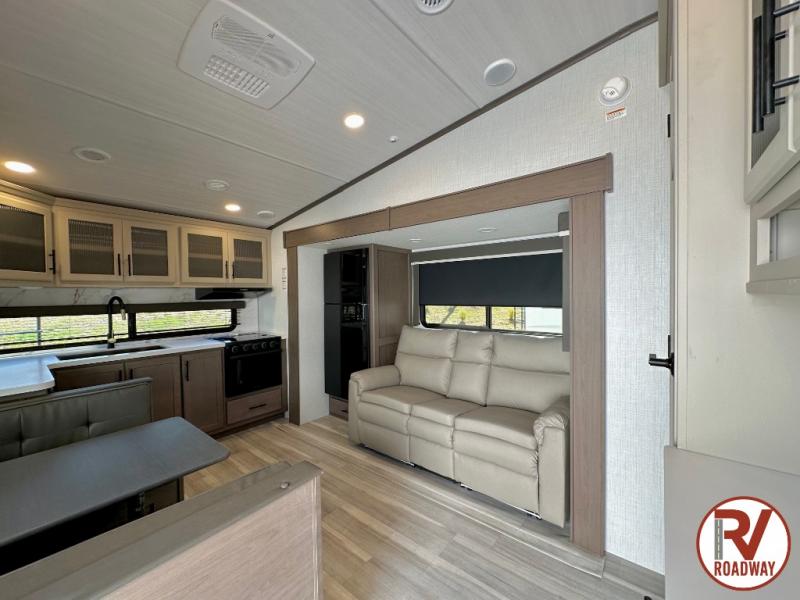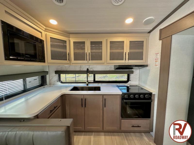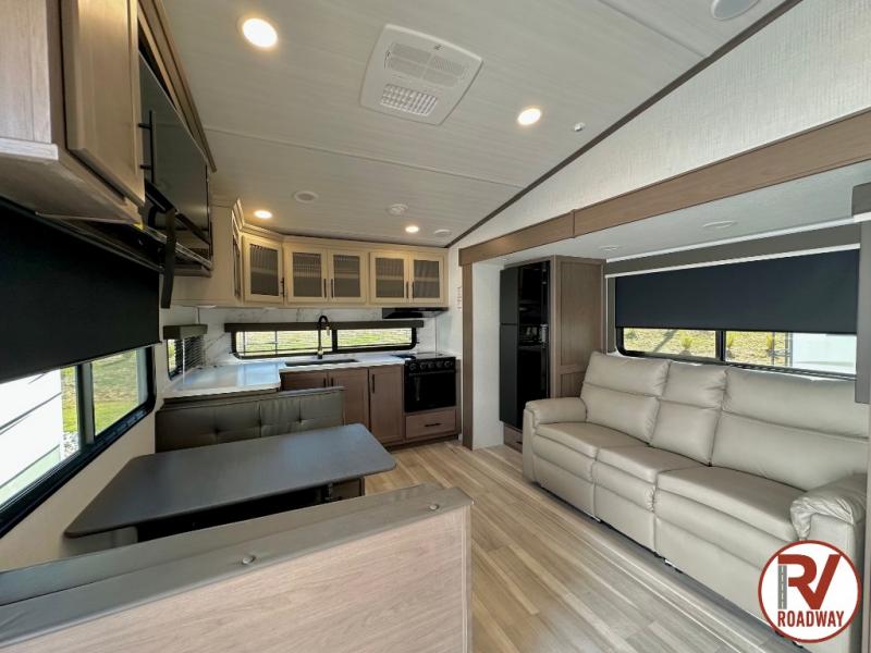 You'll love camping in this rear kitchen fifth wheel that can sleep five to six! Up front, you will enjoy a private bedroom with a king bed and bedside wardrobe/nightstands as well as a wardrobe with washer and dryer prep. A complete bath provides a large shower, toilet and sink, plus linen storage which you are sure to appreciate as you travel. There are plenty of options for this unit making it easy to customize to your use and style. The theater seating and free standing dinette options can be selected in place of the sleeper sofa and booth dinette if you prefer. There is also a 16' awning to create even more living space to enjoy, and the unobstructed pass-through storage compartment can easily house all of your outdoor camping gear like lawn chairs and yard games.