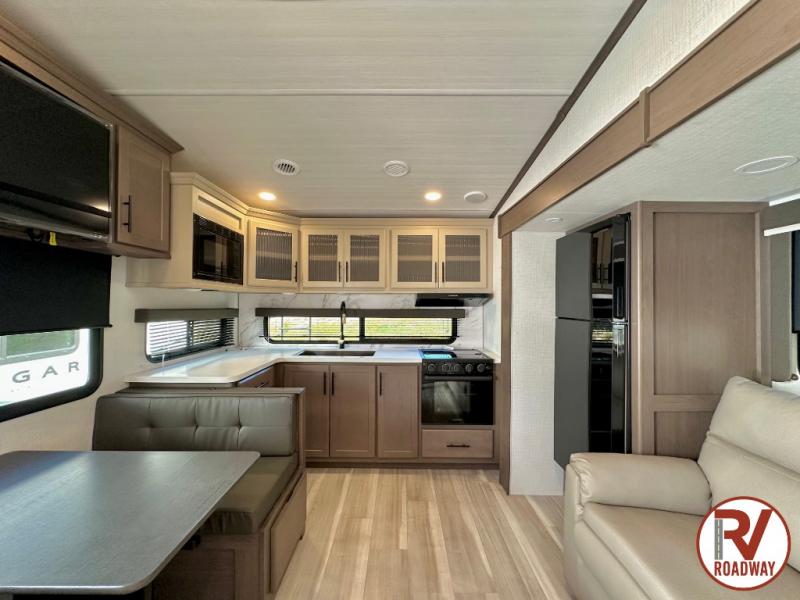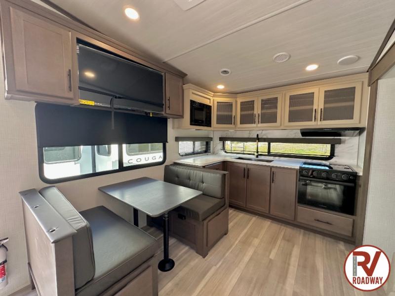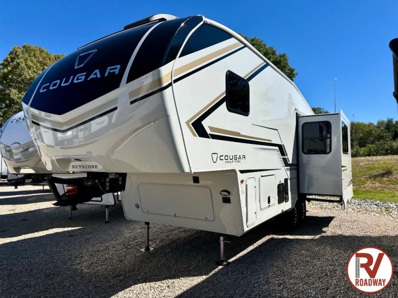 The Keystone Cougar Half-Ton fifth wheel and travel trailers are known as one of America's favorites for a reason! Some of those reasons are the exclusive features that come from Keystone, like the Winegard Air 360+ omni-directional rooftop antenna, the in-floor heating ducts, and the HyperCore composite wall construction with Vixen Fibrogloss high-gloss finish. The Cougar Half-Ton has a Climate Guard protection package with heat-deflecting white sidewalls, two roof attic vents, PEX plumbing and more to enjoy four season camping. Inside, you'll love the dimmable lighting, night roller shades throughout, shower skylight, and bedside USB outlets to keep your electronics charged.