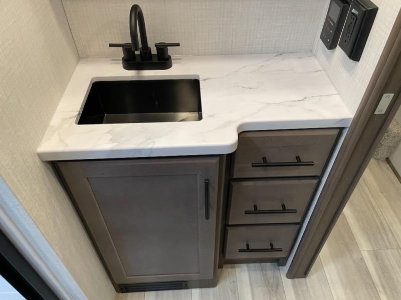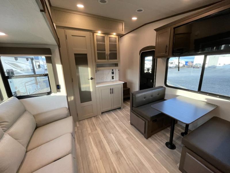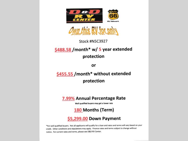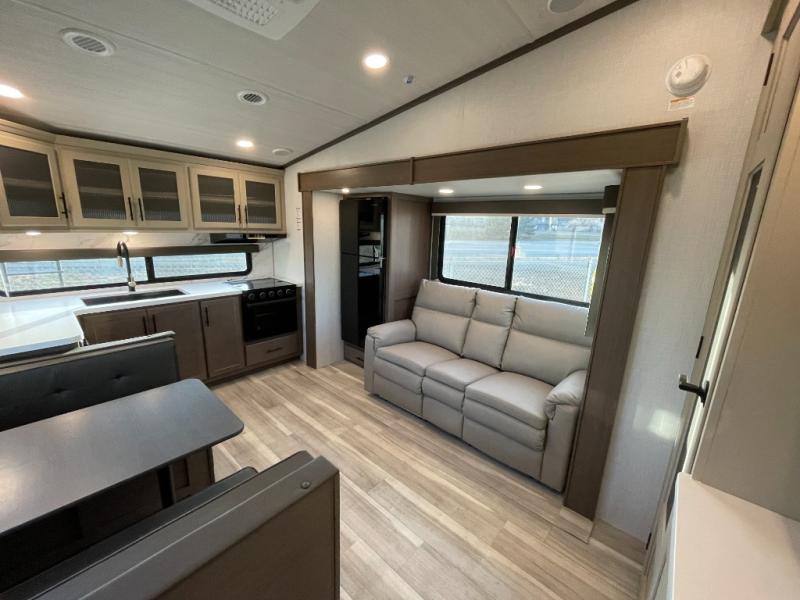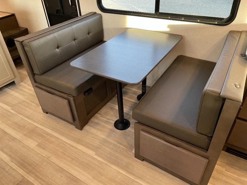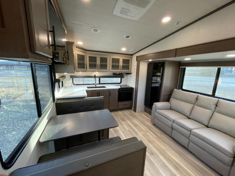 You'll love camping in this rear kitchen fifth wheel that can sleep five to six! Up front, you will enjoy a private bedroom with a king bed and bedside wardrobe/nightstands as well as a wardrobe with washer and dryer prep. A complete bath provides a large shower, toilet and sink, plus linen storage which you are sure to appreciate as you travel. There are plenty of options for this unit making it easy to customize to your use and style. The theater seating and free standing dinette options can be selected in place of the sleeper sofa and booth dinette if you prefer. There is also a 16' awning to create even more living space to enjoy, and the unobstructed pass-through storage compartment can easily house all of your outdoor camping gear like lawn chairs and yard games.