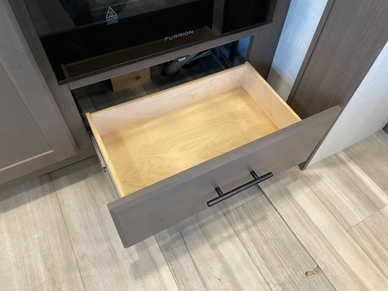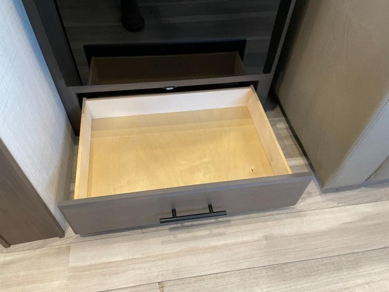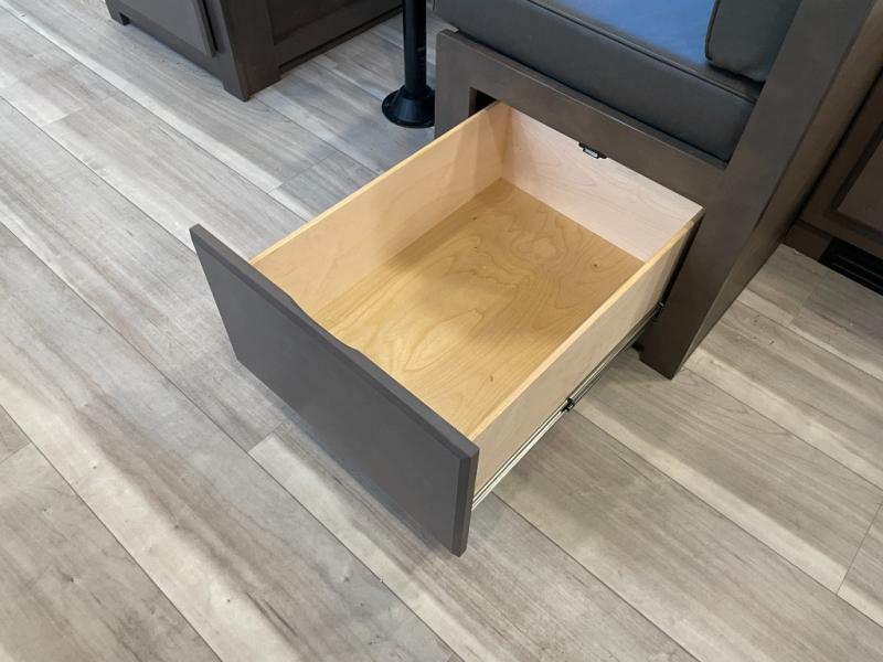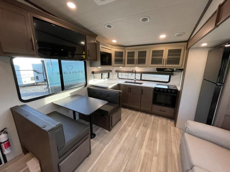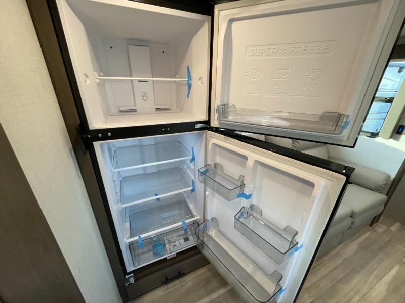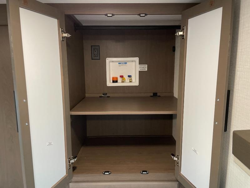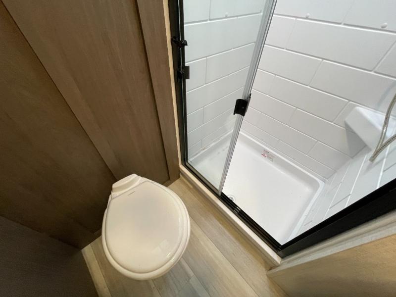 You'll love camping in this rear kitchen fifth wheel that can sleep five to six! Up front, you will enjoy a private bedroom with a king bed and bedside wardrobe/nightstands as well as a wardrobe with washer and dryer prep. A complete bath provides a large shower, toilet and sink, plus linen storage which you are sure to appreciate as you travel. There are plenty of options for this unit making it easy to customize to your use and style. The theater seating and free standing dinette options can be selected in place of the sleeper sofa and booth dinette if you prefer. There is also a 16' awning to create even more living space to enjoy, and the unobstructed pass-through storage compartment can easily house all of your outdoor camping gear like lawn chairs and yard games.