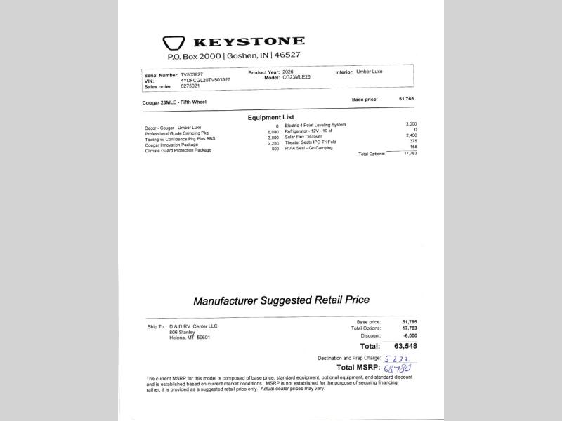 New 2026 Keystone RV Cougar Half-Ton 23MLE Fifth Wheel